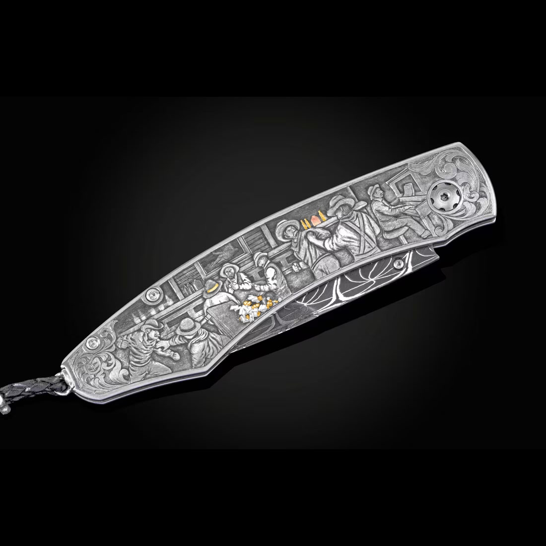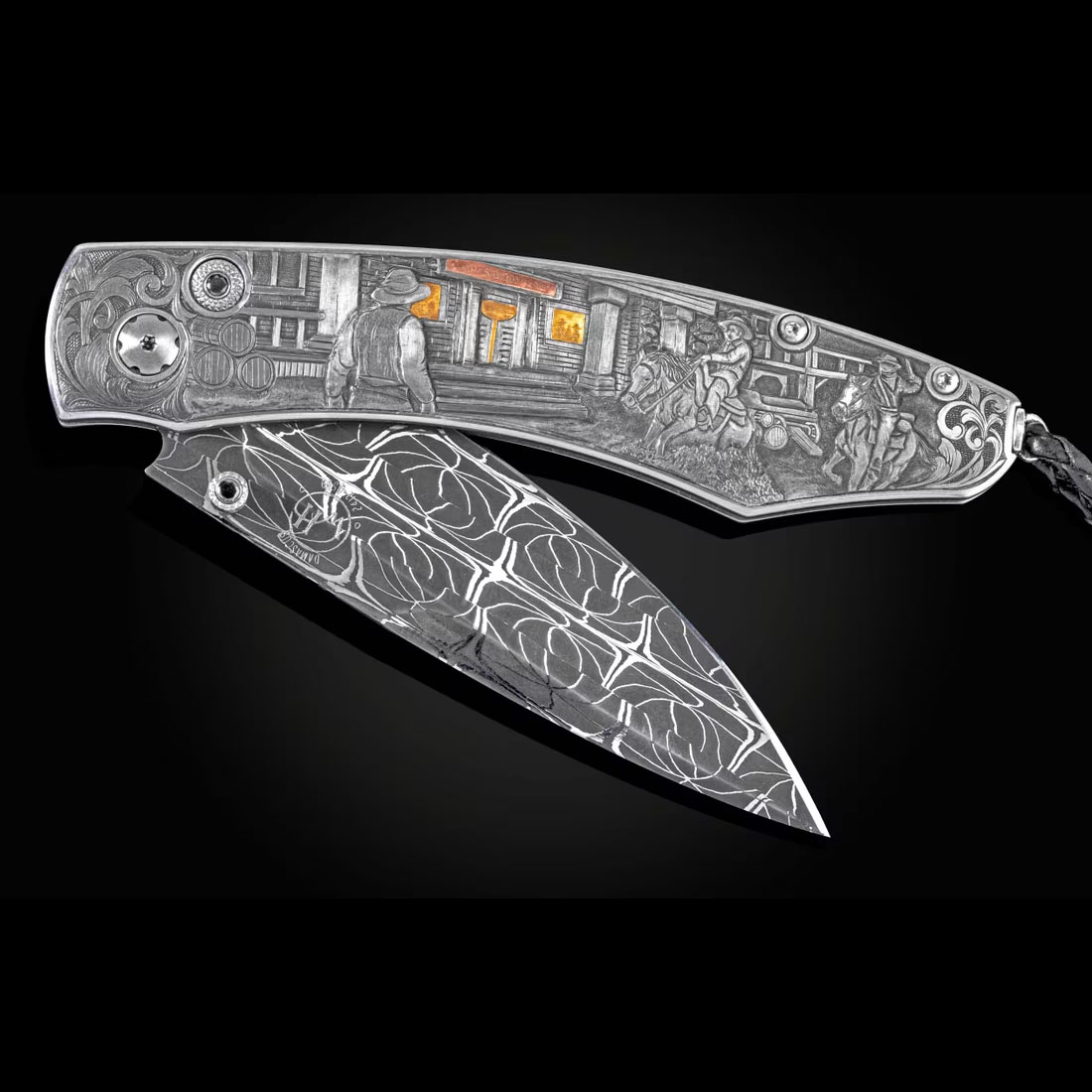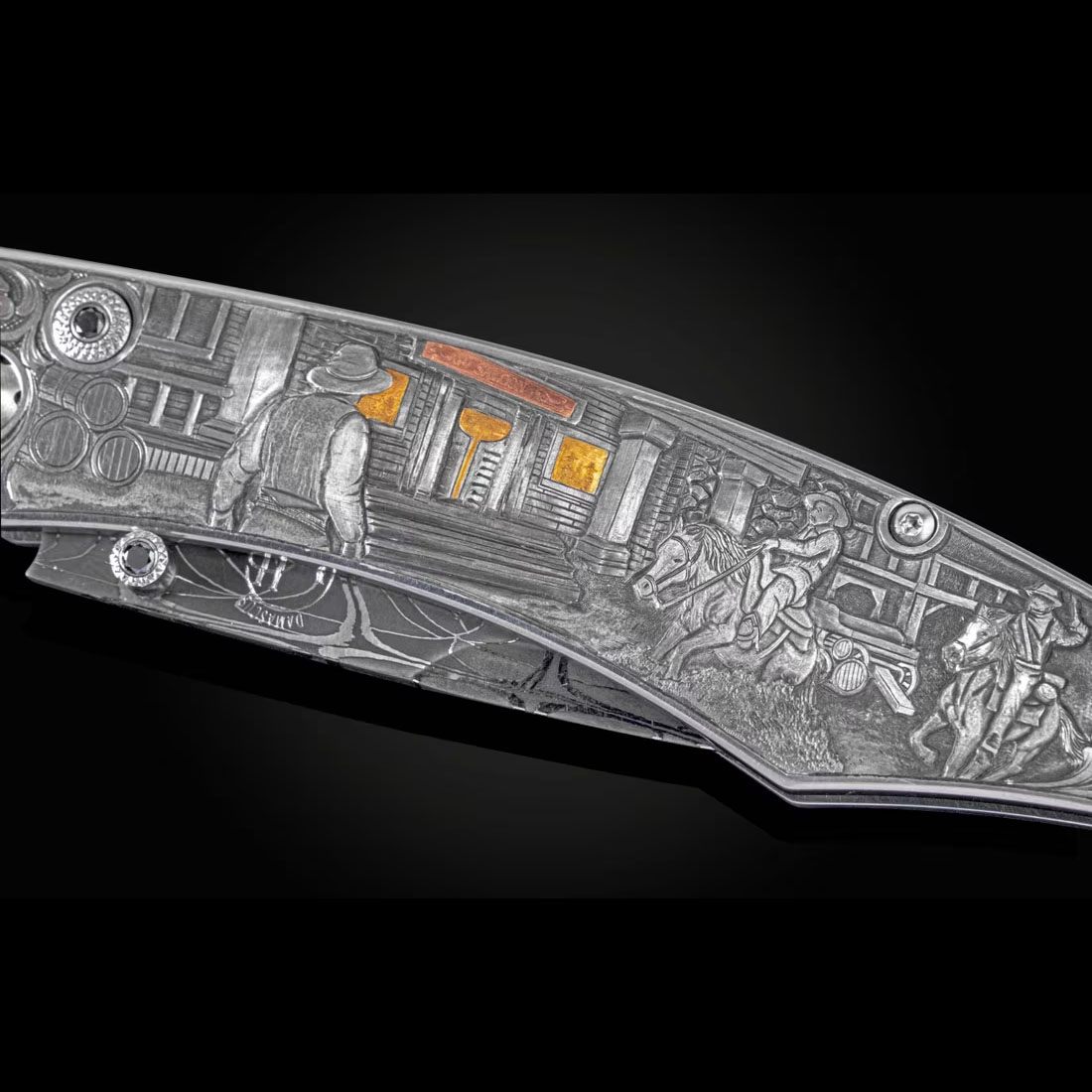 Spearpoint“Western Town II”采用不锈钢刀架,由Lee Griffiths手工雕刻,并镶嵌铜、银和24K金。精美的手工锻造刀刃采用Robert Eggerling蚀刻的“风车”大马士革钢;单手按钮锁和拇指螺柱镶嵌有黑钻。
