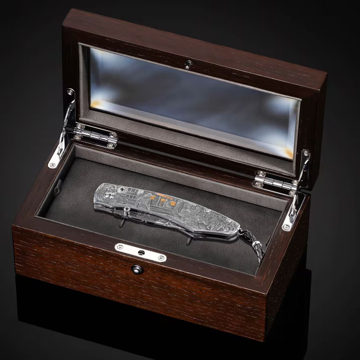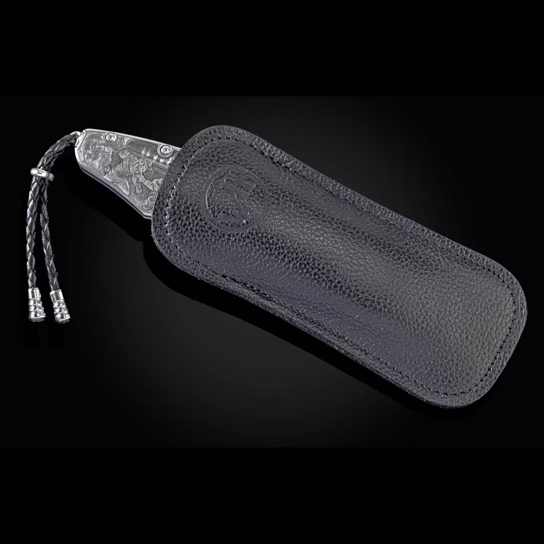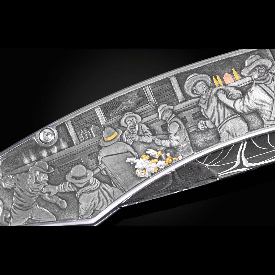 Spearpoint“Western Town II”采用不锈钢刀架,由Lee Griffiths手工雕刻,并镶嵌铜、银和24K金。精美的手工锻造刀刃采用Robert Eggerling蚀刻的“风车”大马士革钢;单手按钮锁和拇指螺柱镶嵌有黑钻。