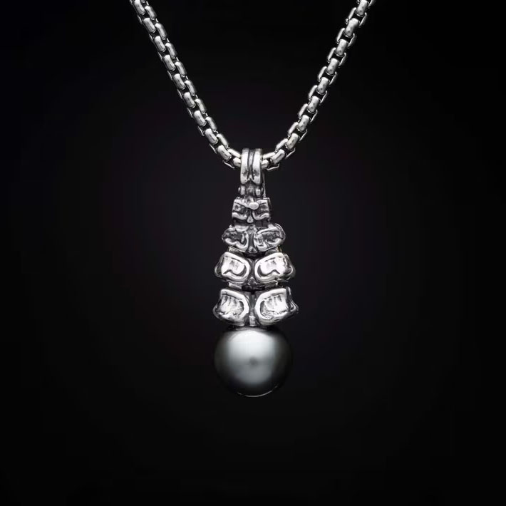 产品详情 响尾蛇吊坠 (Rattler) 是一款引人注目的吊坠,其灵感源自响尾蛇尾巴的雕刻纯银底座,连接着一颗美丽的南洋珍珠,隐形镶嵌,营造出色彩、纹理和形状的浑然一体、意想不到的和谐统一。吊坠搭配一条精致的...