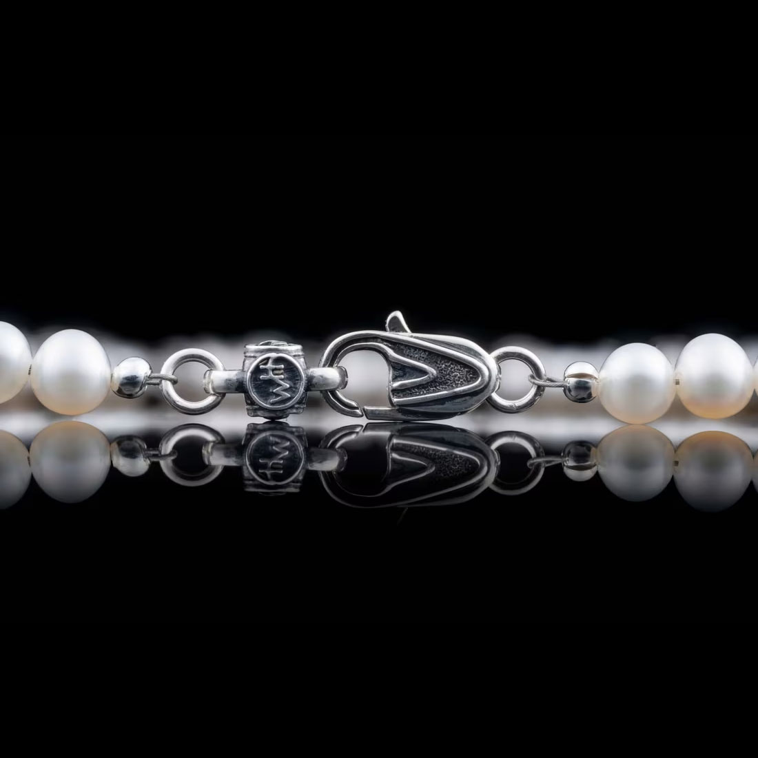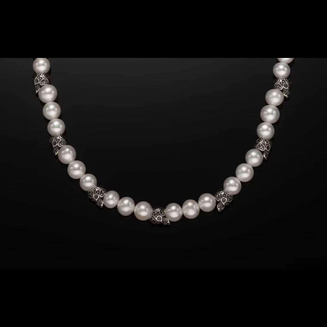 一抹阳光,一抹摇滚,完美融合。波塞冬项链采用我们以纯银雕刻的骷髅珠,串缀一整串优质淡水珍珠。这款项链采用涂层不锈钢线制成,并配有我们定制的纯银扣环,可轻松搭配衬衫、正装衬衫、皮夹克或西装外套。
