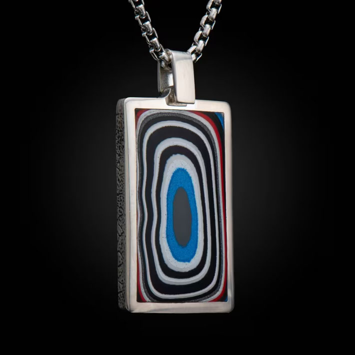 产品详情 这款惊艳的作品以福特石(又名“汽车城玛瑙”)鳞片精心镶嵌于雕刻的纯银狗牌上,并经手工抛光,呈现浑然一体的质感。背面留有空间,可镌刻个人箴言、留言、日期,或任何能成就您故事的内容。搭配纯银链...