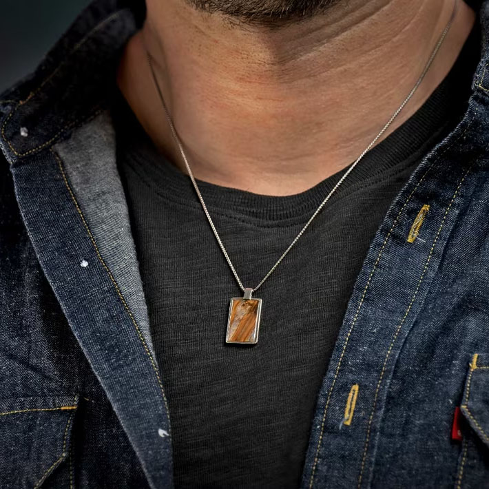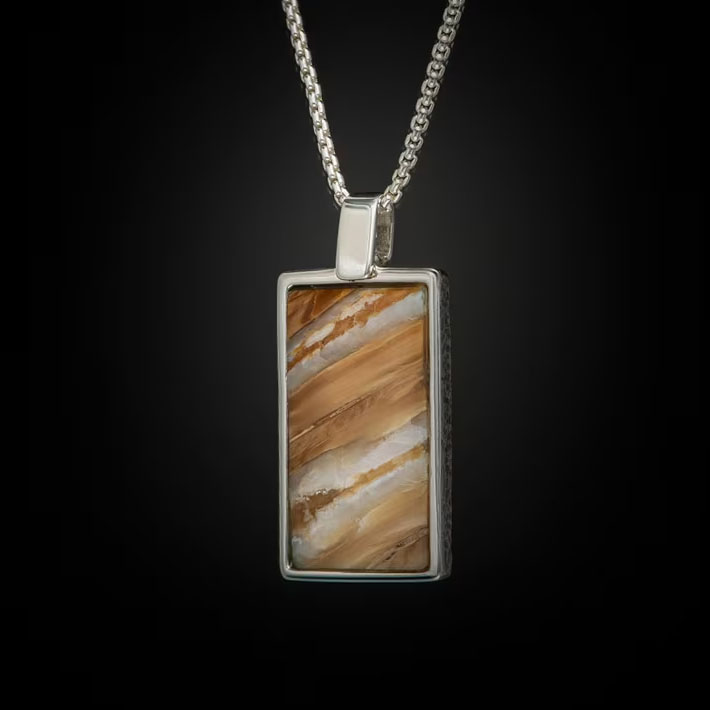 低调简约往往最能表达心声——“猛犸象变身”系列讲述了一个非凡的故事。这款迷你狗牌以纯银镶嵌,饰有一颗6000多年前的猛犸象牙齿化石,背面饰有缎面雕刻图案。搭配纯银链条。它本身优雅别致,与其他饰品搭配,更能与任何造型相得益彰。