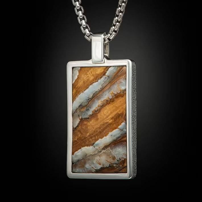 产品详情 威廉·亨利对经典的演绎。“猛犸象巅峰”以稀有的长毛猛犸象牙齿化石为特色,可追溯至6000至10000年前,镶嵌于纯银之上。背面饰有精致的细节和缎面雕刻面板。搭配纯银链条。无论单独佩戴还是叠戴,这款狗...