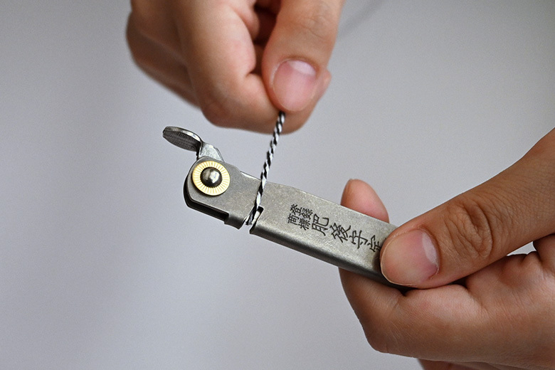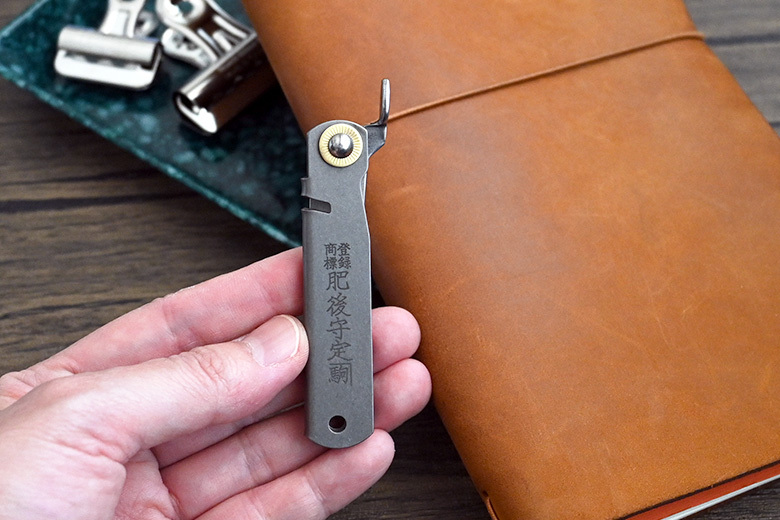 钛合金刀柄有另一个贴心小设计,刀柄在靠近转轴的地方有一个小缺口,这个设计可以在不打开刀子的情况下用来割断绳子。此外,这款小刀的刀刃也是肥后守新推出的尺寸,刀刃比豆长一点、但比小号的肥后守短一点、兼顾了携带性与实用性。