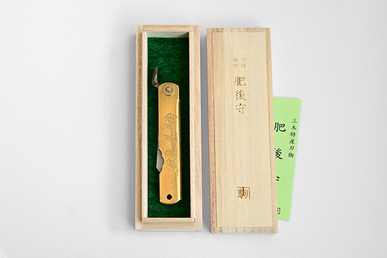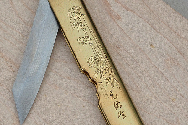 积层钢竹虎的黄铜刀鞘刻上了竹林以及老虎图案,刀鞘同样有第四代传人的落款(日后会改为第五代)。在肥后守系列当中的高阶款式都搭配黄铜刀鞘,积层钢竹虎也是如此,并且还附上一个桐木盒可供收藏。桐木虽然不是名贵的木材,但拥有非常低的变形率以及调节湿气的能力,因此日本传统衣柜职人选用桐木作为衣柜材料,单个衣柜的售价甚至超过百万日圆,同样以桐木制作的盒子,用来收纳积层钢竹虎再适合不过了。