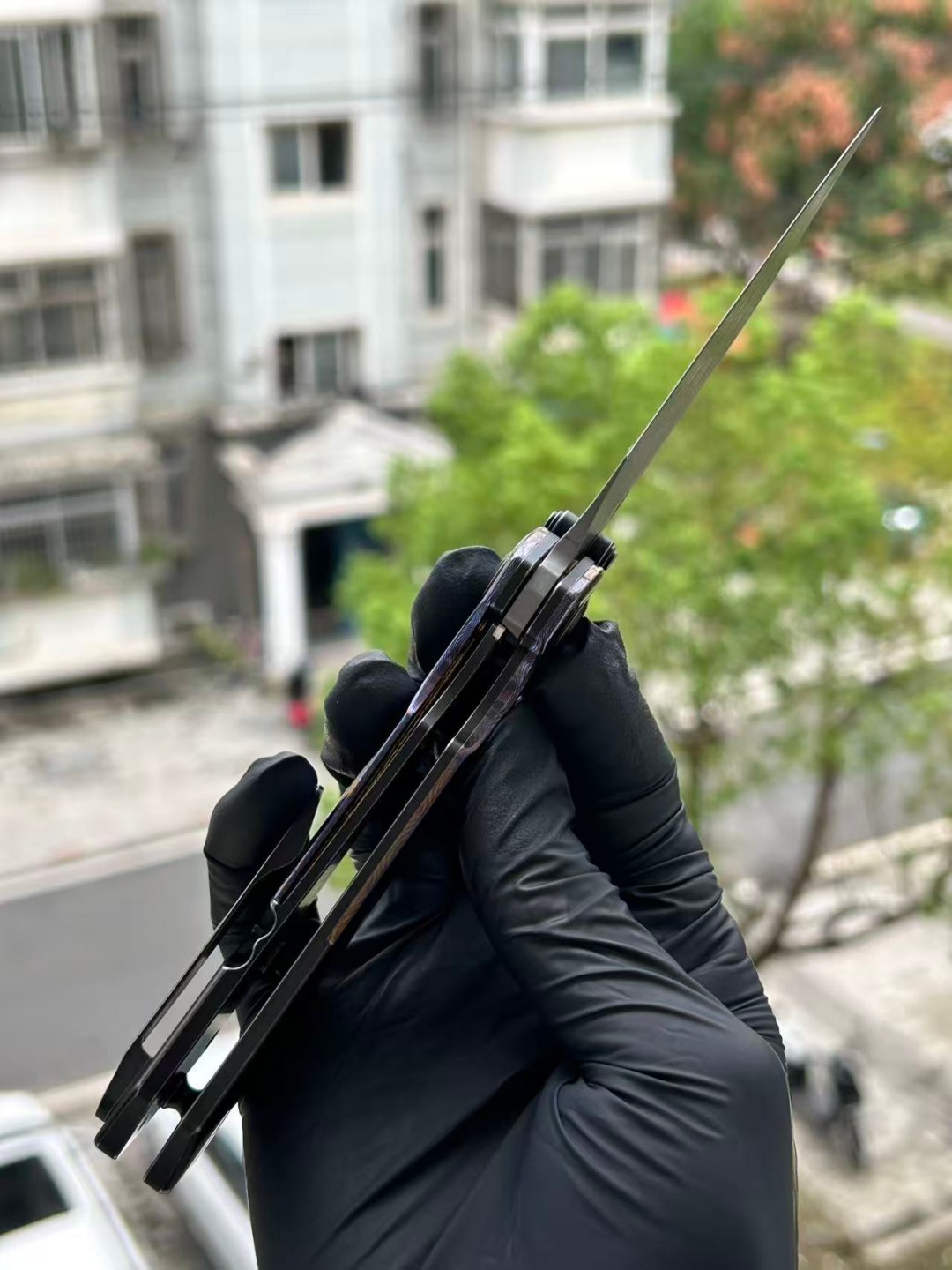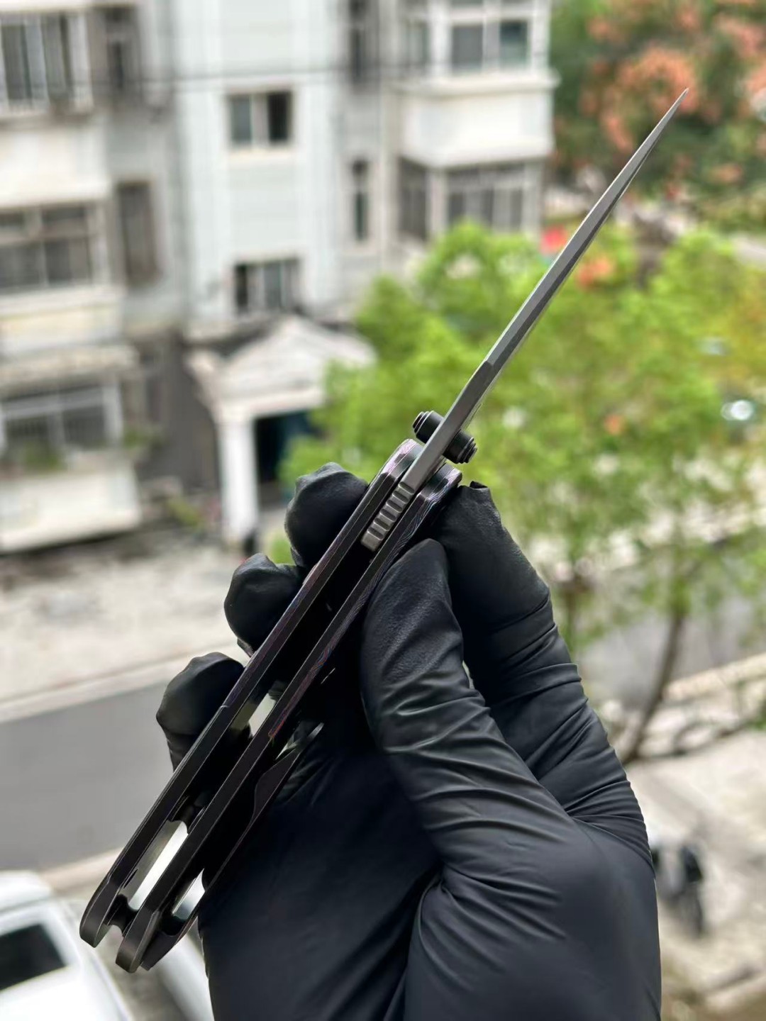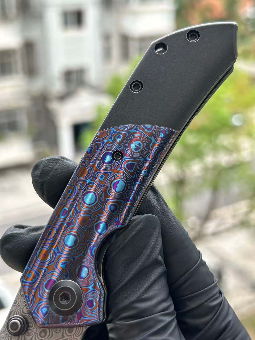 这款刀采用黑色石洗钛金属框架,搭配蒂马斯库斯镶嵌,打造出精致而又功能强大的握持表面。这种精妙的材质组合,既方便携带,又能确保稳固的握持。