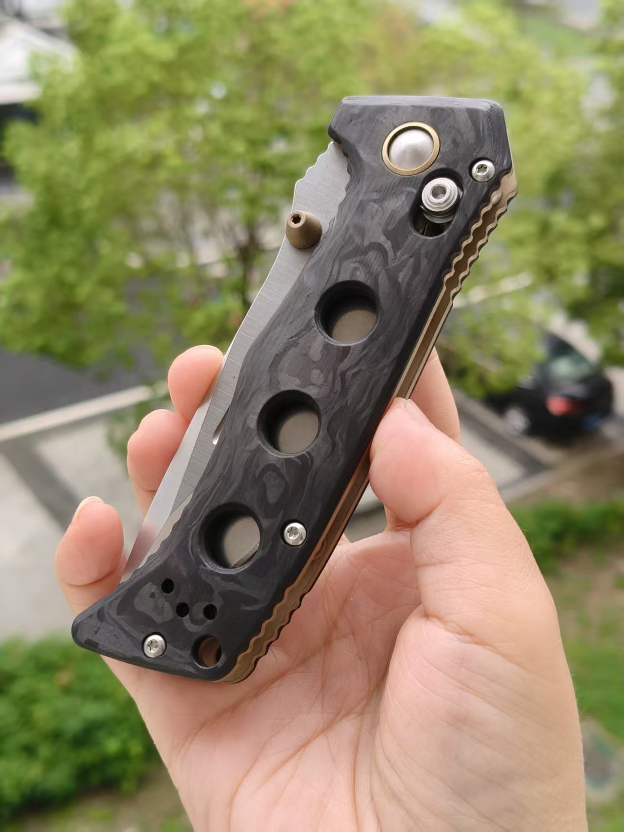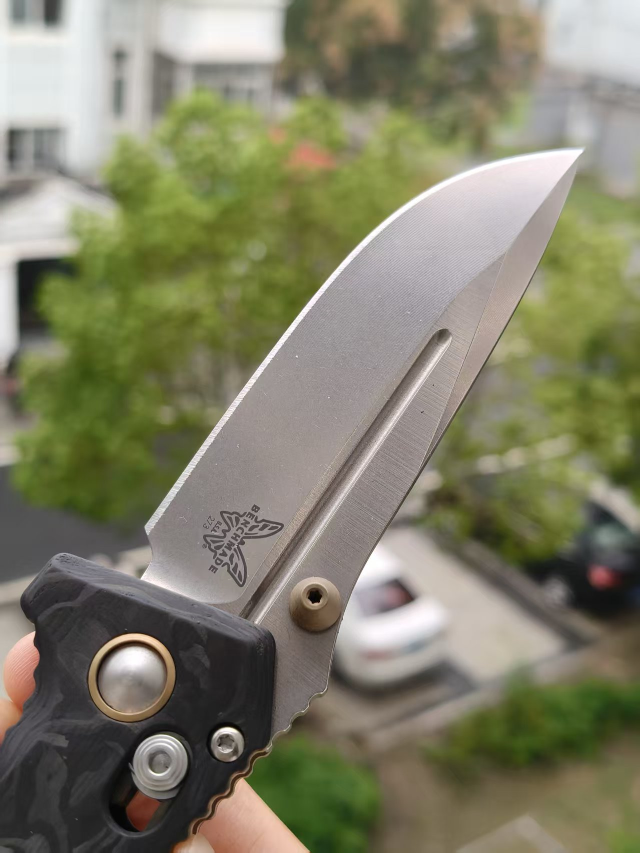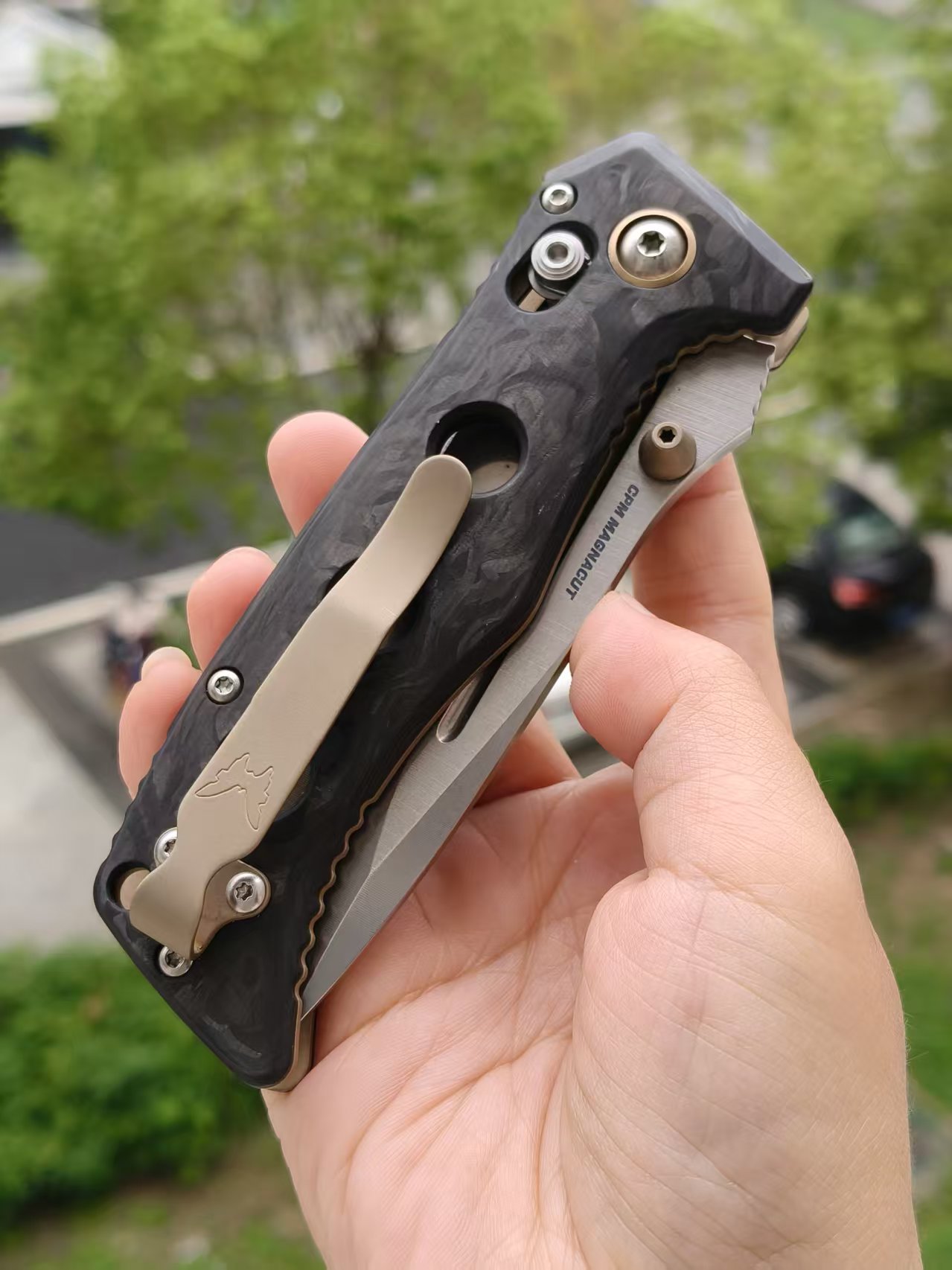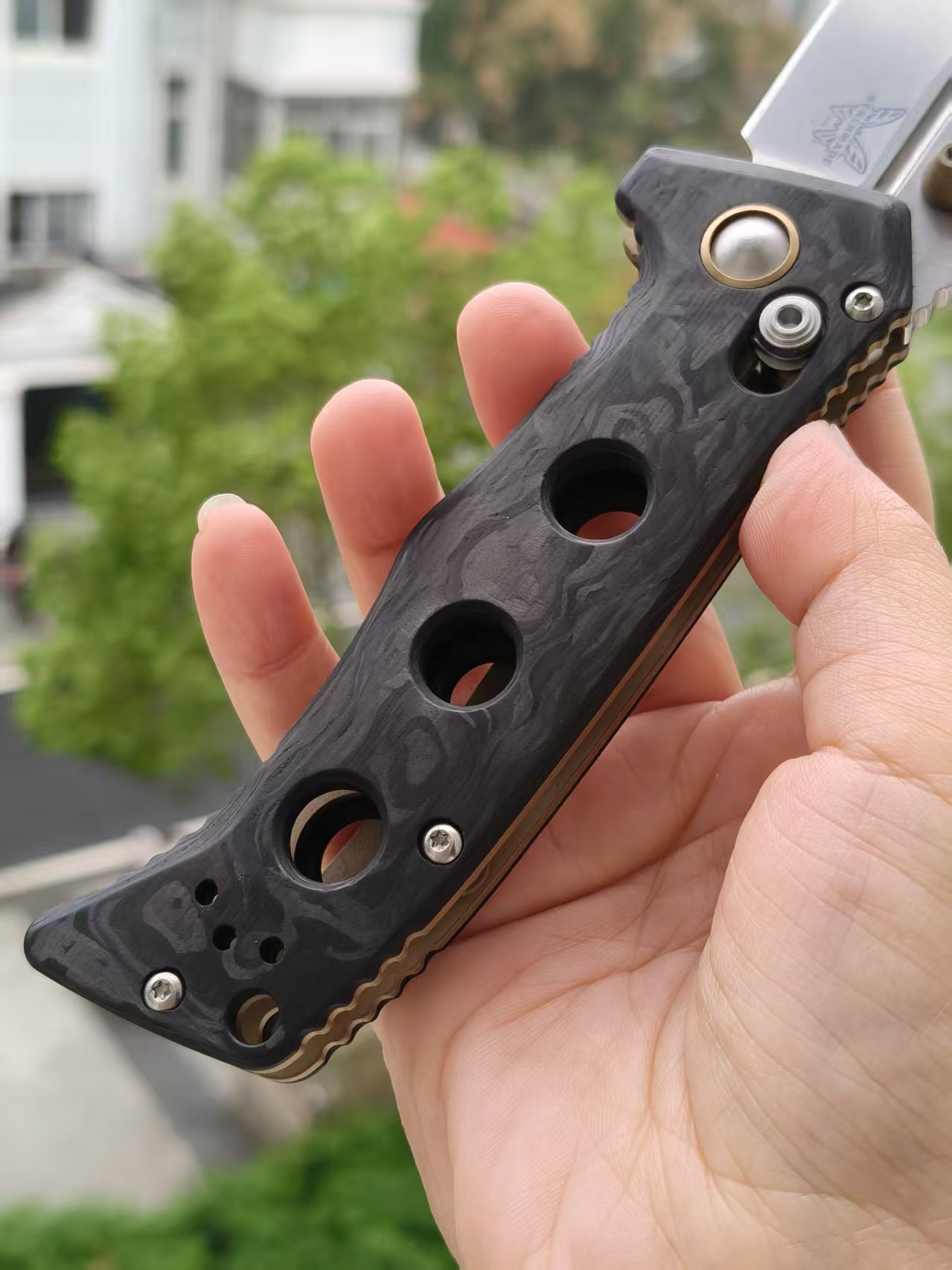 Benchmade 273-03 是一把精致而耐用的折刀。它采用了优质的材料和精湛的工艺,为用户提供出色的切割性能和可靠的使用体验。这把折刀由著名设计师Shane Sibert设计,以其坚固耐用的特性而闻名。刀片采用了3.25英寸的CPM MagnaCut不锈钢材质,具有出色的切割能力和长久的刀刃保持性。手柄采用大理石纹碳纤维材质,既轻巧又坚固,提供舒适的握持感和视觉吸引力。
