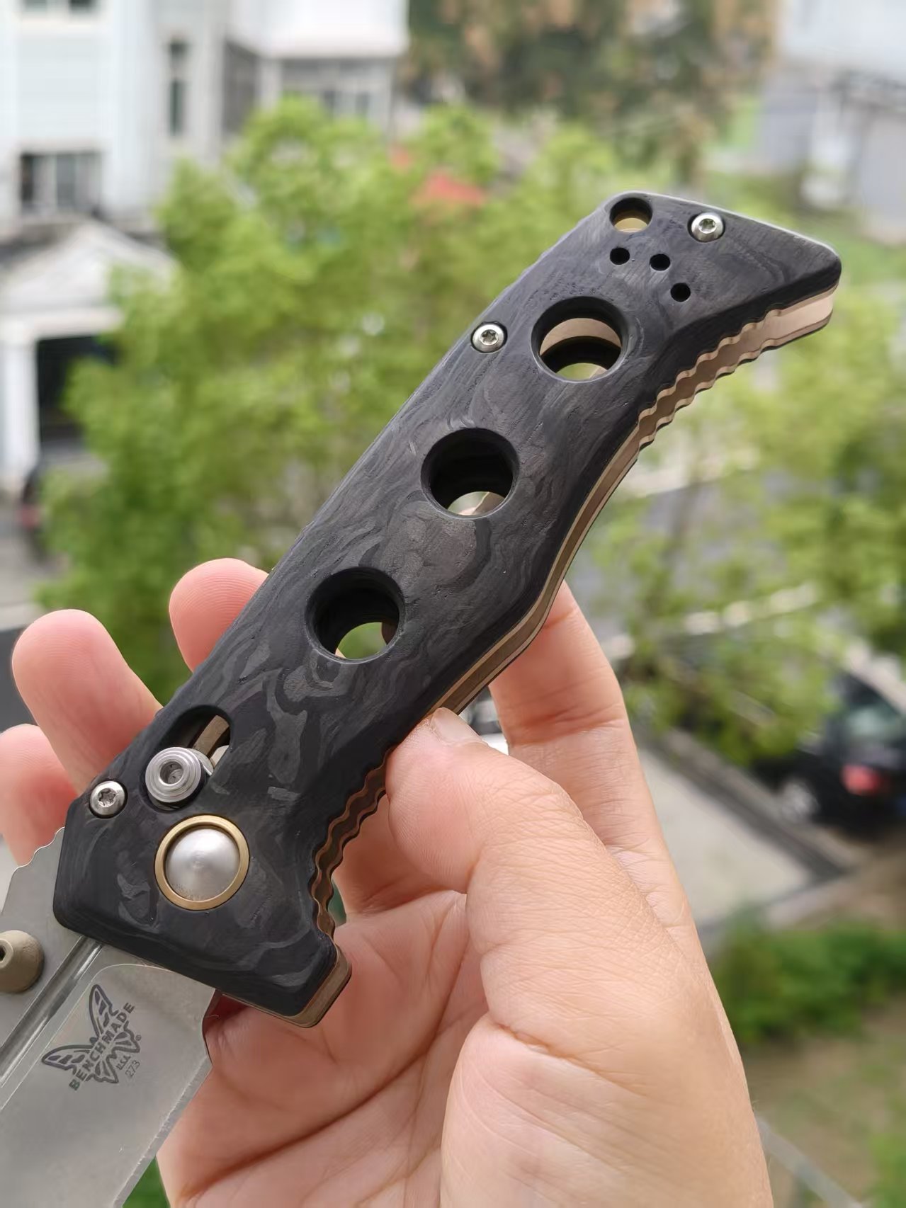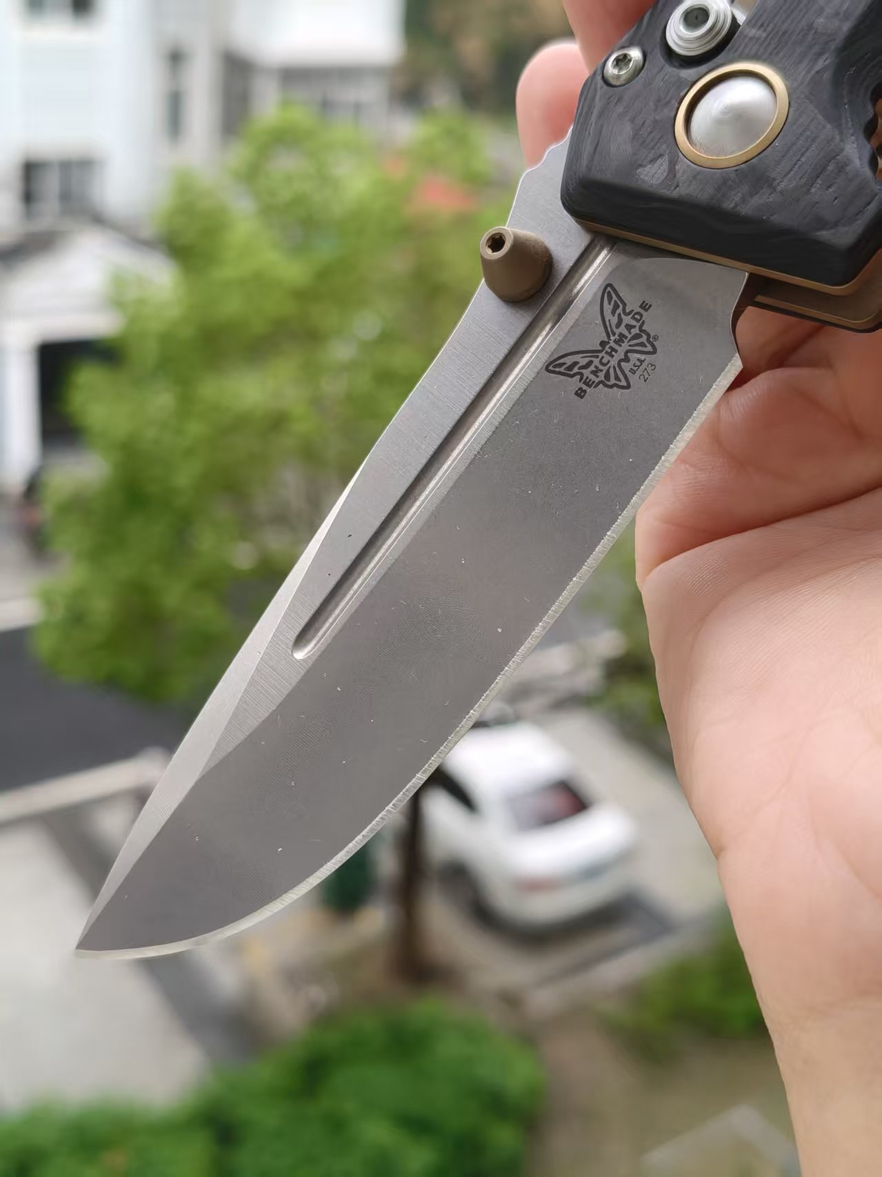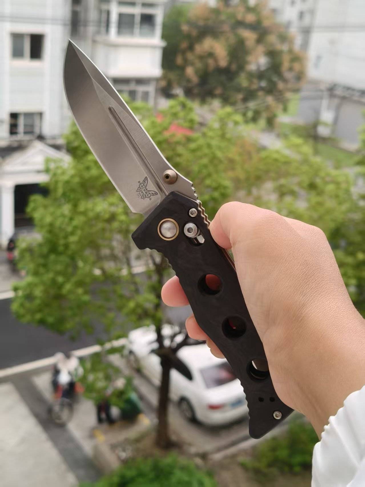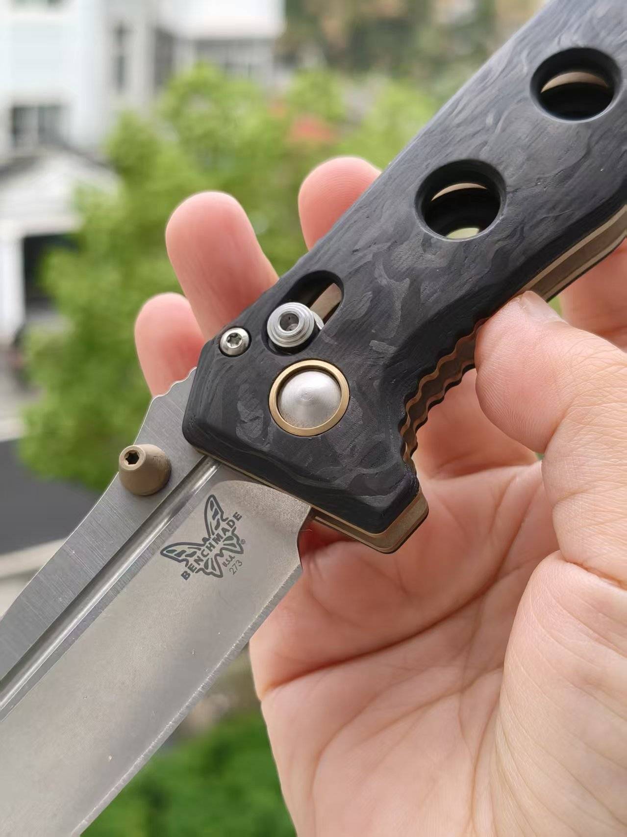 Benchmade 273-03 是一把精致而耐用的折刀。它采用了优质的材料和精湛的工艺,为用户提供出色的切割性能和可靠的使用体验。这把折刀由著名设计师Shane Sibert设计,以其坚固耐用的特性而闻名。刀片采用了3.25英寸的CPM MagnaCut不锈钢材质,具有出色的切割能力和长久的刀刃保持性。手柄采用大理石纹碳纤维材质,既轻巧又坚固,提供舒适的握持感和视觉吸引力。