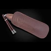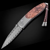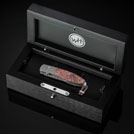 君主系列“波浪瘤”刀柄轻巧坚固,钛金属打造,并镶嵌红木瘤。刀刃采用“波浪”大马士革钢制成,核心部分采用VG-10级超强硬度;单手按钮锁和拇指螺柱镶嵌白色托帕石。君主系列设计简洁,赏心悦目,握感舒适;优雅的刀柄造型也使其成为展示精美手工雕刻或珍稀材质的理想平台。“波浪瘤”刀柄将功能性、珍稀材质与精湛工艺完美融合,是威廉·亨利系列的标志性特征。
