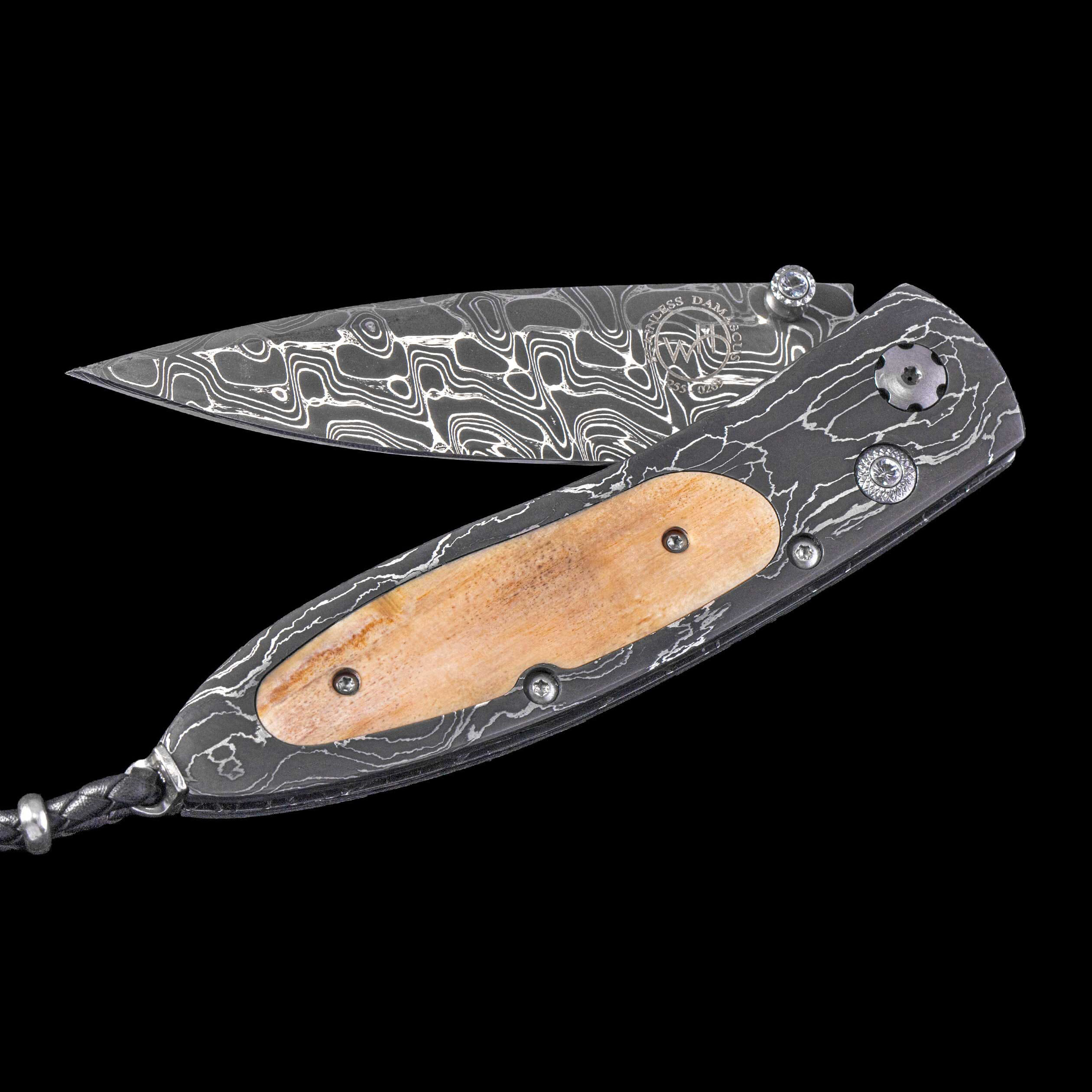 产品详情 独一无二的刀 - 定制刀 型号:B05 Monarch 刀锋:‘无畏’大马士革——查德·尼科尔斯 框架:'T-Rex' 大马士革 - Delbert Ealy 鳞片:海象牙化石 宝石:白色托帕石 产品编号:KC2...