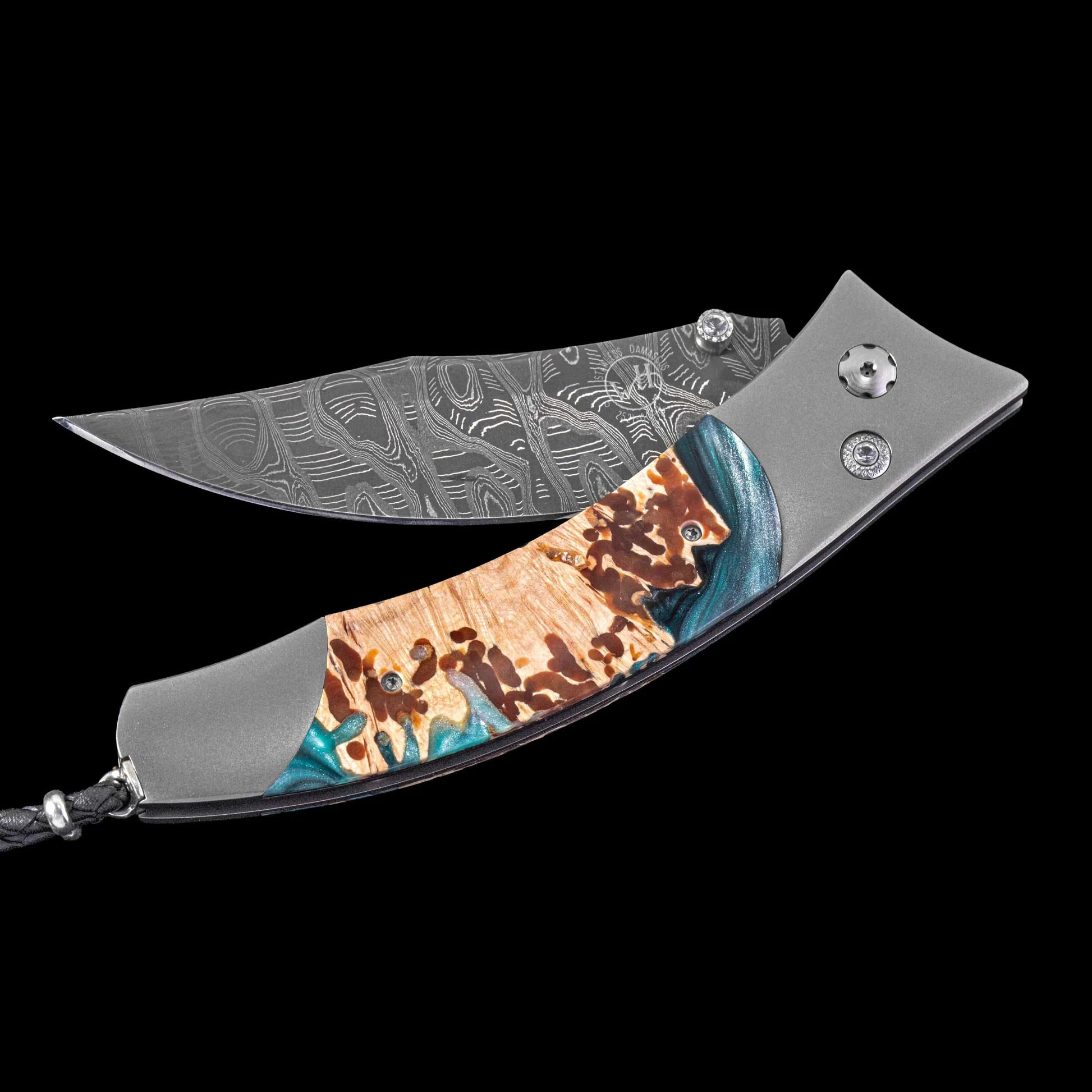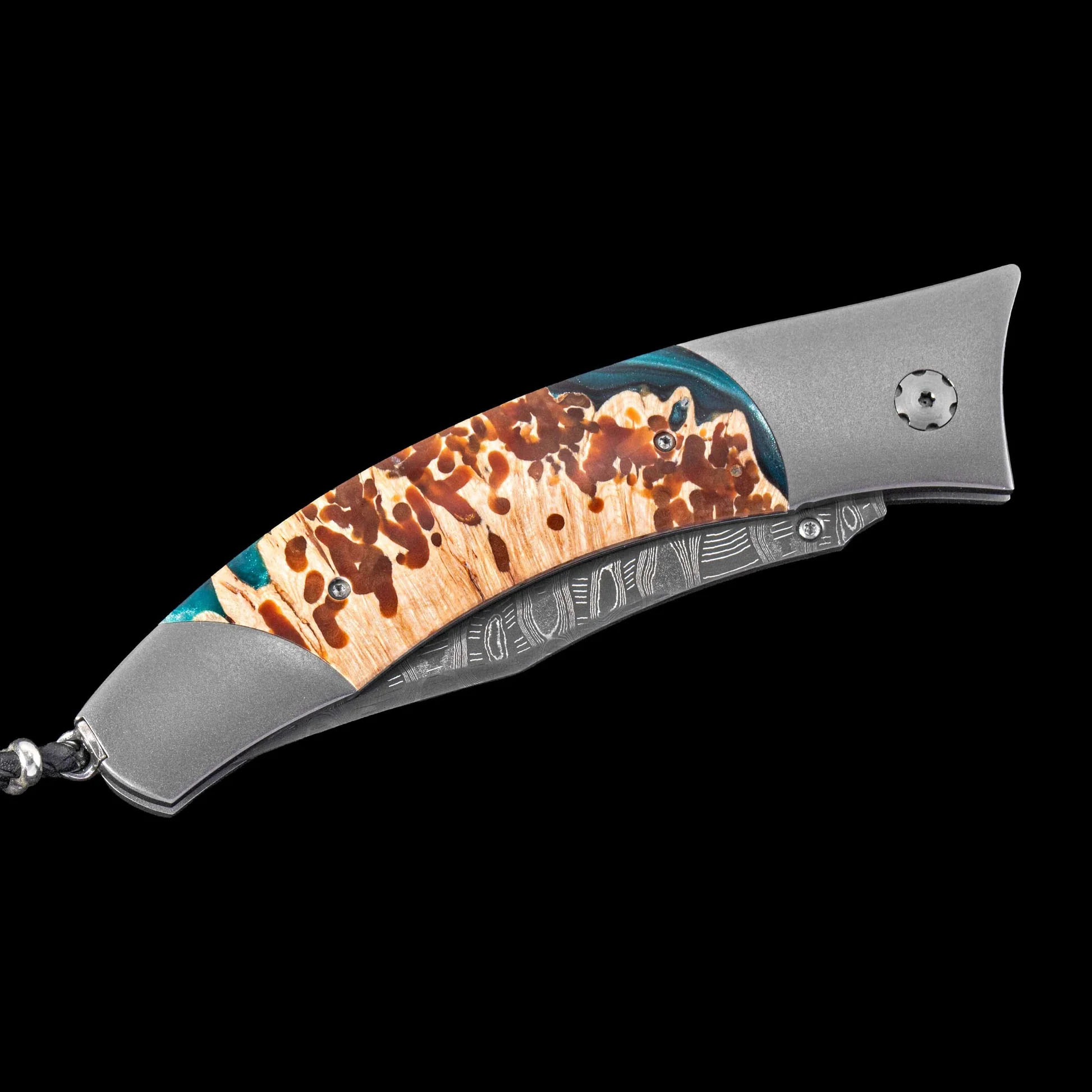 独一无二的刀 - 定制刀 型号:B21 Contour 刀锋:大马士革“黄蜂巢”——迈克·诺里斯 框架:航空级钛合金 材质:天然木材和树脂混合物 宝石:白色托帕石