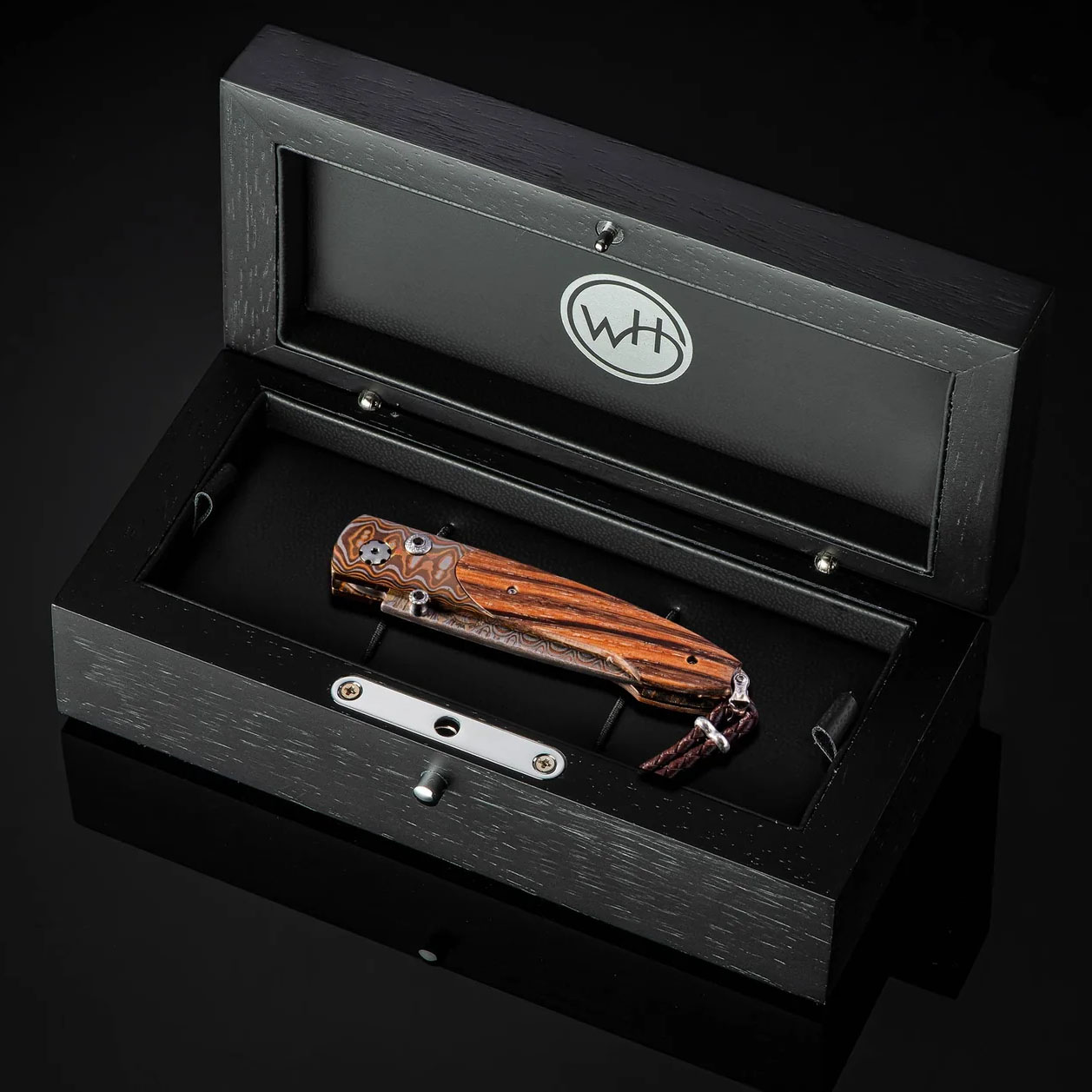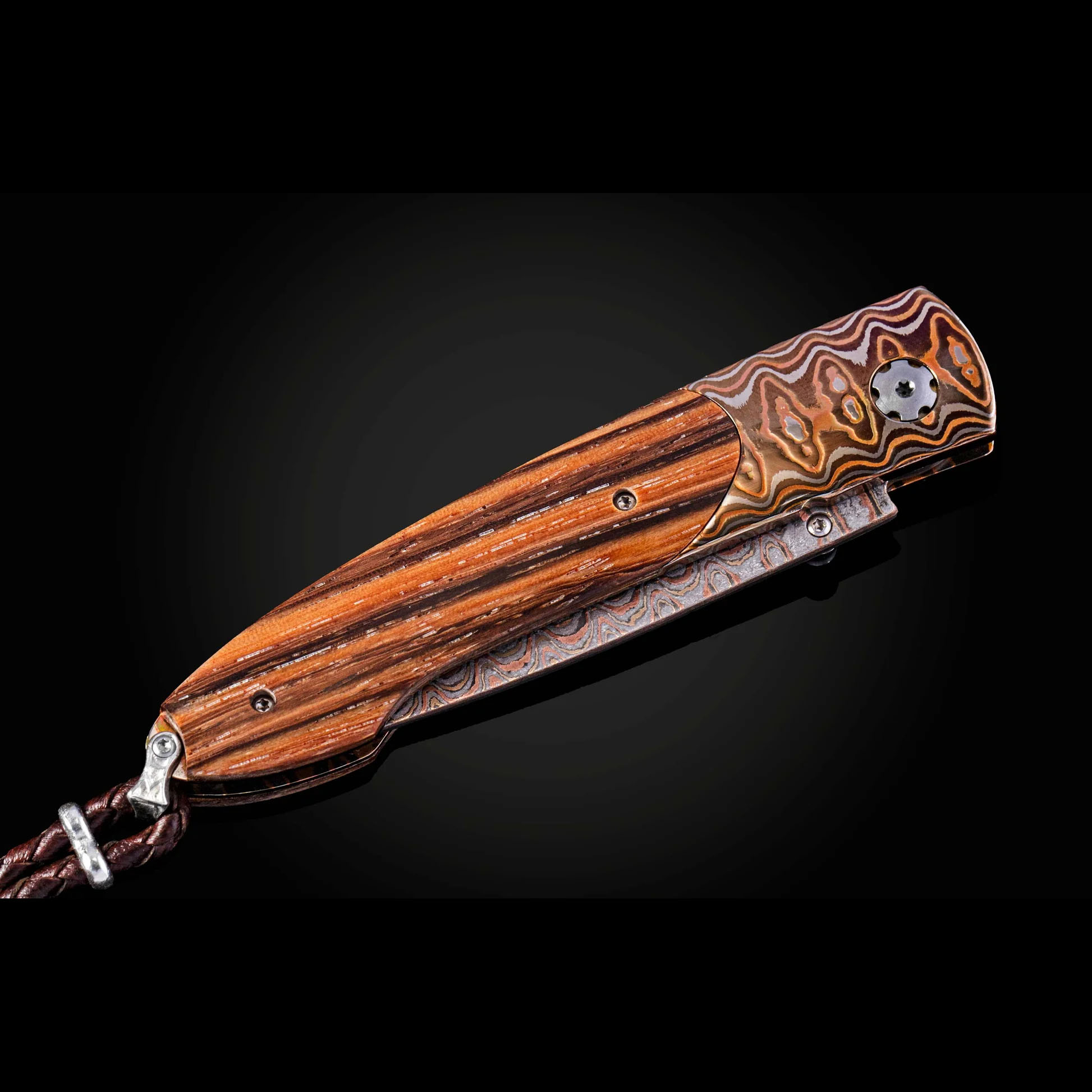 Lancet“斑马”刀采用热色“波纹木目”材质,并镶嵌斑马木。刀身惊艳,采用威廉·亨利标志性的“铜波纹”大马士革钢打造,刀芯采用VG-5钢,锋利无比。单手按钮锁和拇指螺柱镶嵌烟晶宝石。
