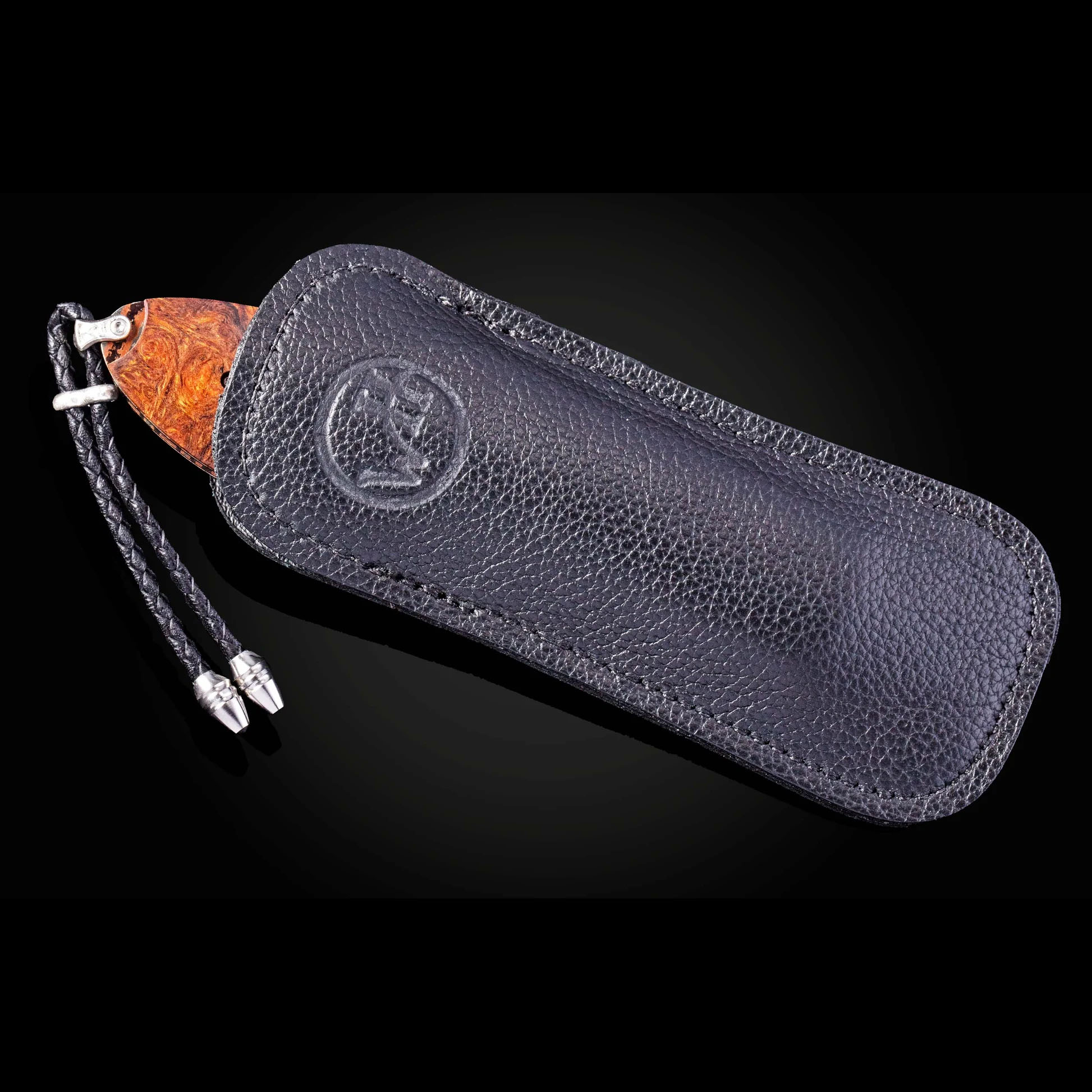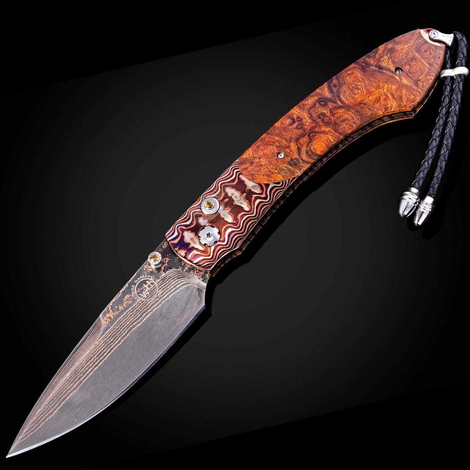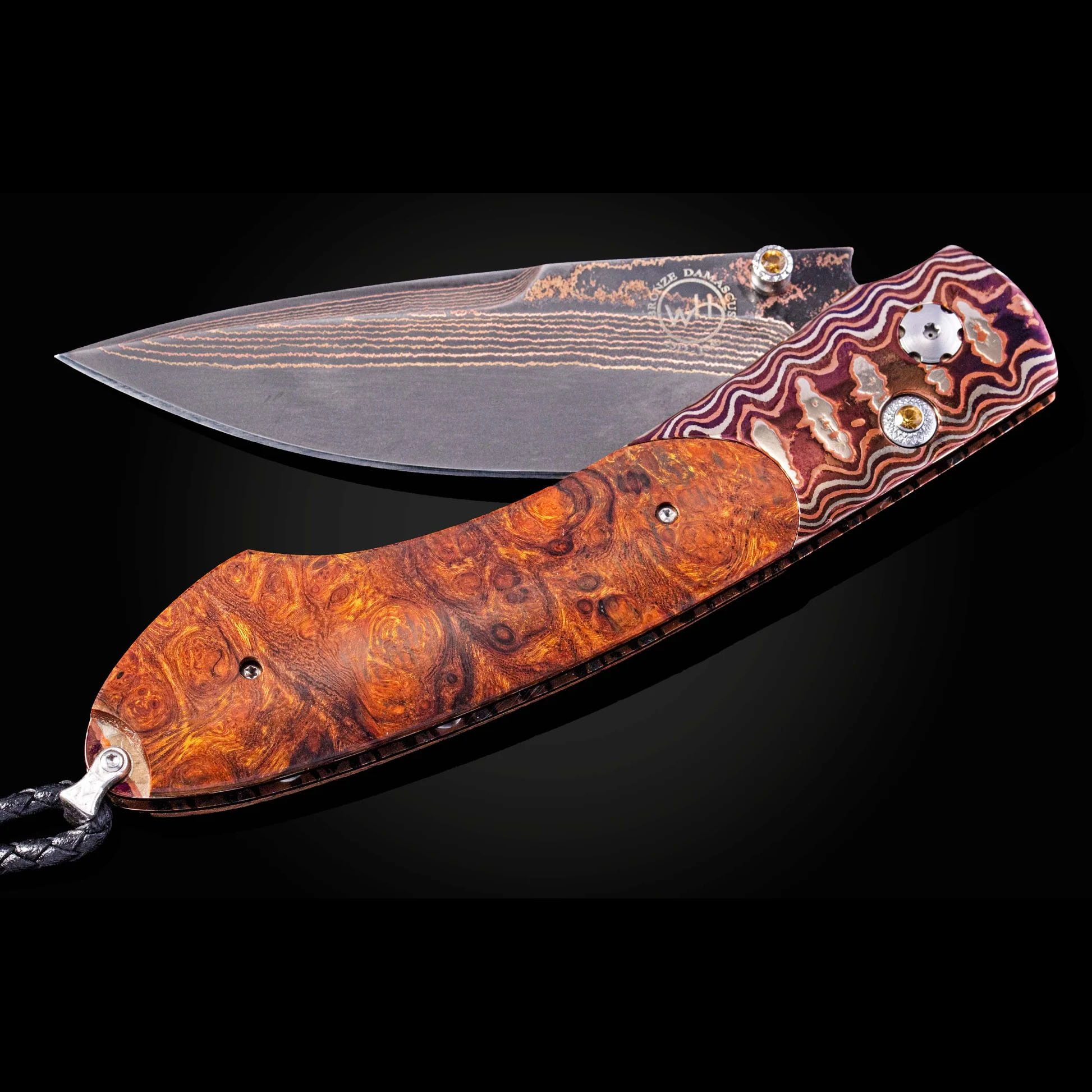 Spearpoint“虎纹”刀身采用热色“波浪木目”木纹,并镶嵌沙漠铁木瘤。刀刃采用贝克锻造厂手工锻造的“虎纹”大马士革钢。单手按钮锁和拇指螺柱镶嵌黄水晶。Spearpoint 的设计非凡,拥有全尺寸安全握持,以及多功能深腹刀身,体现了 William Henry 的核心理念——卓越的功能值得提升为卓越的艺术。“虎纹”还采用了 William Henry 最受推崇的独特锻造和手工雕刻材质;它是一件永恒的传家宝,值得您自豪地佩戴和使用一生,并传给下一代。