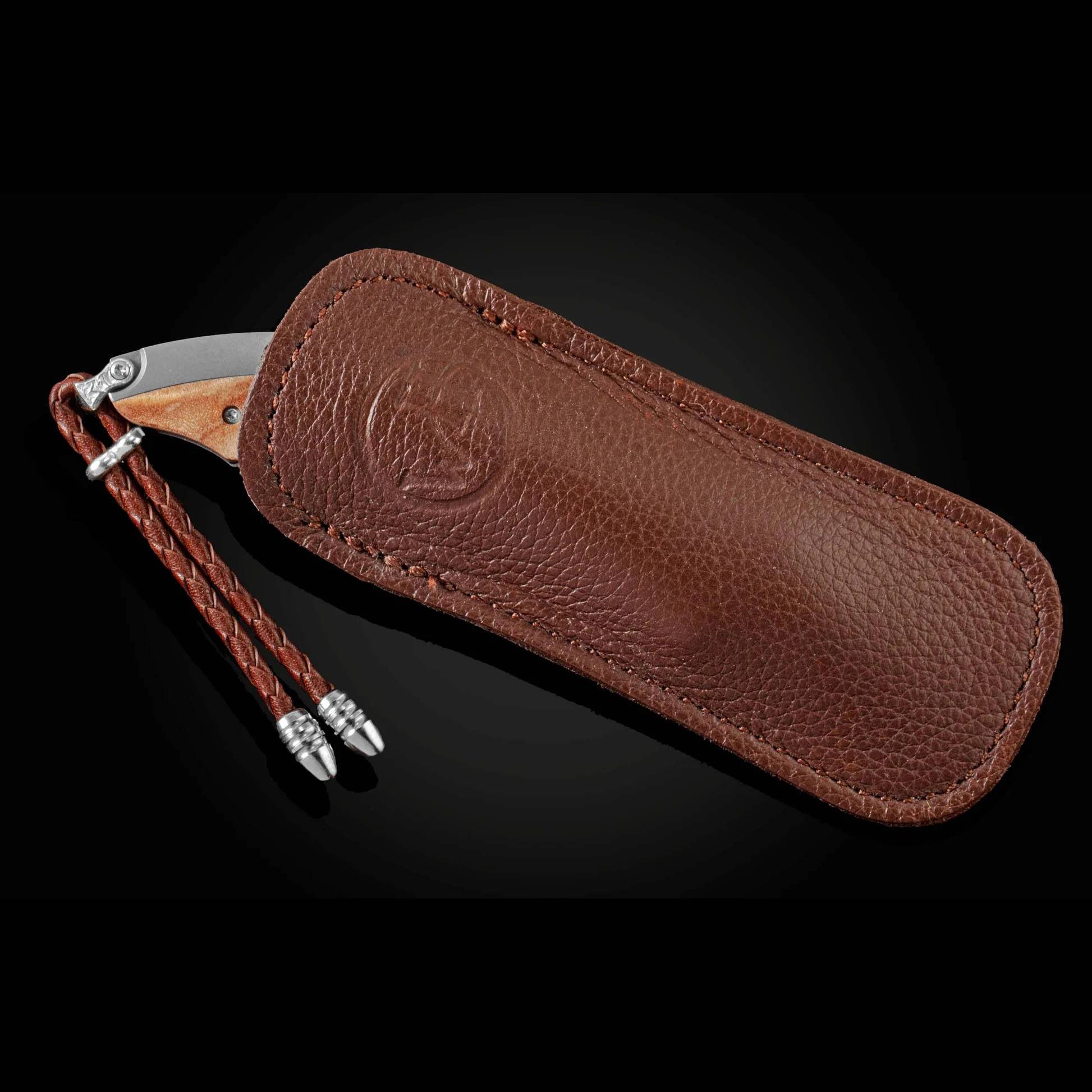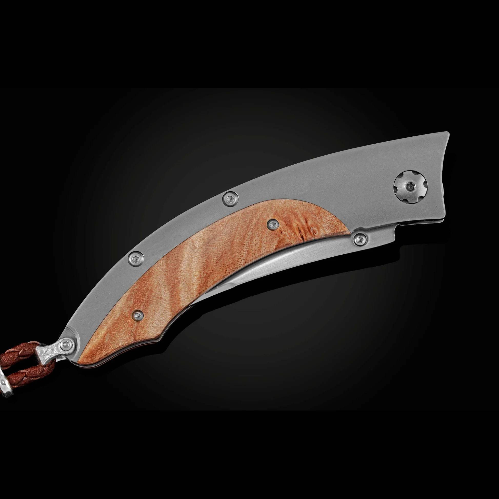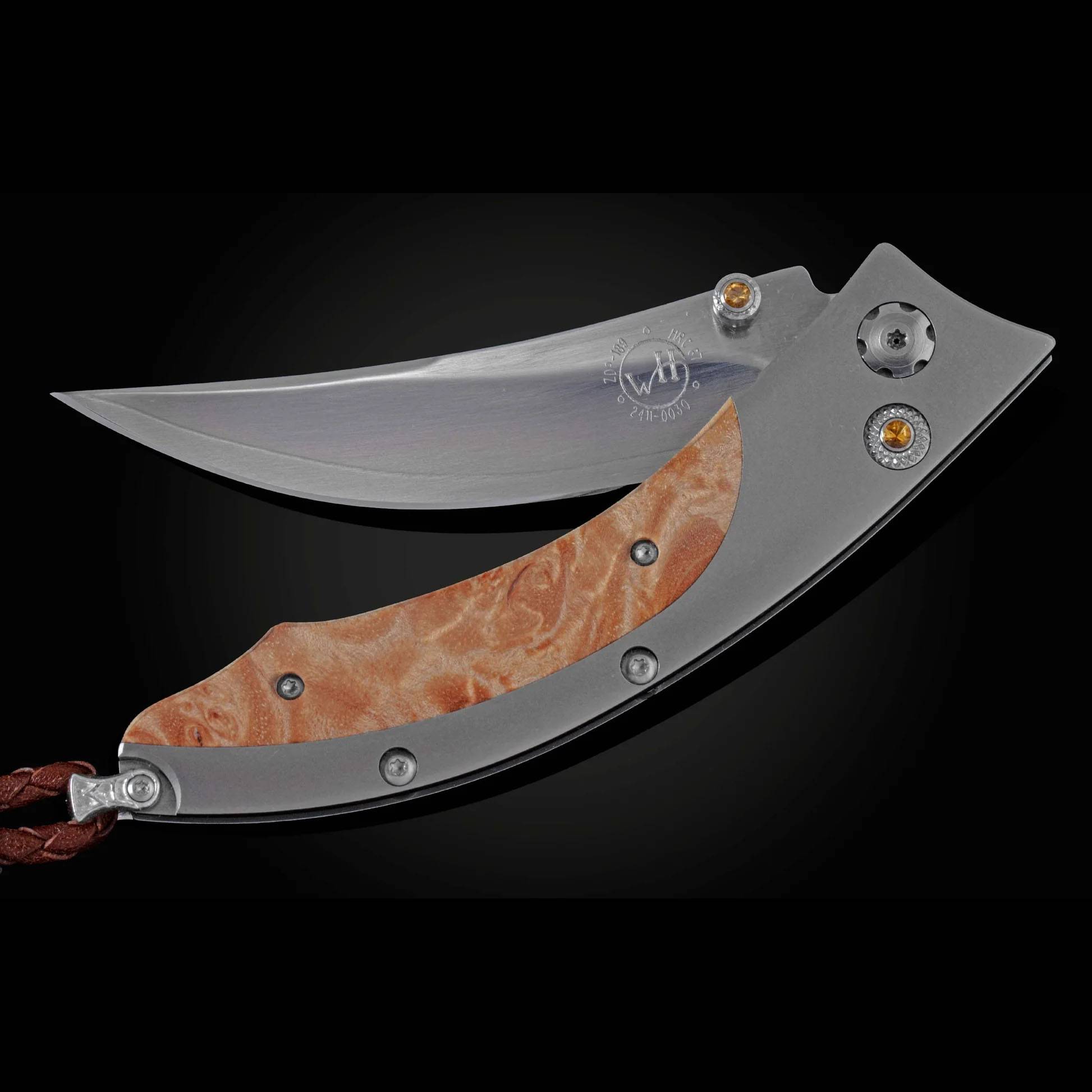 细节 波斯“银叶”刀采用钛金属框架,镶嵌枫木瘤木。刀刃采用三层钢打造,刀芯采用ZDP-189超强钢材,单手按钮锁和拇指钮均镶嵌精美黄水晶。 波斯刀优雅地融合了动感的线条、优美的曲线和精致的材质。“...