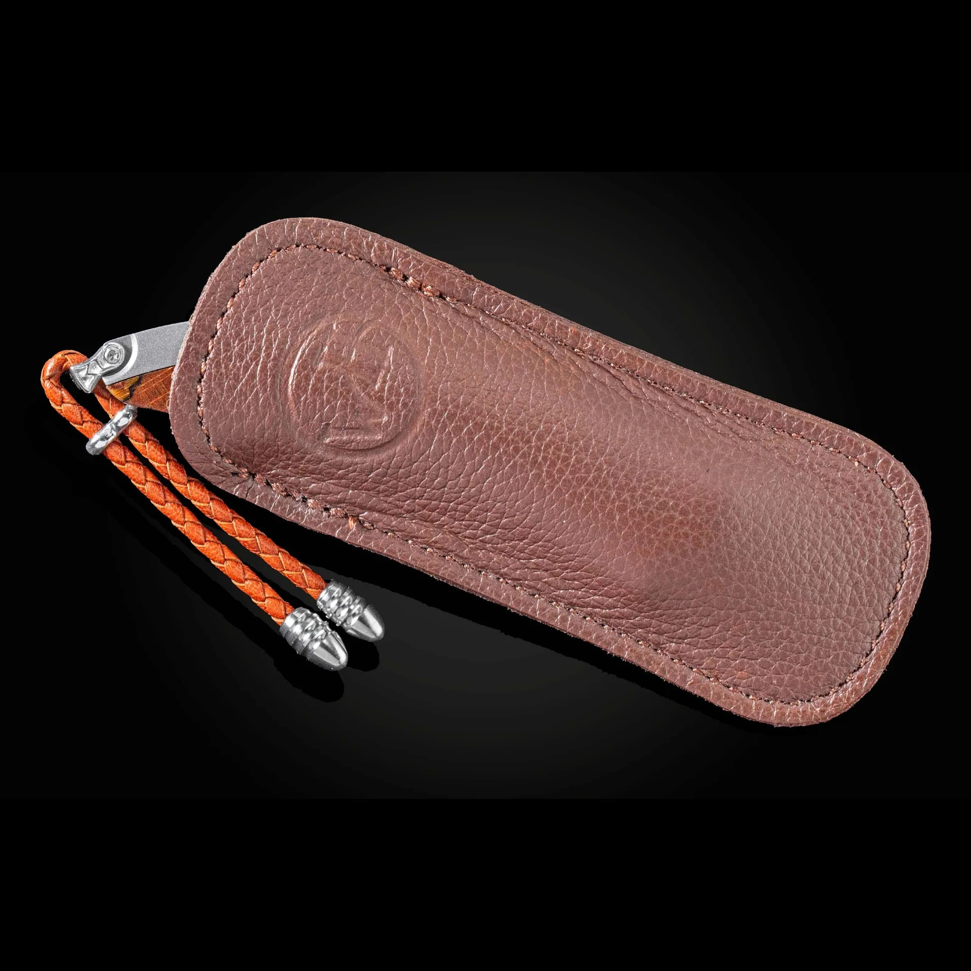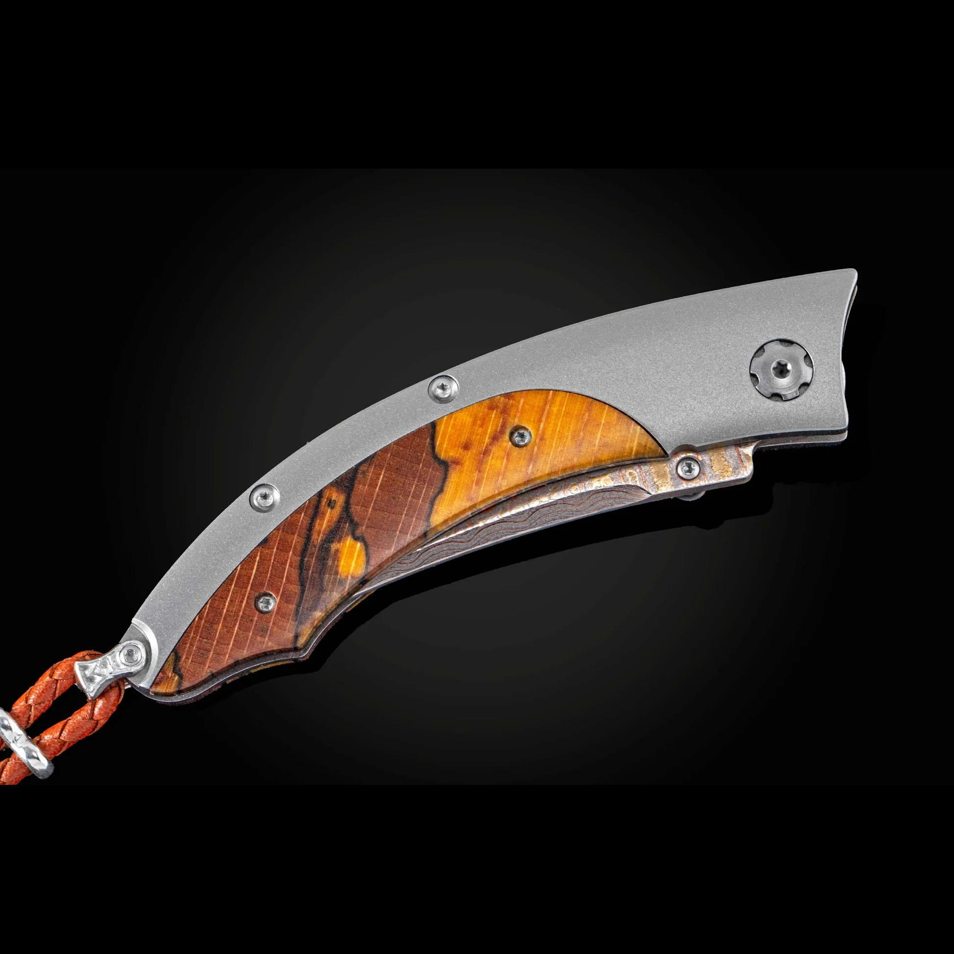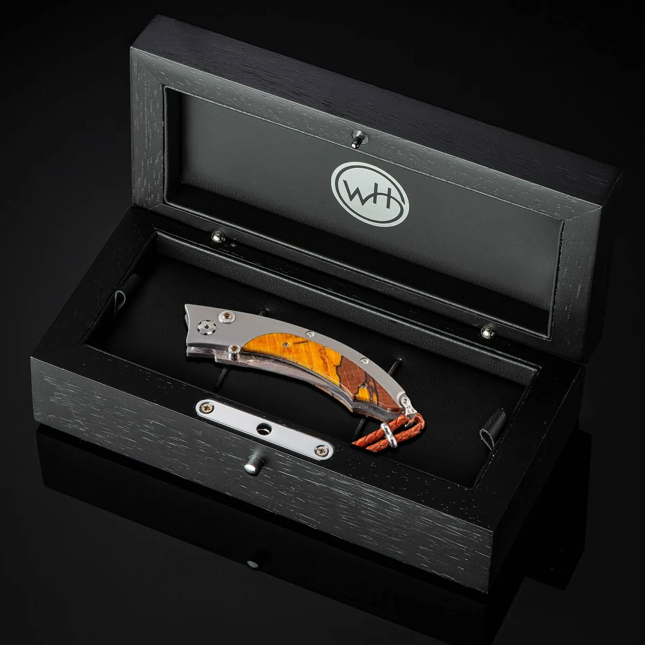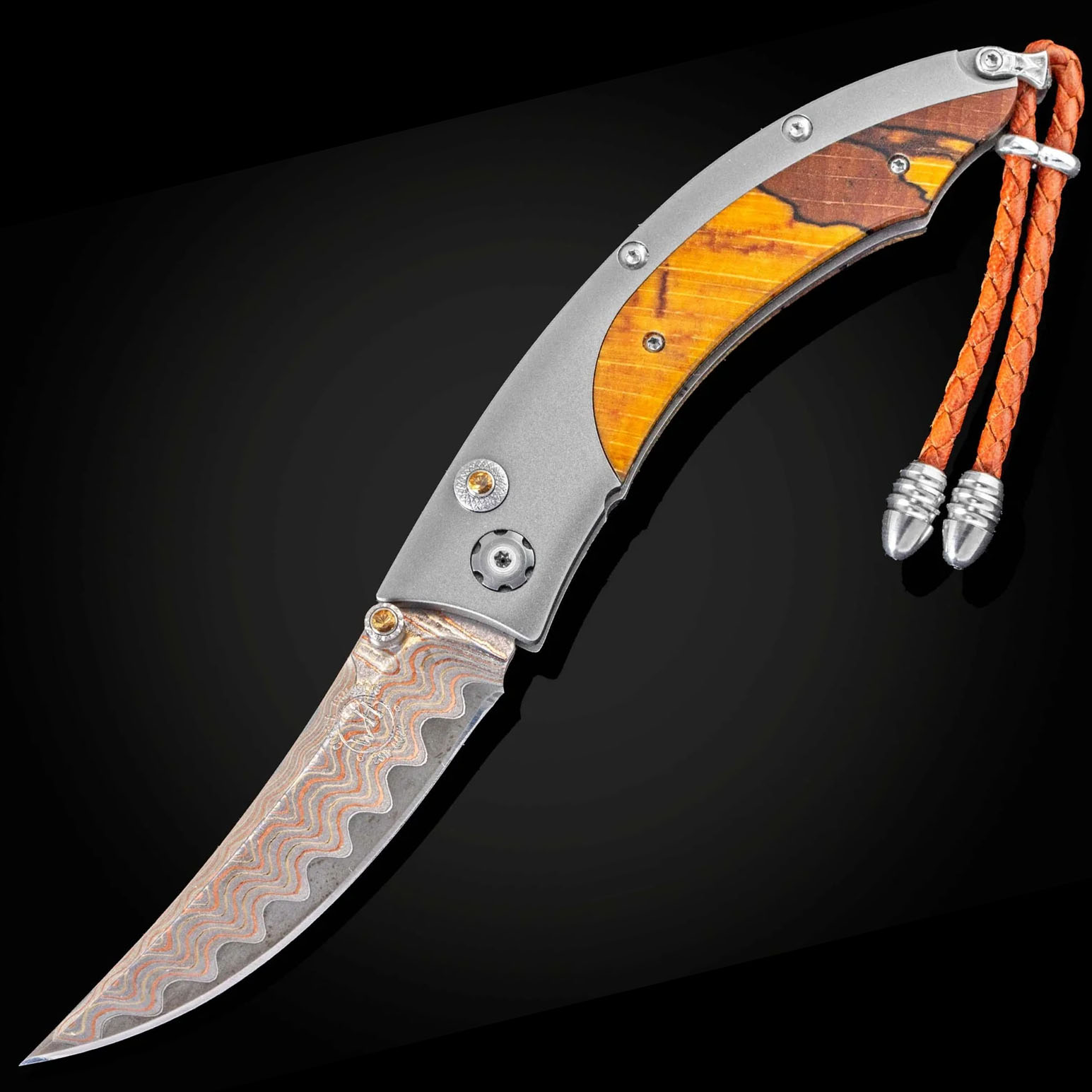 波斯“黄曲线”刀身采用钛金属框架,镶嵌黄色裂纹山毛榉木鳞片。刀刃采用“铜波”大马士革钢,刀芯为VG-5级。单手按钮锁和拇指螺柱镶嵌黄水晶宝石。 波斯刀优雅地融合了动感的线条、优美的曲线和精致的材质。“黄曲线”是对经典设计的大胆诠释,还采用了威廉·亨利系列标志性的珍稀异国材质和手工锻造金属;这是一件值得终身佩戴的永恒传家之宝。
