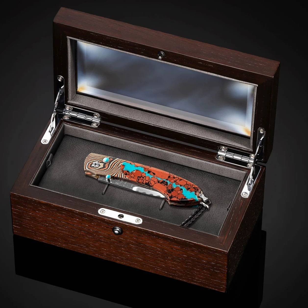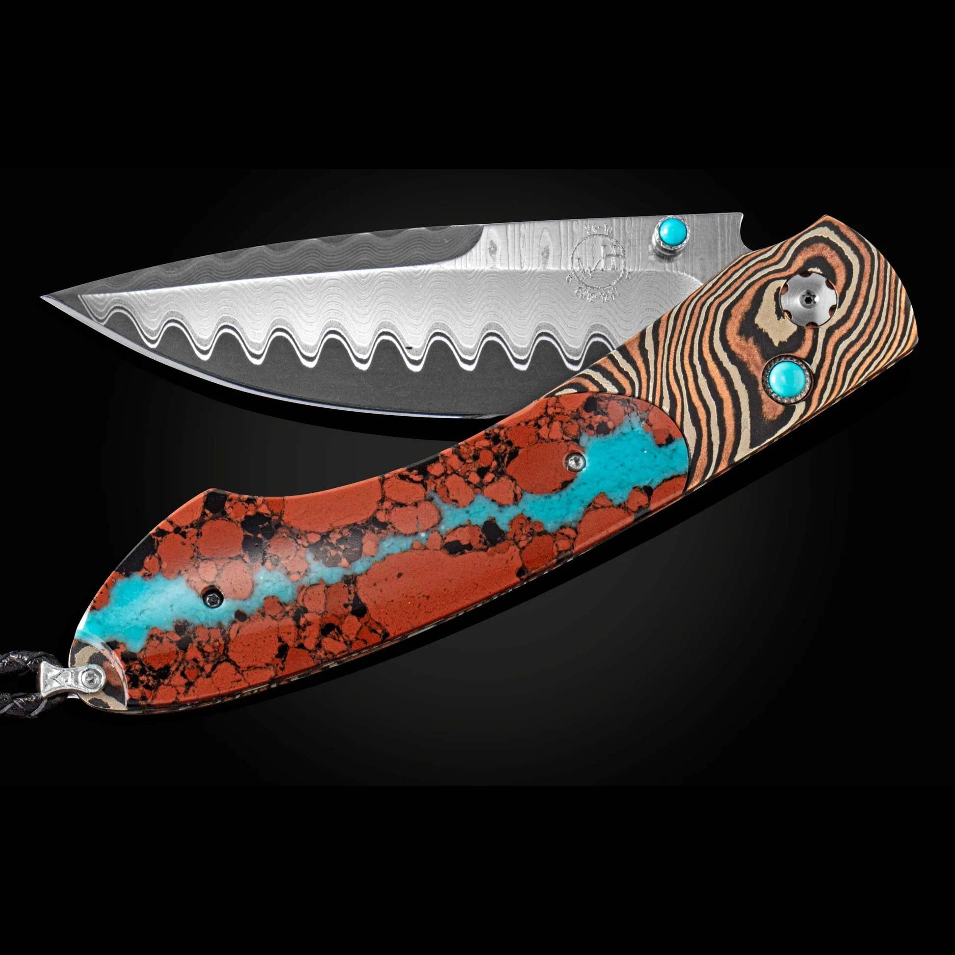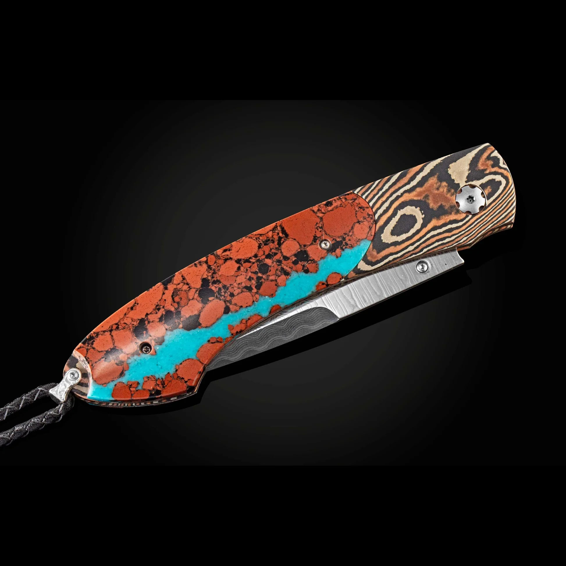 细节 Spearpoint 'Chuska' 刀身采用 Mike Sakmar 打造的精美“Twist”木目纹刀,并镶嵌有脉状绿松石。刀刃采用 William Henry 标志性的“Wave”大马士革钢,核心材质为 VG-10。单手按钮锁和拇指螺柱镶嵌有...