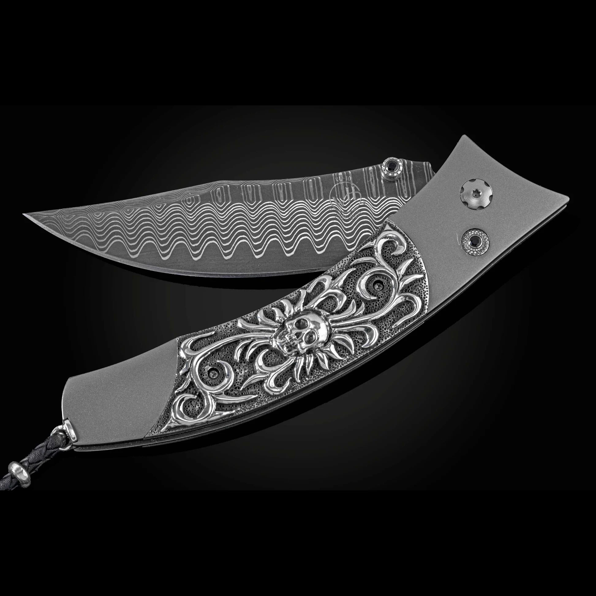 Contour“Skull Candy”刀身采用航空级钛金属打造,并镶嵌由Lee Downey手工雕刻的纯银。刀刃采用我们的“Wave”大马士革钢,刀芯为VG-10级。单手按钮锁和拇指螺柱均镶嵌尖晶石。