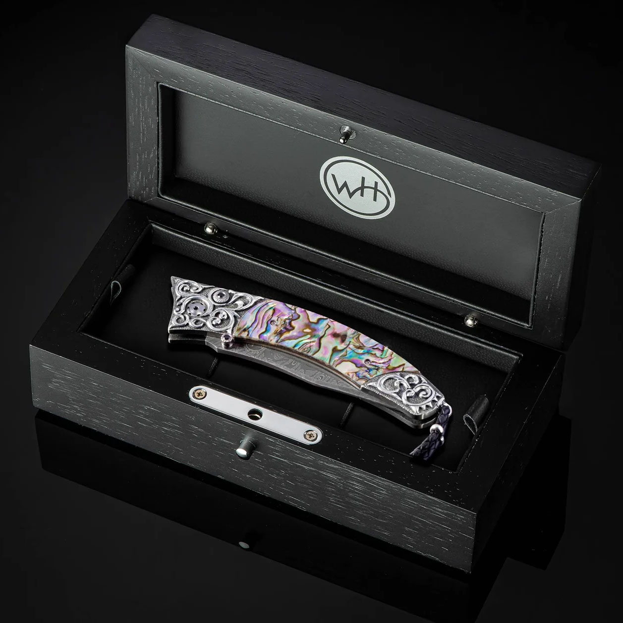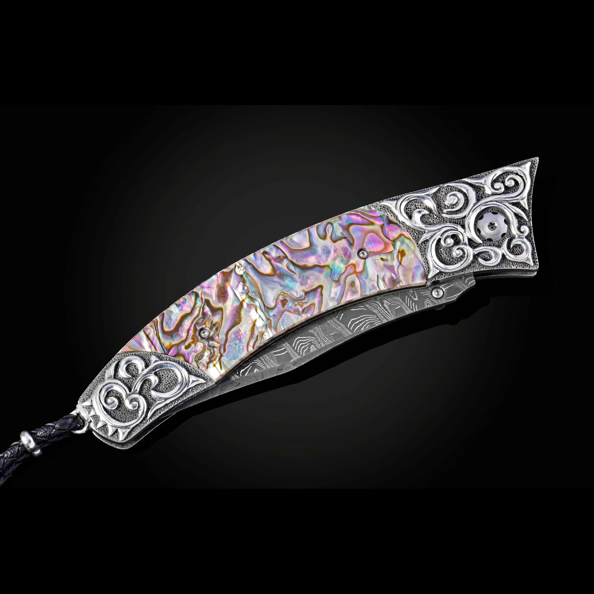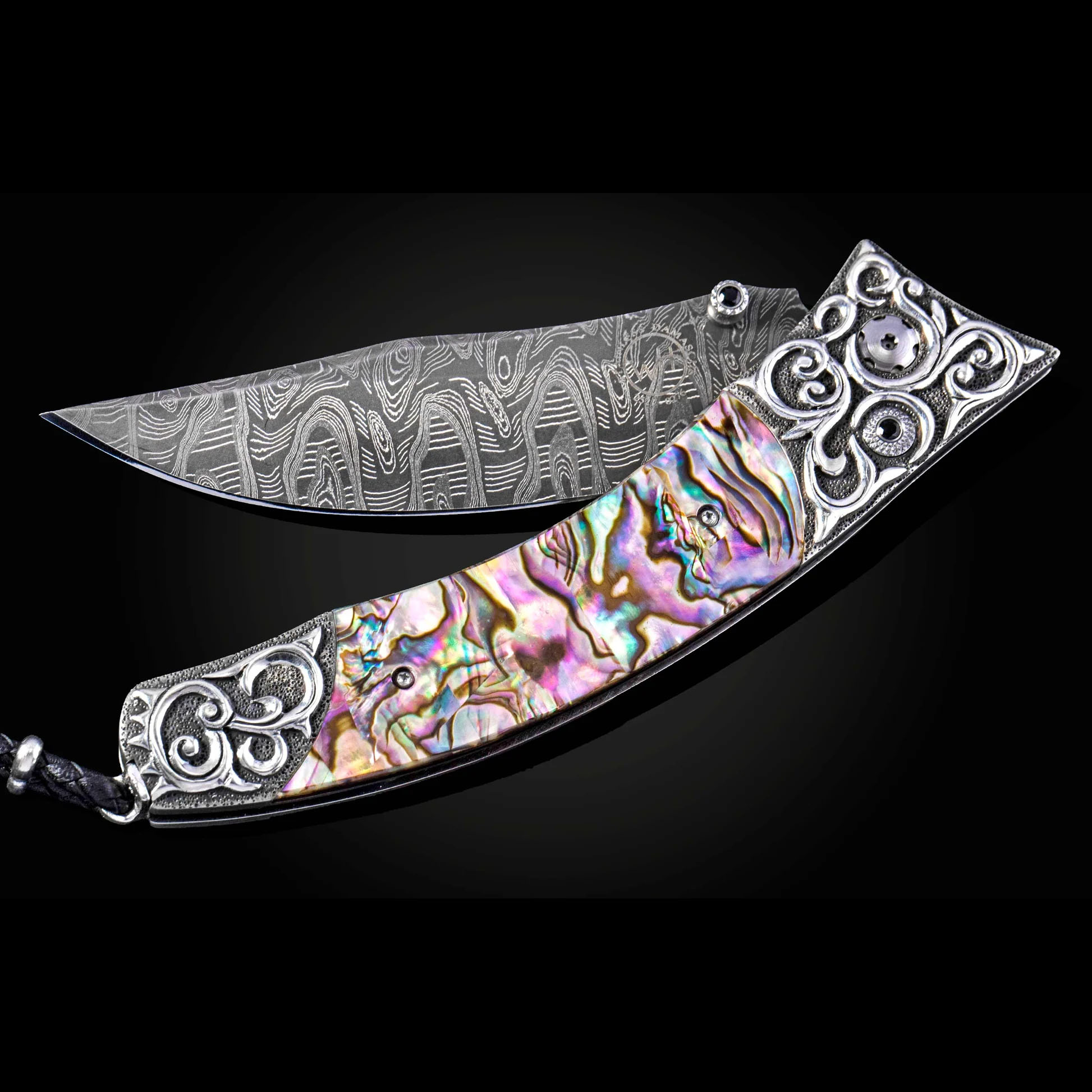 细节 Contour“Sea Spray”系列采用Lee Downey手工雕刻的纯银框架,并镶嵌鲍鱼壳。刀刃则采用Mike Norris手工锻造的“Hornets Nest”大马士革钢。单手按钮锁和拇指螺柱均镶嵌尖晶石。 Contour 完美融合...