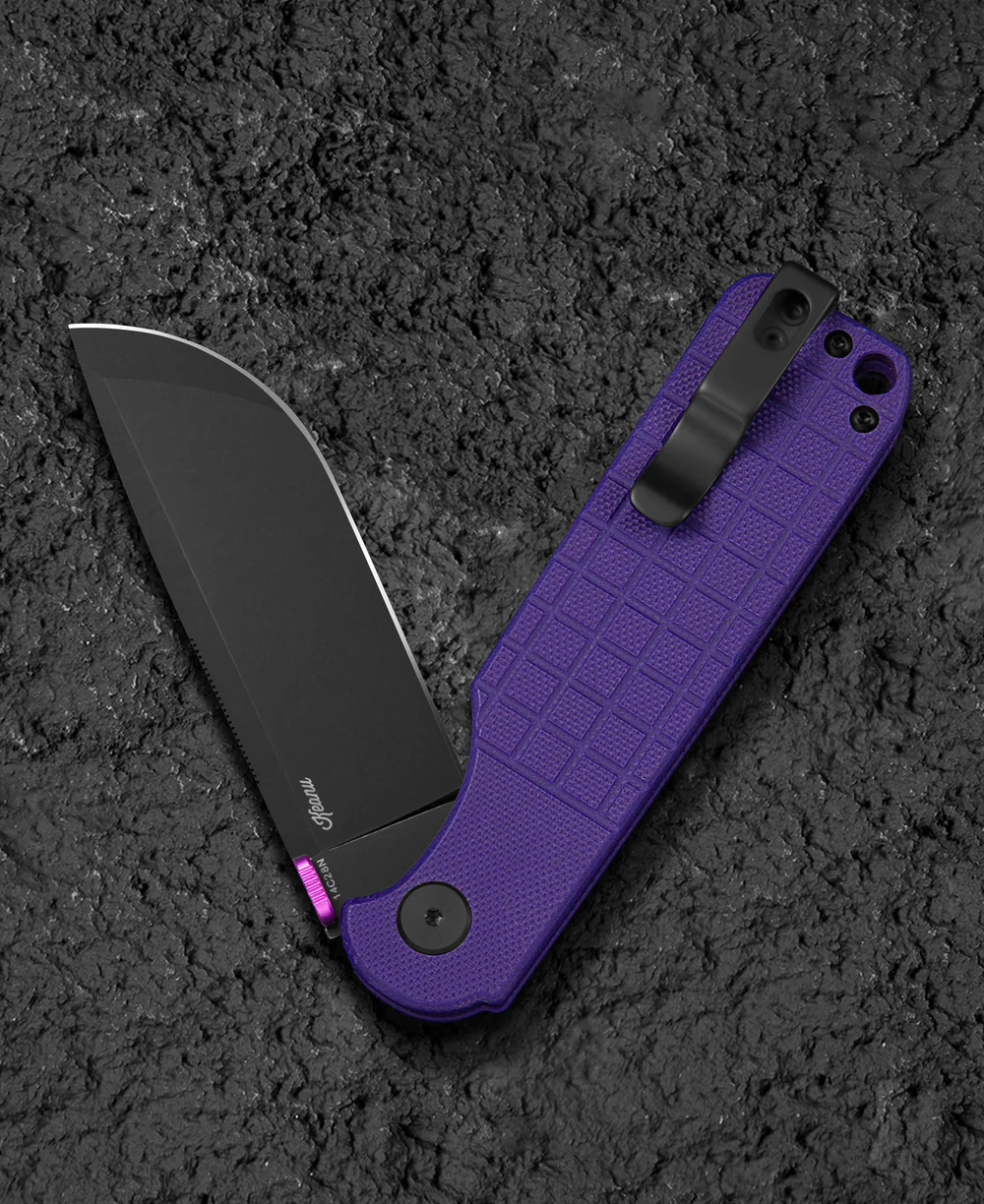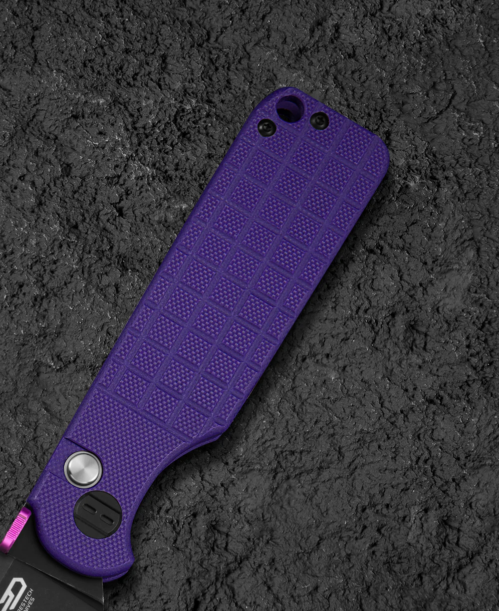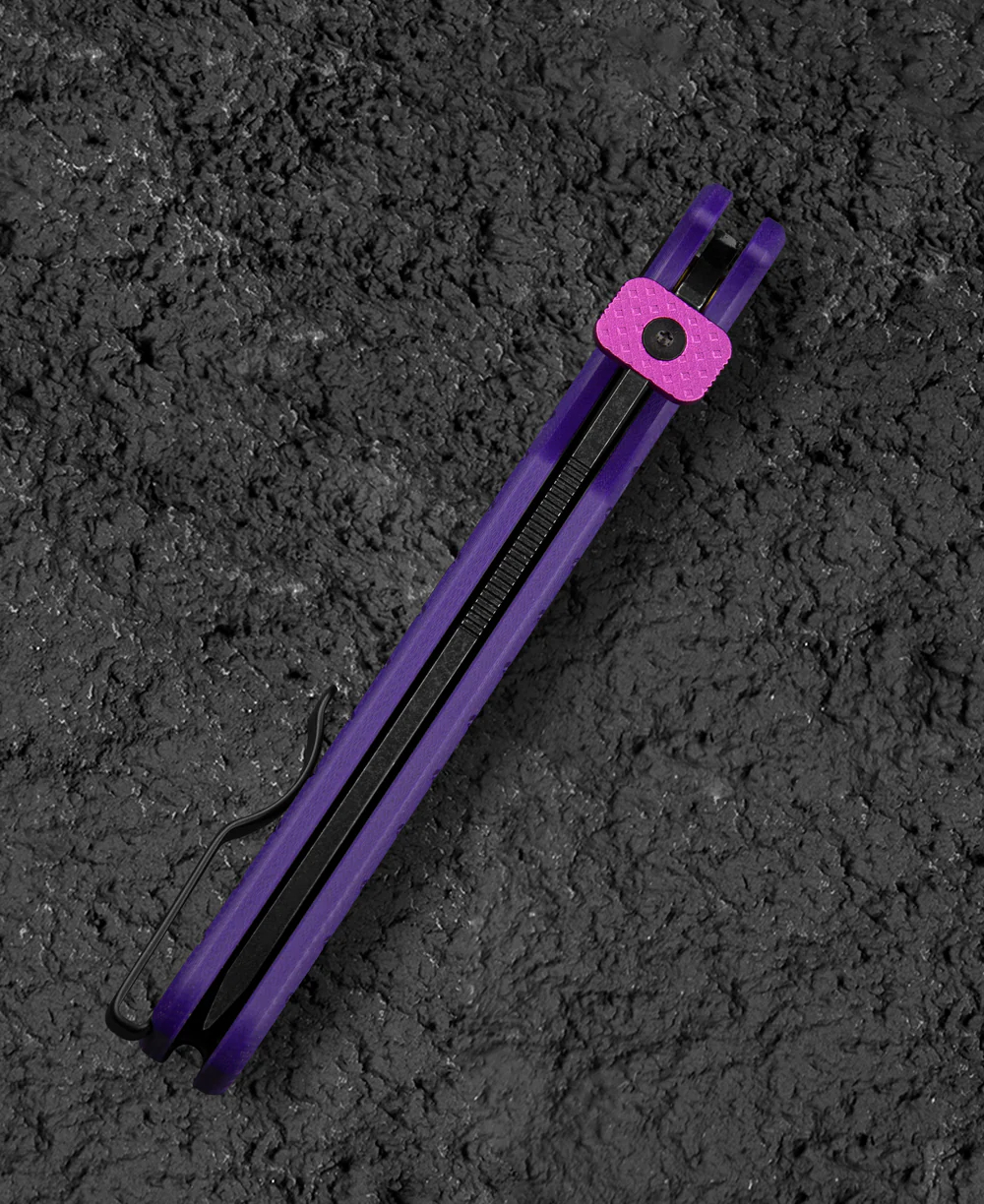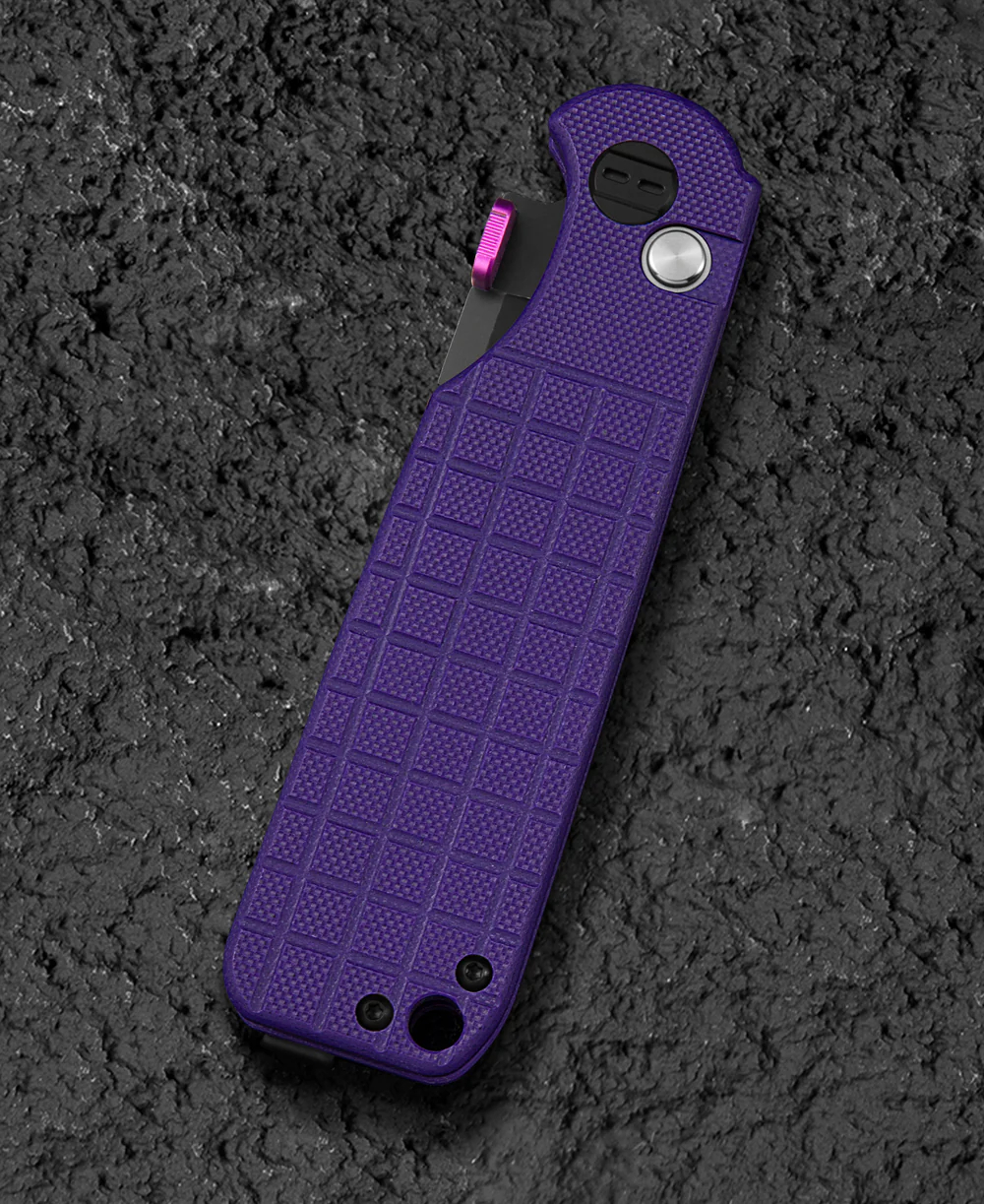 规格 刀片材质:14C28N 刀片表面处理:黑色石洗 手柄材质:G10 夹子材质:钢 描述:按钮锁定 手柄颜色:紫色 滚珠轴承:陶瓷 拇指螺柱:硬质阳极氧化铝合金 总长度:8.07 英寸(205...