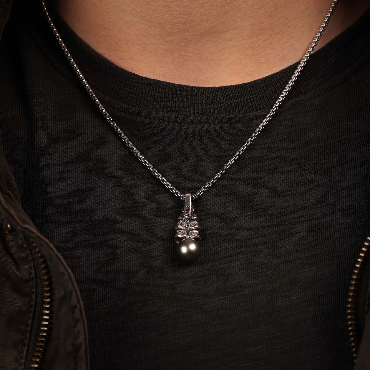 响尾蛇吊坠 (Rattler) 是一款引人注目的吊坠,其灵感源自响尾蛇尾巴的雕刻纯银底座,连接着一颗美丽的南洋珍珠,隐形镶嵌,营造出色彩、纹理和形状的浑然一体、意想不到的和谐统一。吊坠搭配一条精致的纯银威尼斯盒形链条,轻度氧化,手工抛光。这款吊坠体现了威廉·亨利 (William Henry) 的核心设计风格——低调而强烈。