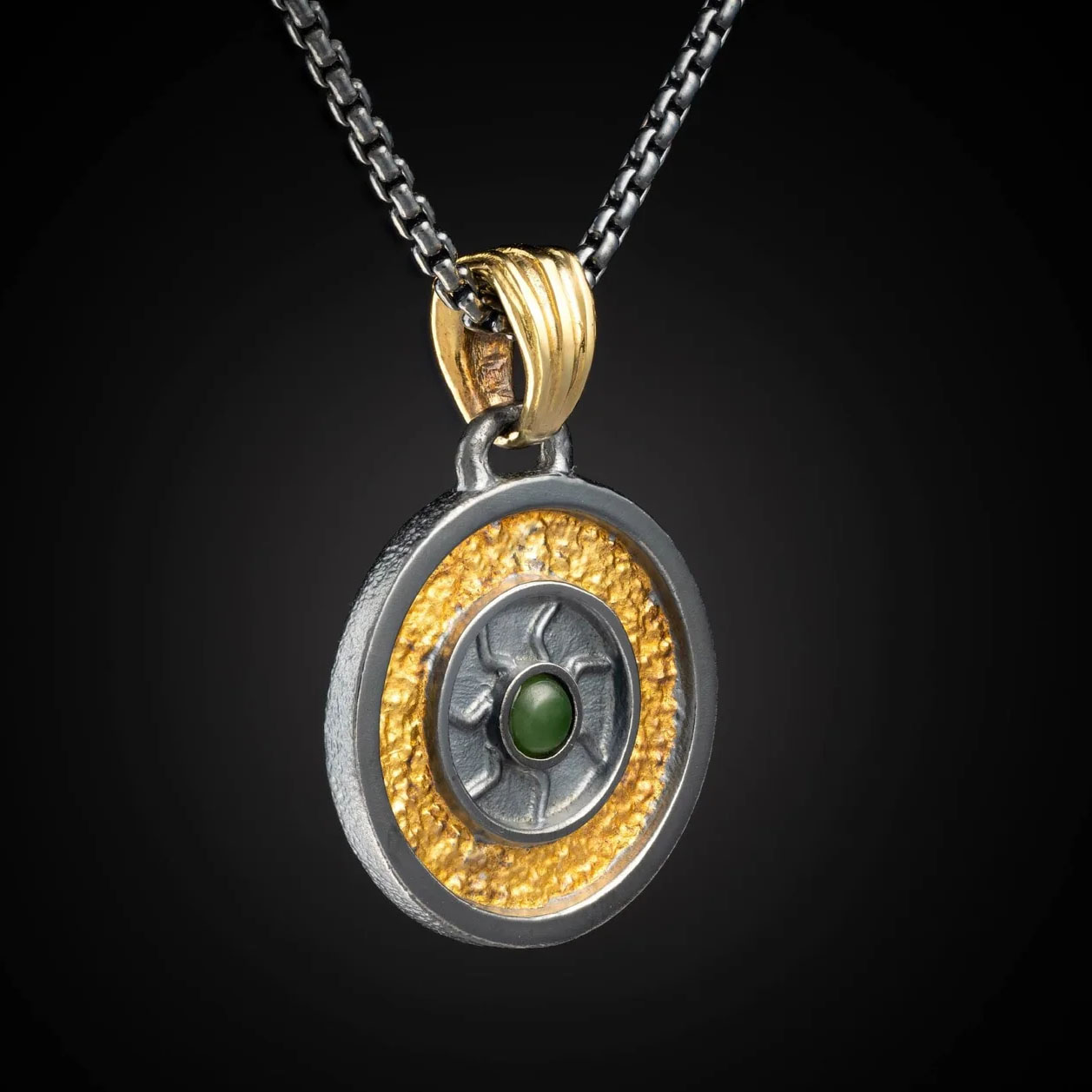 “El Rey”是一款古法纯银吊坠,灵感源自玛雅装饰复兴时期的建筑风格,其特色是一颗绿玉凸圆形宝石,周围环绕着精致的23.5K金饰边和18K纯金吊坠。这些元素将装饰艺术时期的奢华感与受阿兹特克和玛雅文化启发的几何形状完美融合。每一款吊坠都以独特的方式致敬永恒传承与现代设计,邀您以焕然一新的历史装点自己。