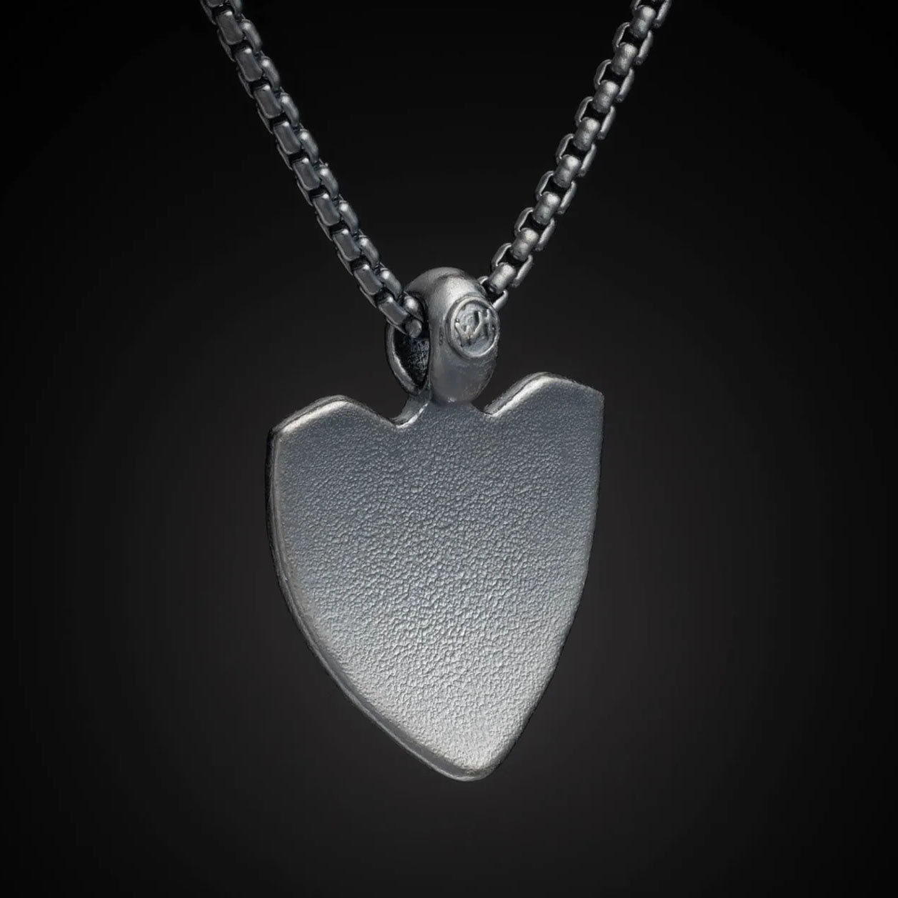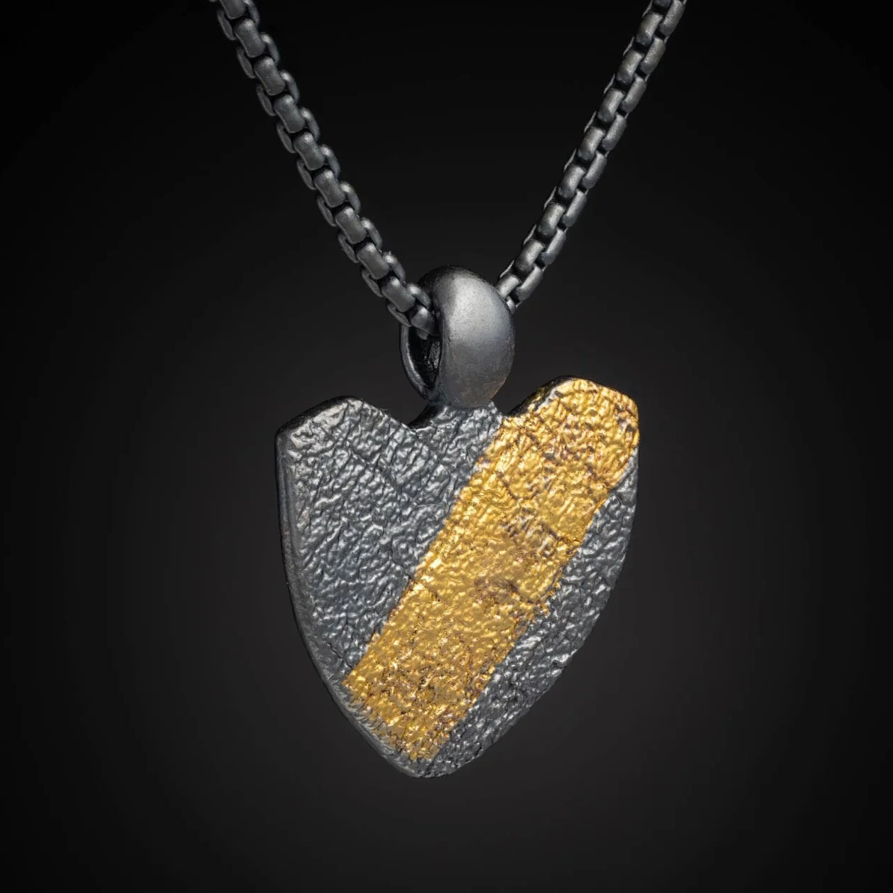 这款盾牌吊坠以古铜色纯银打造,饰有闪亮的 23.5k 金,采用古老的 Keum-Boo 技术将金属结合在一起,展现出力量。