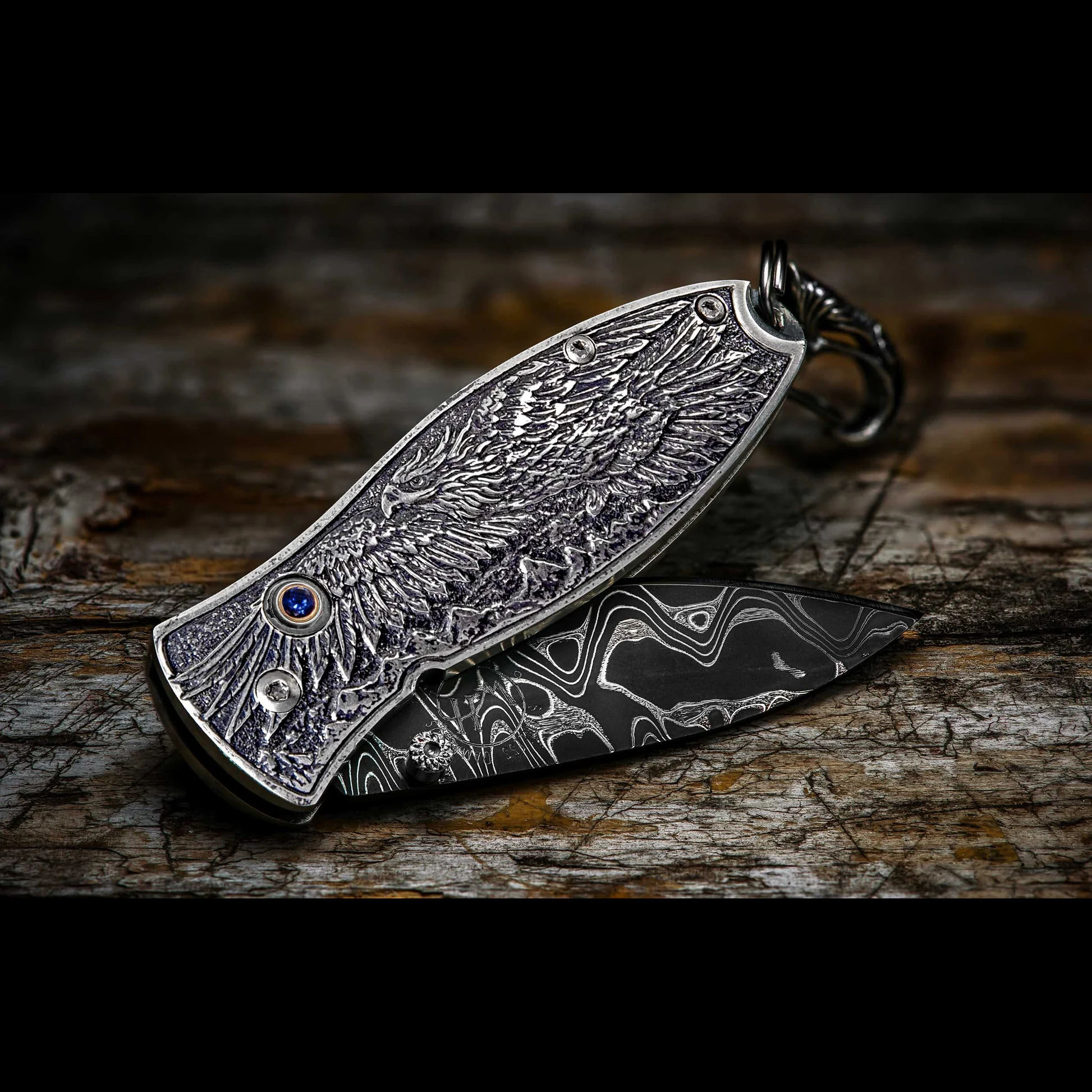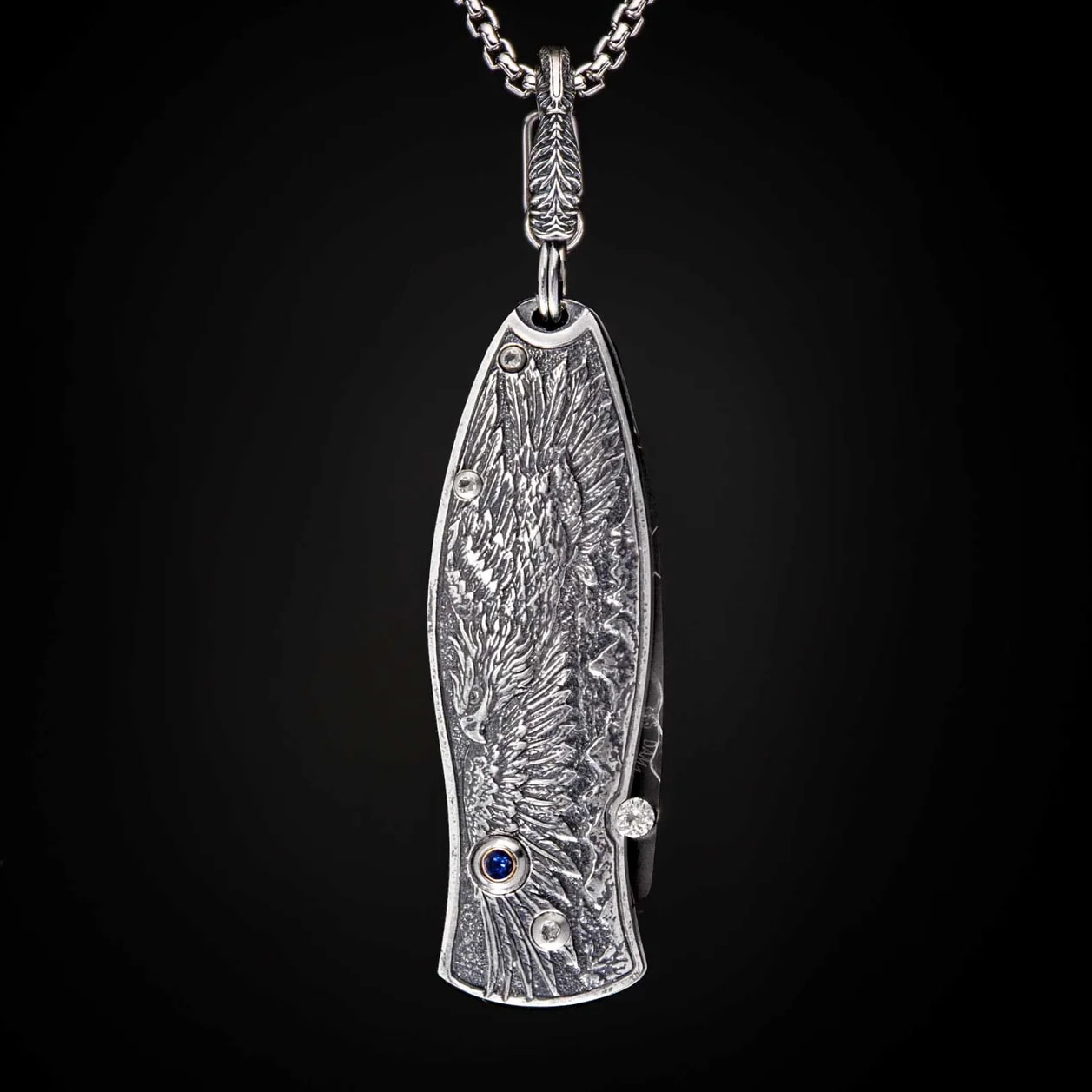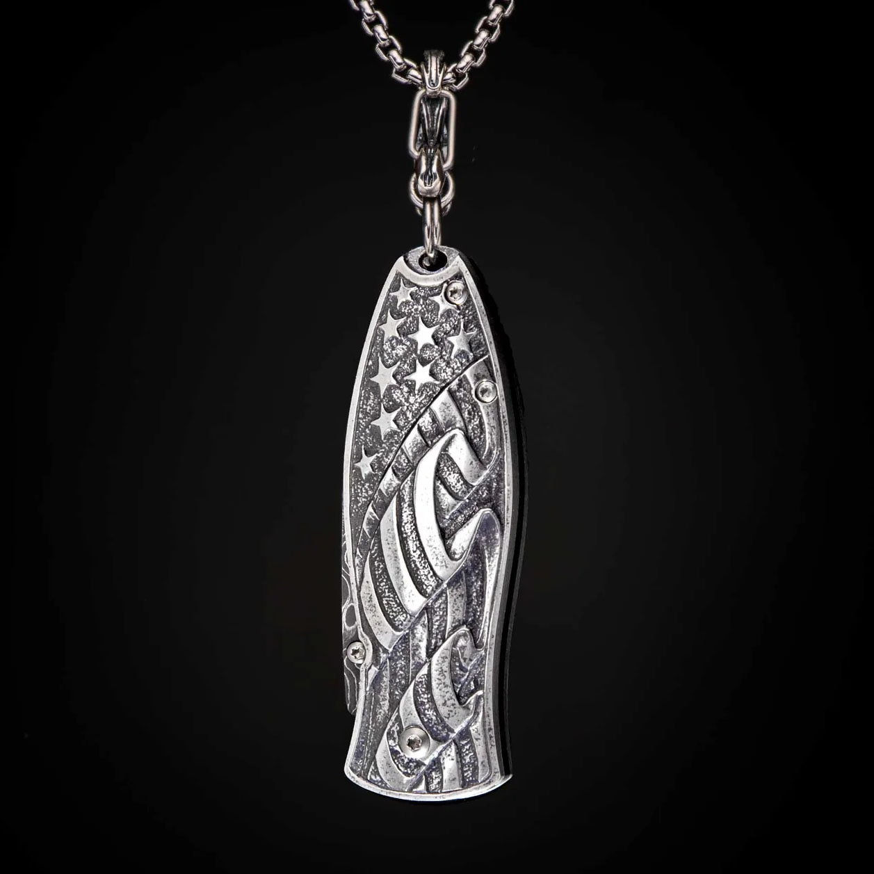 “自由”是一款大胆的纯银吊坠,精心铸造了永恒的美国风情符号,其隐藏的尖端刀片采用“勇敢”大马士革钢制成,由锻造大师查德·尼科尔斯手工锻造,采用数百层不同的合金钢,折叠成独特的织锦图案,令人联想到波浪和流水。一颗引人注目的蓝宝石隐藏着威廉·亨利设计的纽扣锁,确保刀片无论打开还是闭合都能牢固锁定,确保安全佩戴和携带。“自由”搭配纯银链条。快速释放扣也采用纯银材质,方便您将刀从链条上取下使用,或将其挂在钥匙链上。