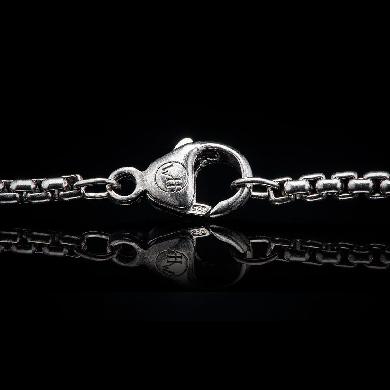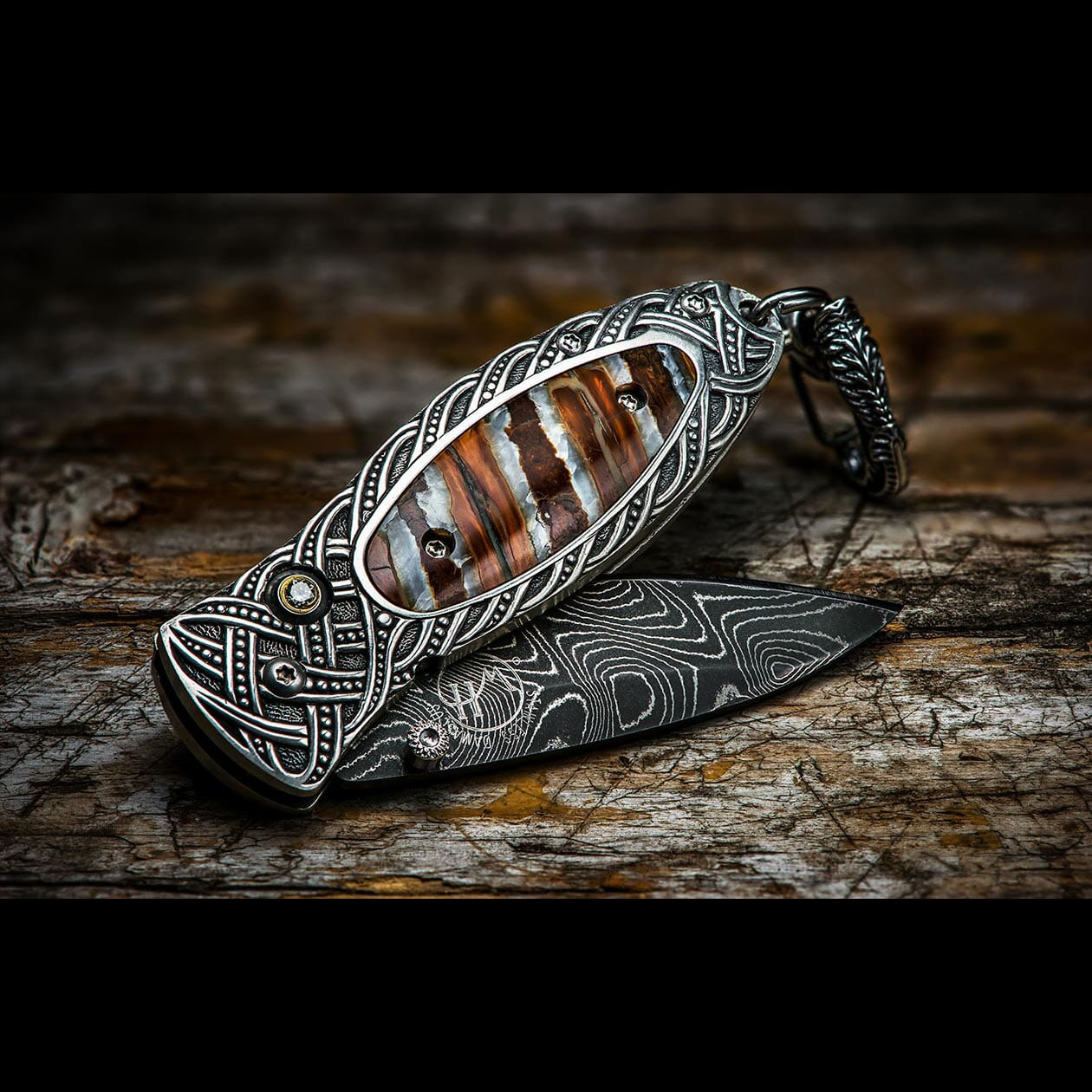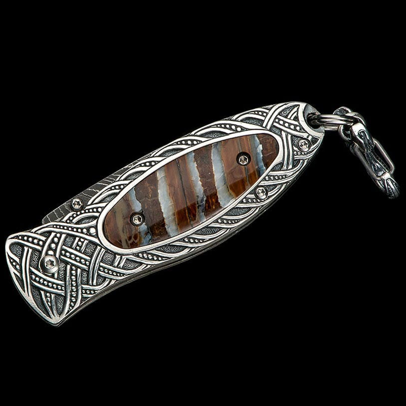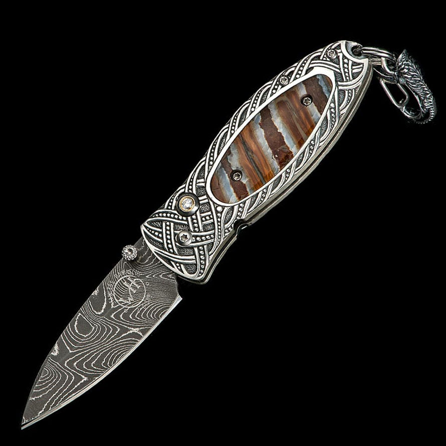 Morpheus 是世界上第一款奢华吊坠刀,可佩戴于颈间或放入口袋。“Galway”是一款醒目的纯银吊坠,镶嵌着一颗距今一万年之久的猛犸象牙齿化石,其隐藏的尖端刀片采用“回旋镖”大马士革钢制成,由查德·尼科尔斯手工锻造,采用数百层不同的合金钢,折叠成独特的织锦图案,令人联想起波浪和流水。白色托帕石隐藏在威廉·亨利设计的纽扣锁内,确保刀片无论打开还是闭合都能牢固锁定,确保安全佩戴和携带。“Galway”搭配纯银链条。快速释放扣也采用纯银材质,方便您将刀从链条上取下使用,或将其挂在钥匙链上。