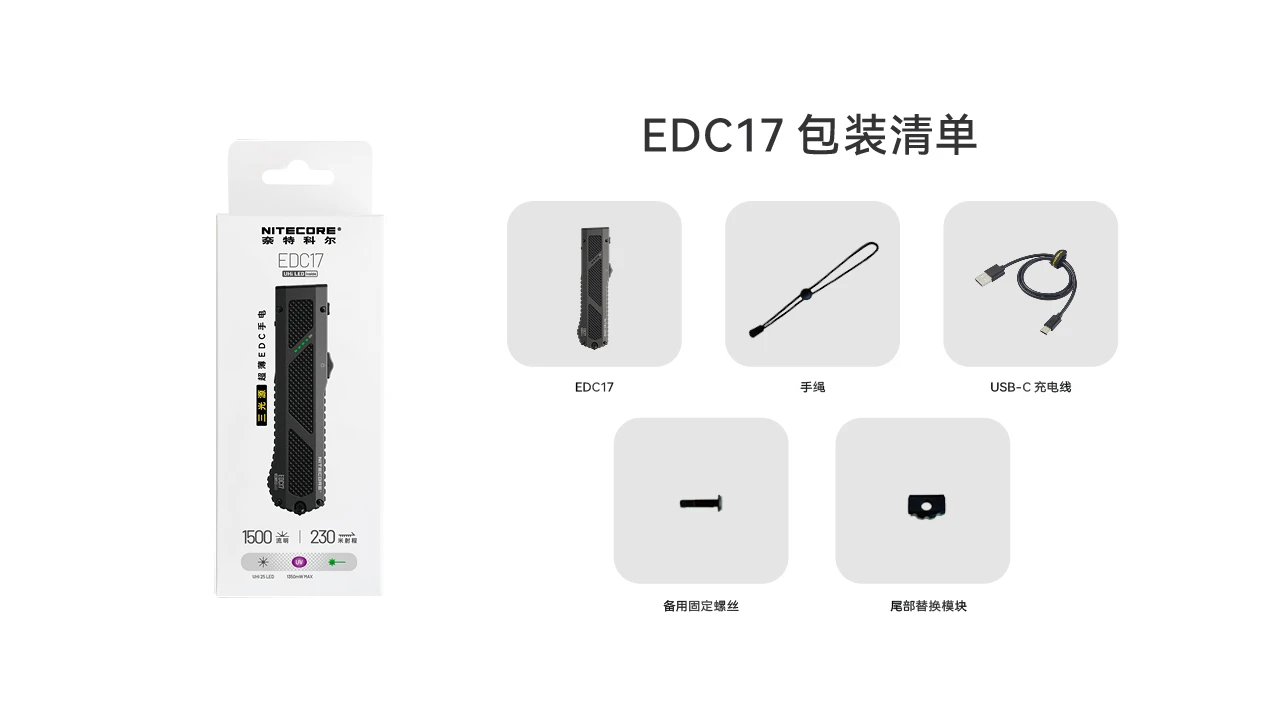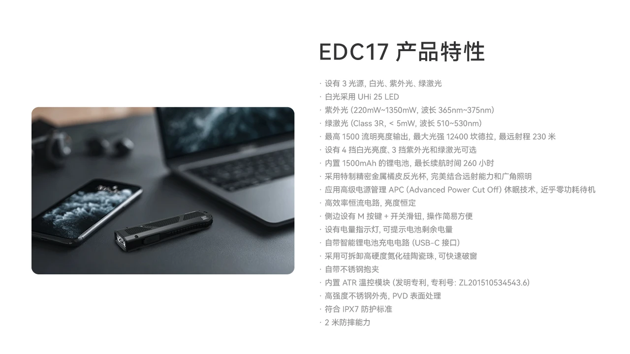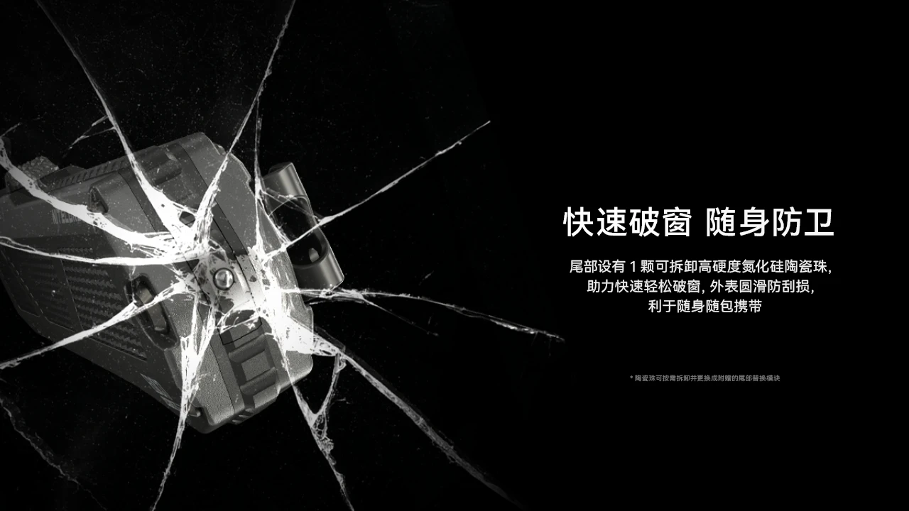 超薄设计和简洁易用的用户界面,用户只需滑动即可开启灯光,按下即可切换模式。此外,EDC17 支持 USB-C 充电,并具备 IPX7 防水等级和 2 米抗冲击能力。可拆卸的高硬度氮化硅陶瓷笔尖可快速轻松地打破玻璃。这些特性使 EDC17 成为工作和日常使用中不可或缺的好帮手。