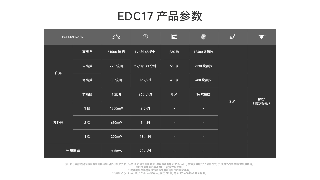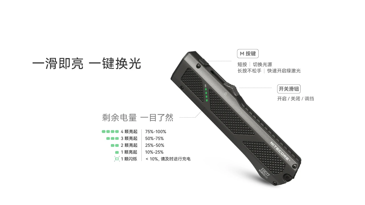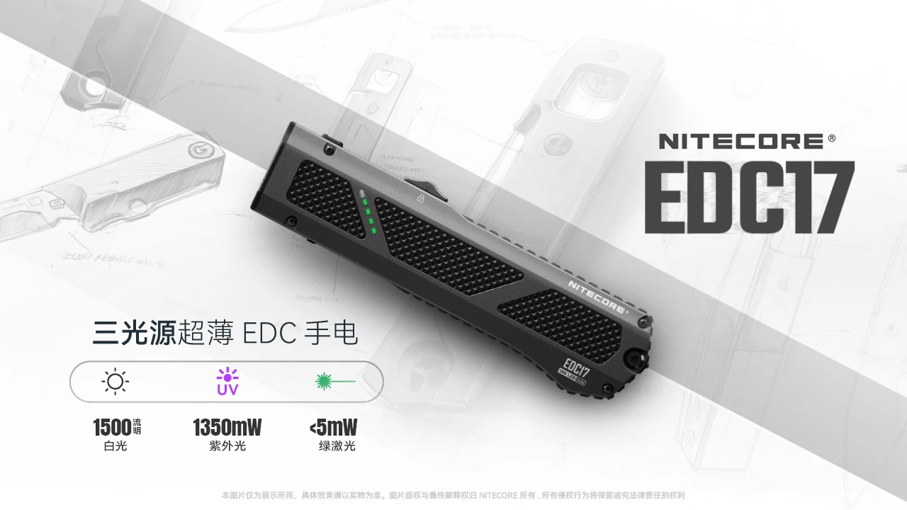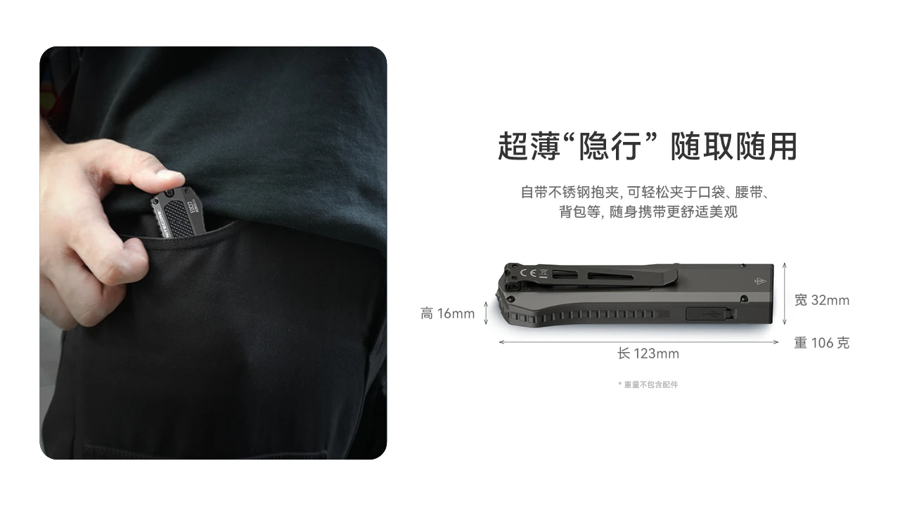 超薄设计和简洁易用的用户界面,用户只需滑动即可开启灯光,按下即可切换模式。此外,EDC17 支持 USB-C 充电,并具备 IPX7 防水等级和 2 米抗冲击能力。可拆卸的高硬度氮化硅陶瓷笔尖可快速轻松地打破玻璃。这些特性使 EDC17 成为工作和日常使用中不可或缺的好帮手。
