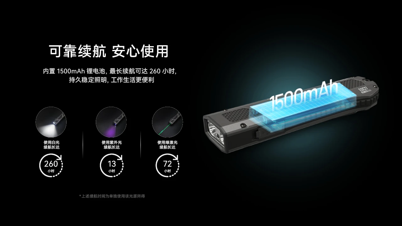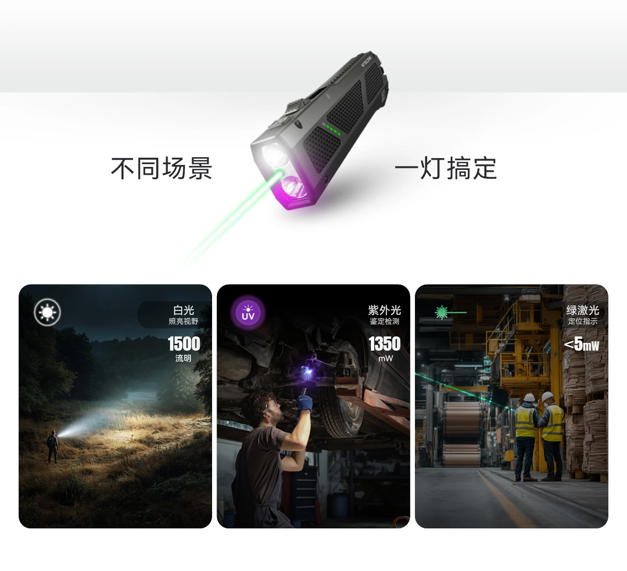EDC17 配备三种光源:白光、紫外线和绿色激光,可满足不同的照明需求。白光最高输出功率为 1,500 流明,并设有 4 个亮度等级。紫外线提供 3 个亮度等级,非常适合真菌感染检测、证件验证、维护和泄漏检测等应用。小于 5mW 的绿色激光明亮且清晰可见,可在多种应用中更高效地传递信息。它可以单独激活,也可以直接与白光配合使用。
