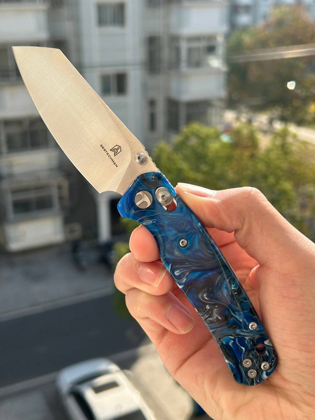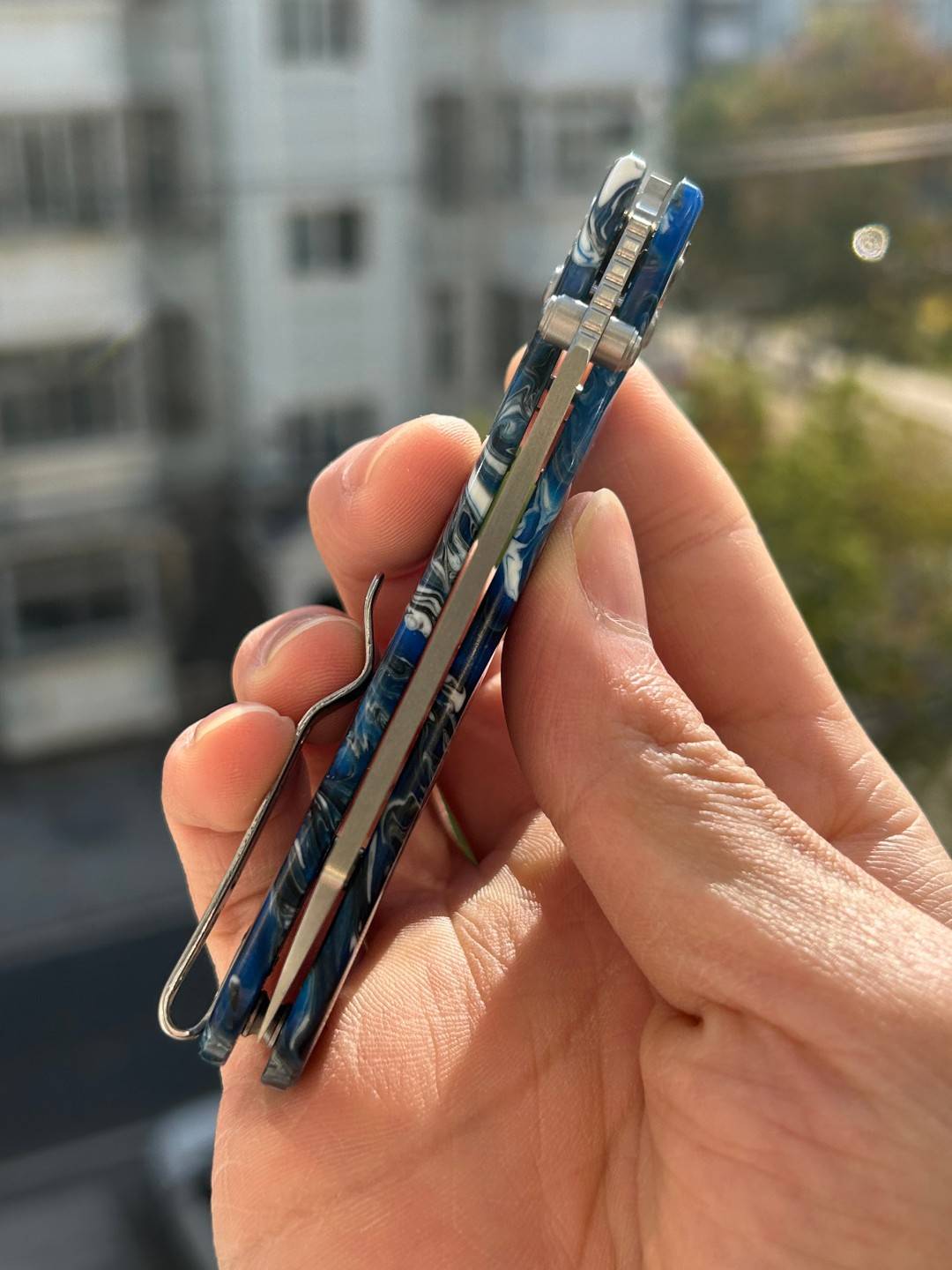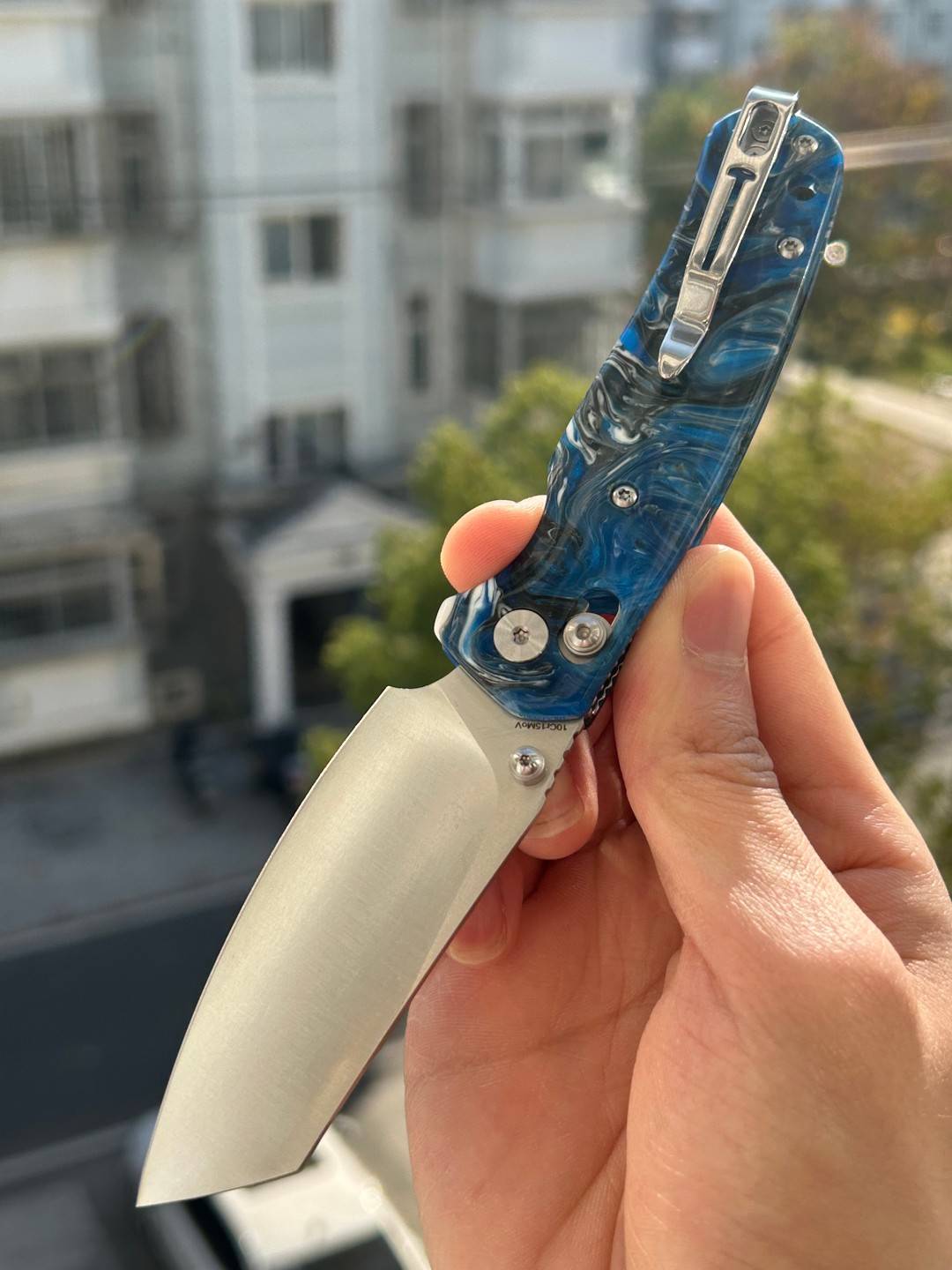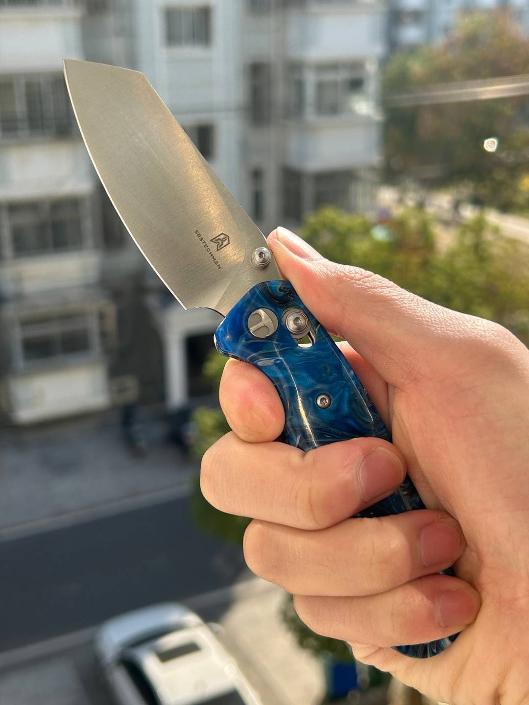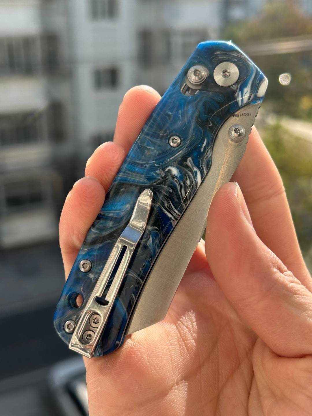 刀片长度:3.15 英寸(80 毫米) 手柄长度:4.055 英寸(103 毫米) 总长度:7.205 英寸(183 毫米) 刀片厚度:0.091 英寸(2.3 毫米) 刀片材质:10Cr15MoV 钢 刀片表面处理:缎面 手柄材质:蓝色图案树脂 锁定机构:B-Lock 刀片硬度:59-61 口袋夹:深携带,左/右携带 刀重量:2.03 盎司(57.5 克) 中国制造