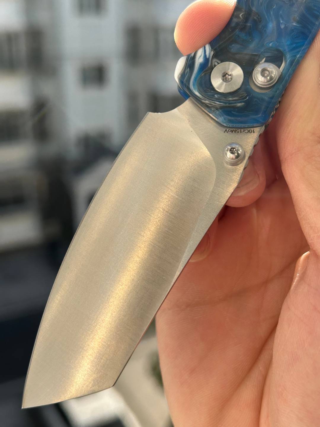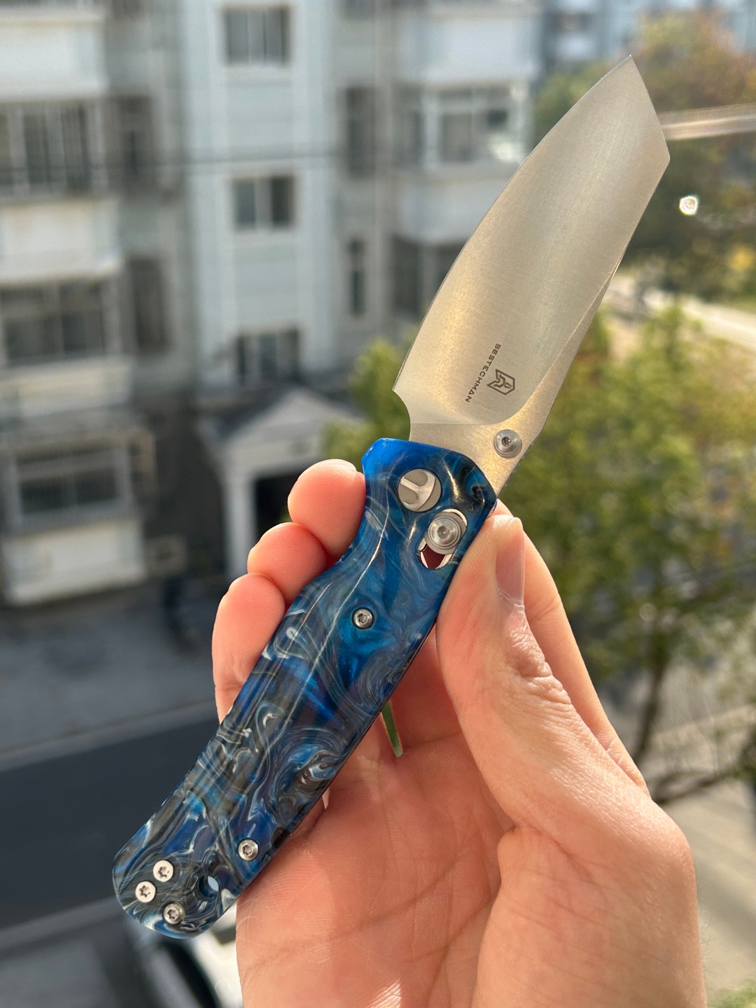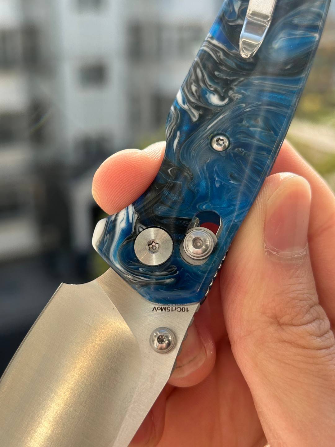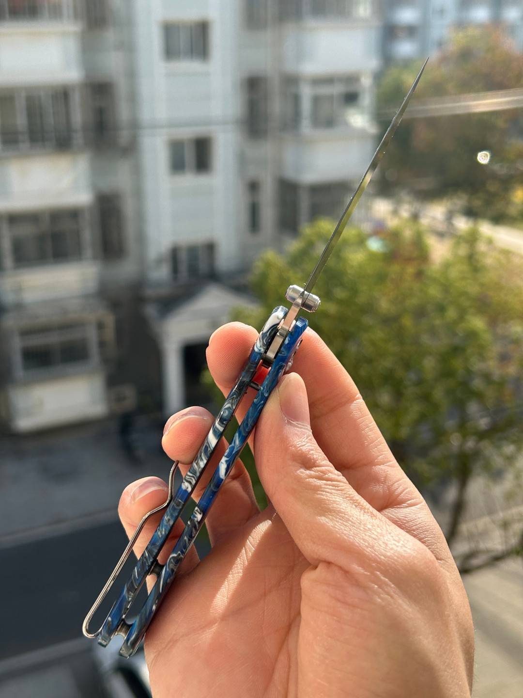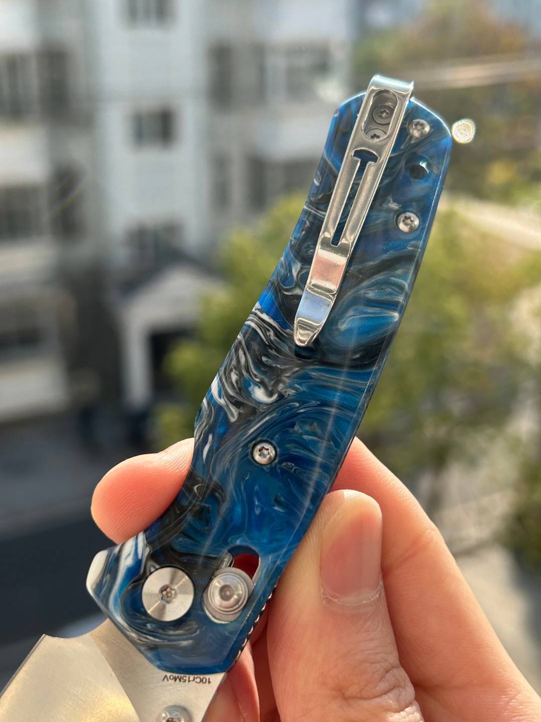 刀片长度:3.15 英寸(80 毫米) 手柄长度:4.055 英寸(103 毫米) 总长度:7.205 英寸(183 毫米) 刀片厚度:0.091 英寸(2.3 毫米) 刀片材质:10Cr15MoV 钢 刀片表面处理:缎面 手柄材质:蓝色图案树脂 锁定机构:B-Lock 刀片硬度:59-61 口袋夹:深携带,左/右携带 刀重量:2.03 盎司(57.5 克) 中国制造