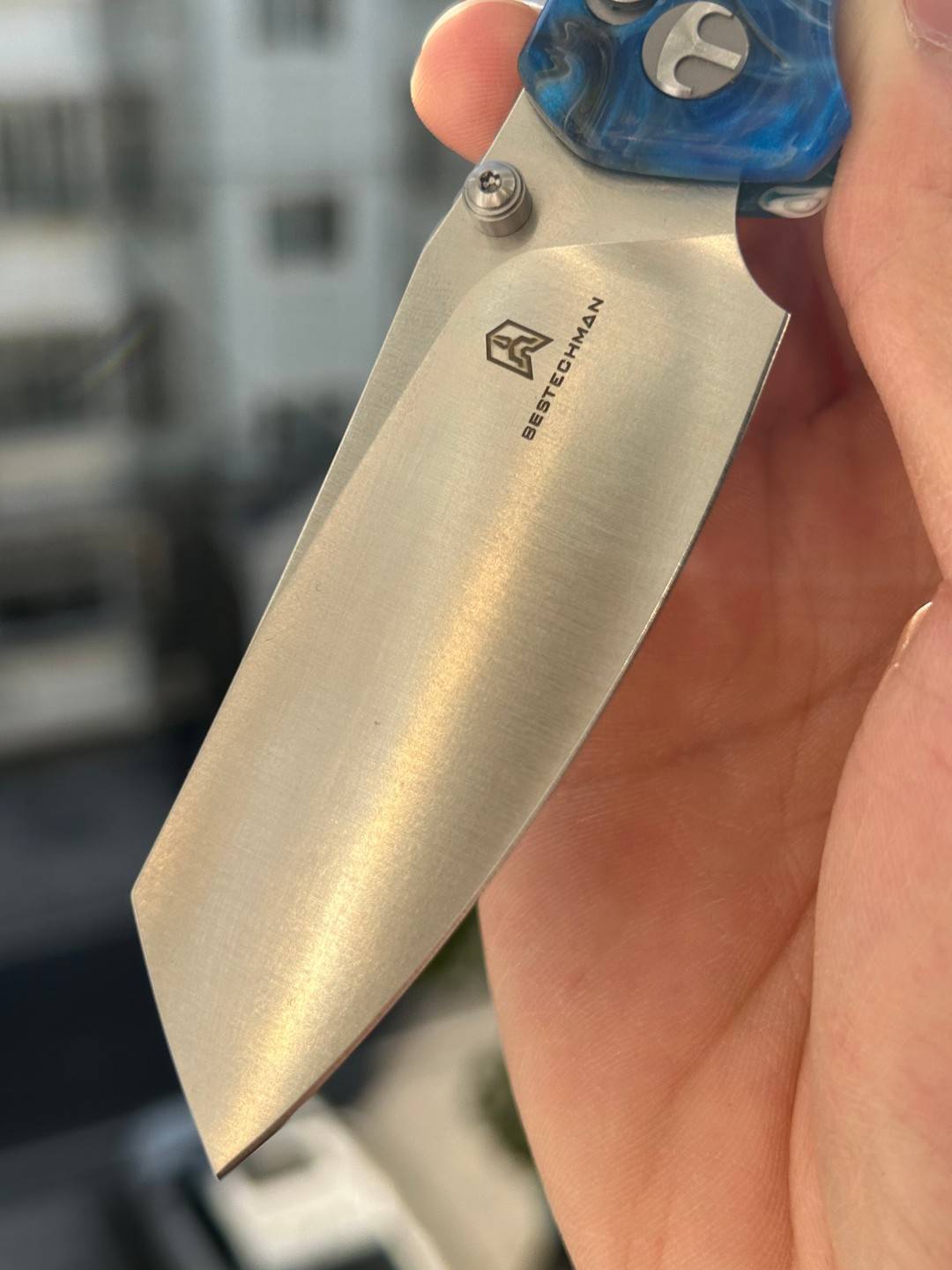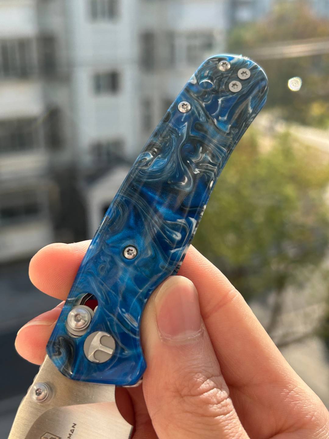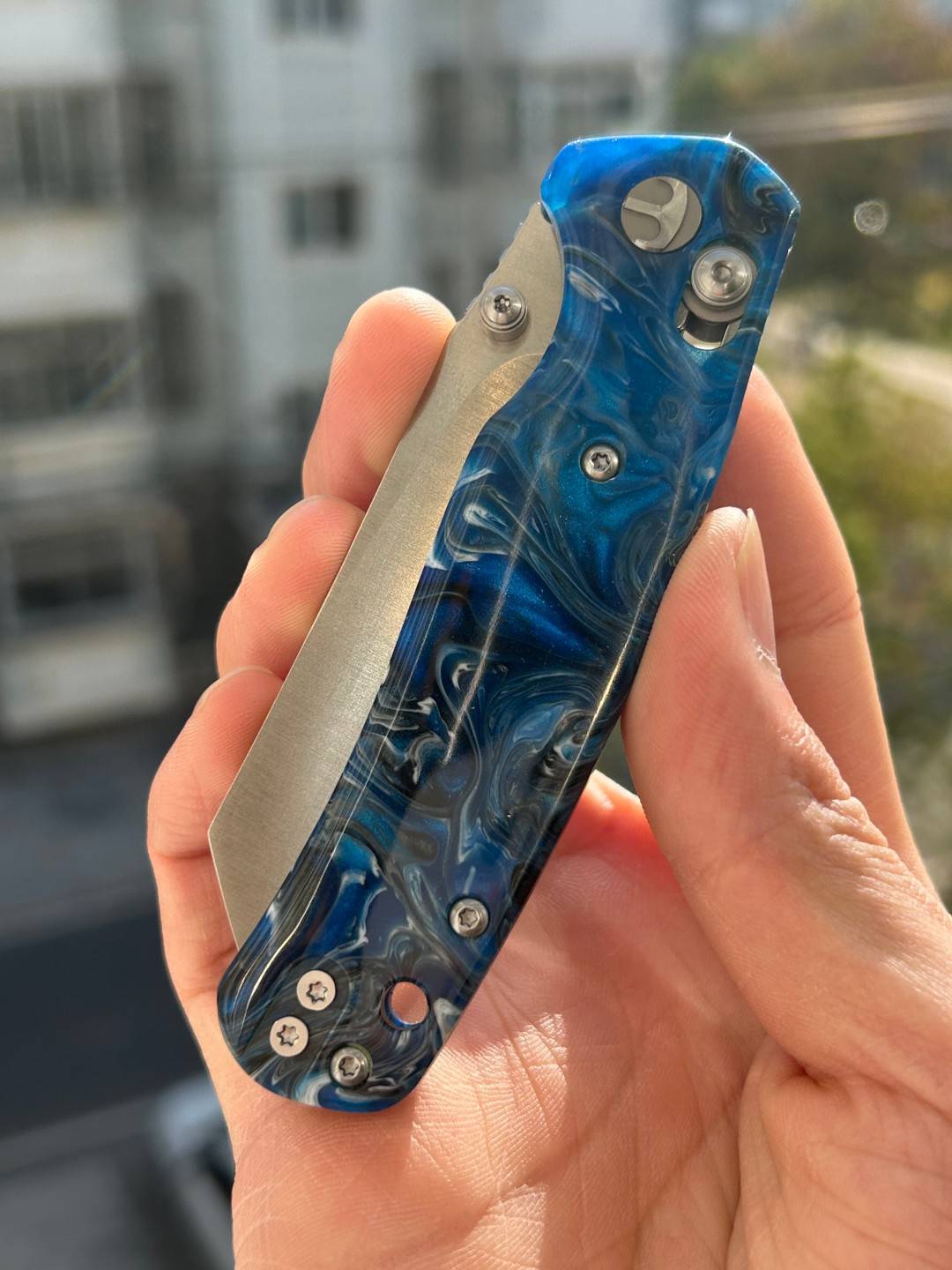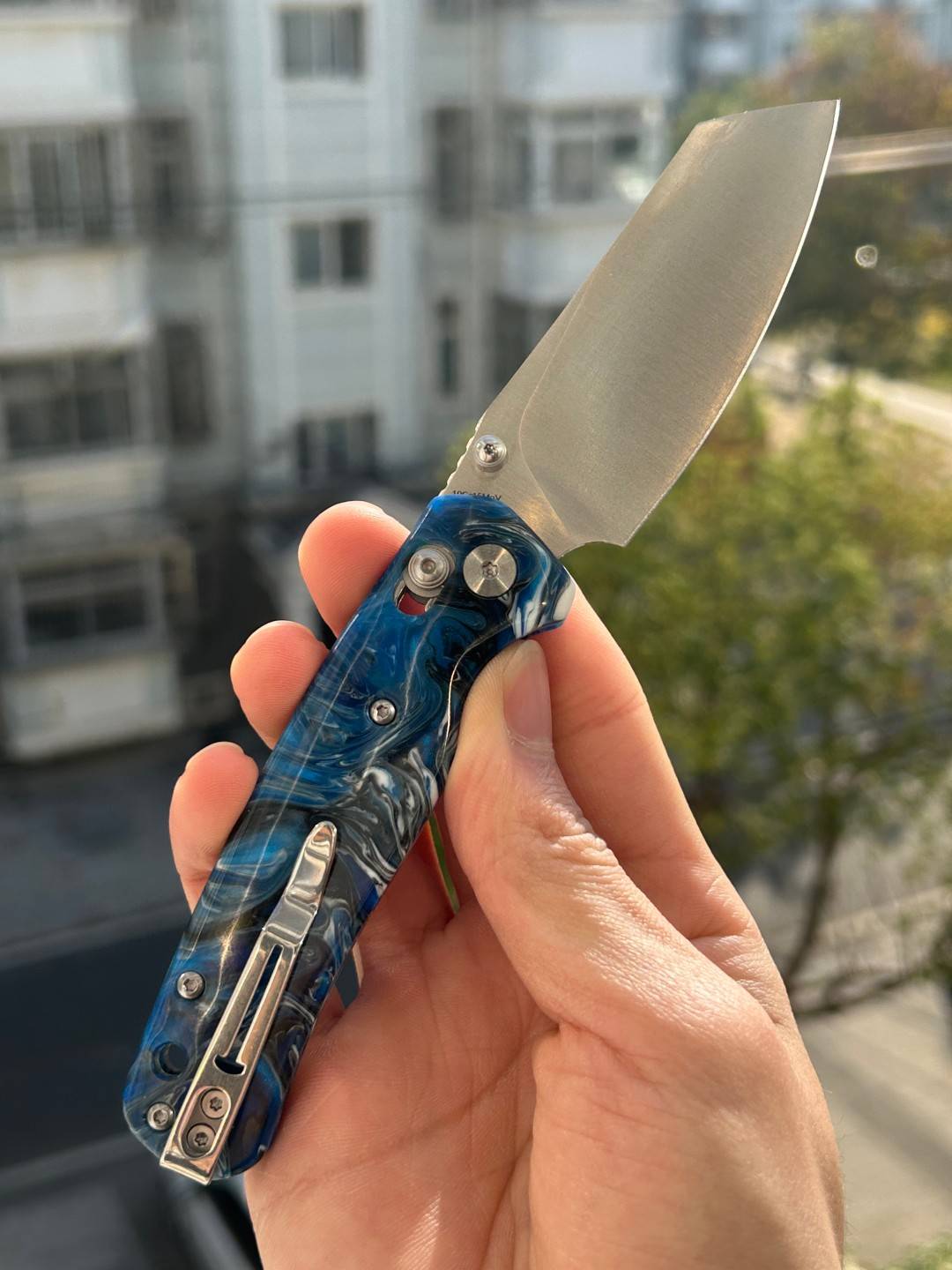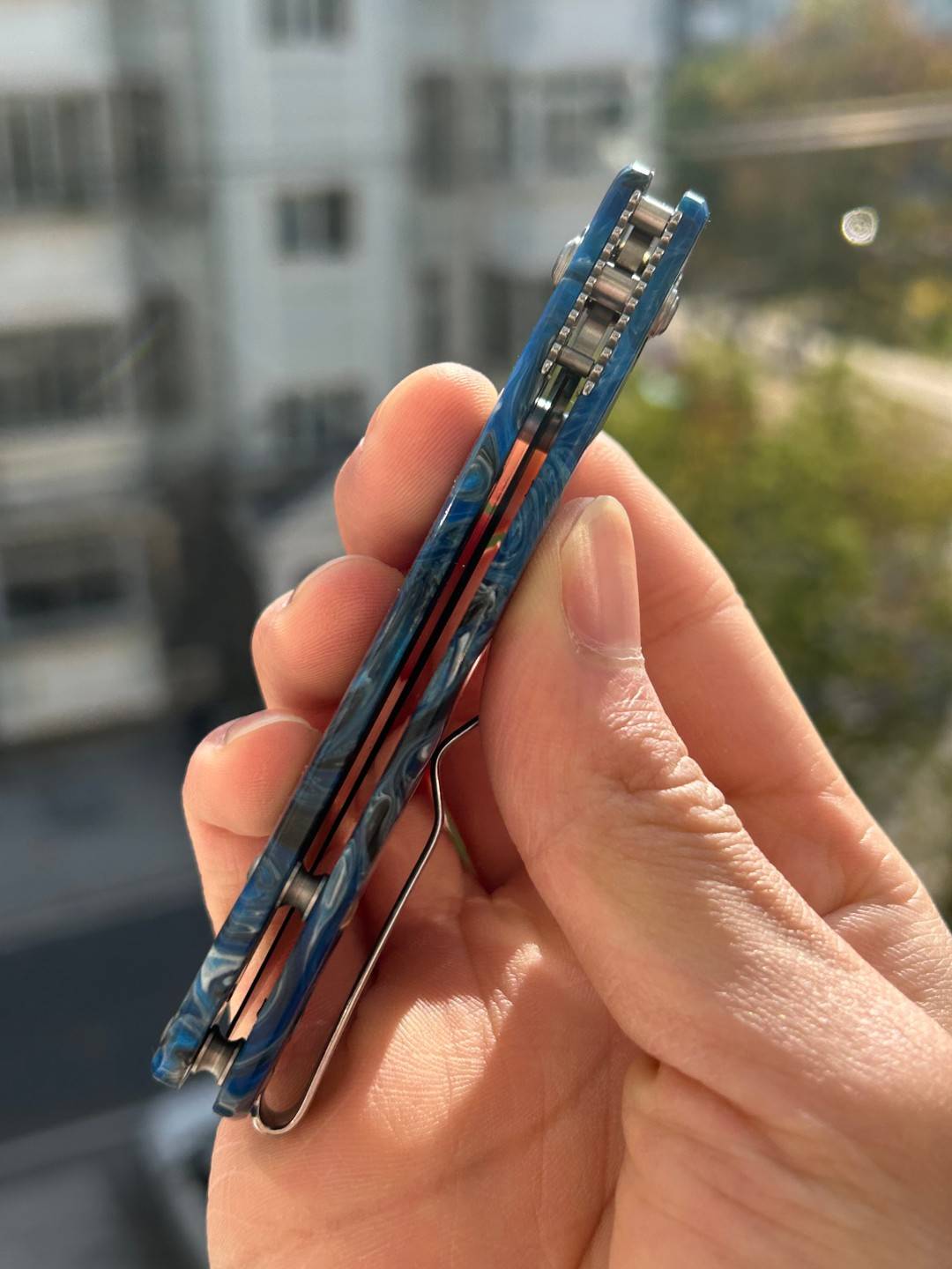 刀片长度:3.15 英寸(80 毫米) 手柄长度:4.055 英寸(103 毫米) 总长度:7.205 英寸(183 毫米) 刀片厚度:0.091 英寸(2.3 毫米) 刀片材质:10Cr15MoV 钢 刀片表面处理:缎面 手柄材质:蓝色图案树脂 锁定机构:B-Lock 刀片硬度:59-61 口袋夹:深携带,左/右携带 刀重量:2.03 盎司(57.5 克) 中国制造