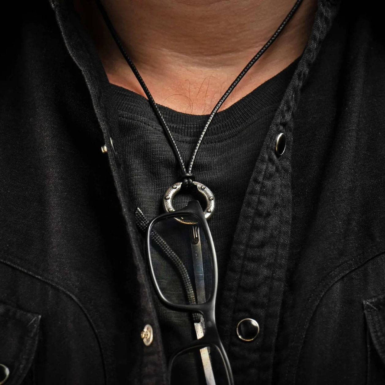 Orbit的设计理念简洁明了,既是一件优雅的珠宝饰品,也是收纳太阳镜或老花镜的完美之选。这款Orbit采用纯银材质,饰以醒目的铆钉图案,与柔和的纹理背景相得益彰。它搭配一条精致的皮革绳,并配有纯银钩扣。这款Orbit的早期原型由设计师Matt Conable佩戴数年,其造型和功能都备受赞誉,我们很高兴最终将其纳入我们的产品线。