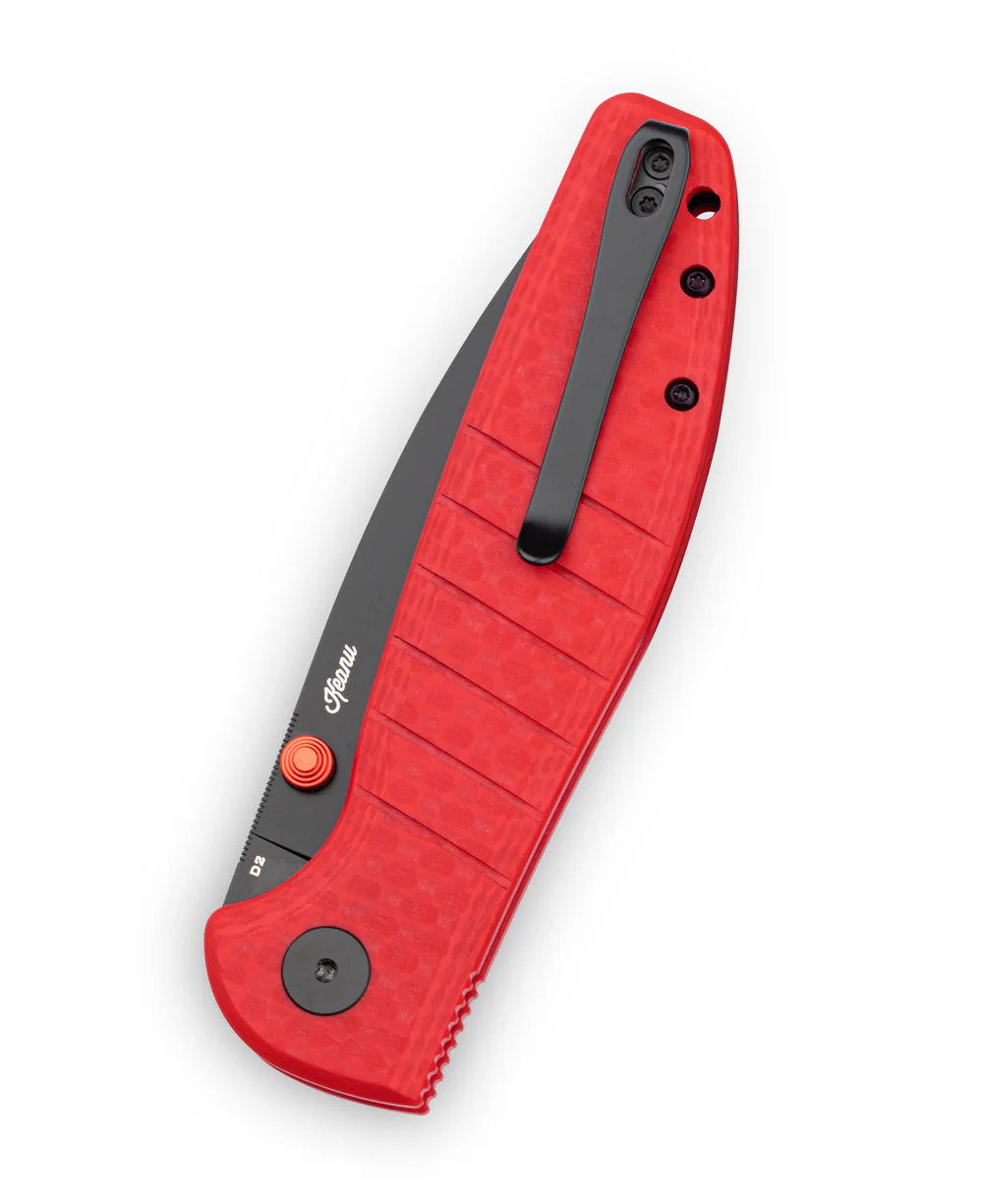 刀片长度:3.54 英寸(90 毫米) 手柄长度:4.65 英寸(118 毫米) 总长度:8.19 英寸(208 毫米) 刀片厚度:0.138 英寸(3.5 毫米) 刀片材质:D2 钢 刀片表面处理:黑色 PVD 手柄材质:红色 G10 锁定机构:按钮锁 口袋夹:深携带,左/右携带 重量:98.2 克