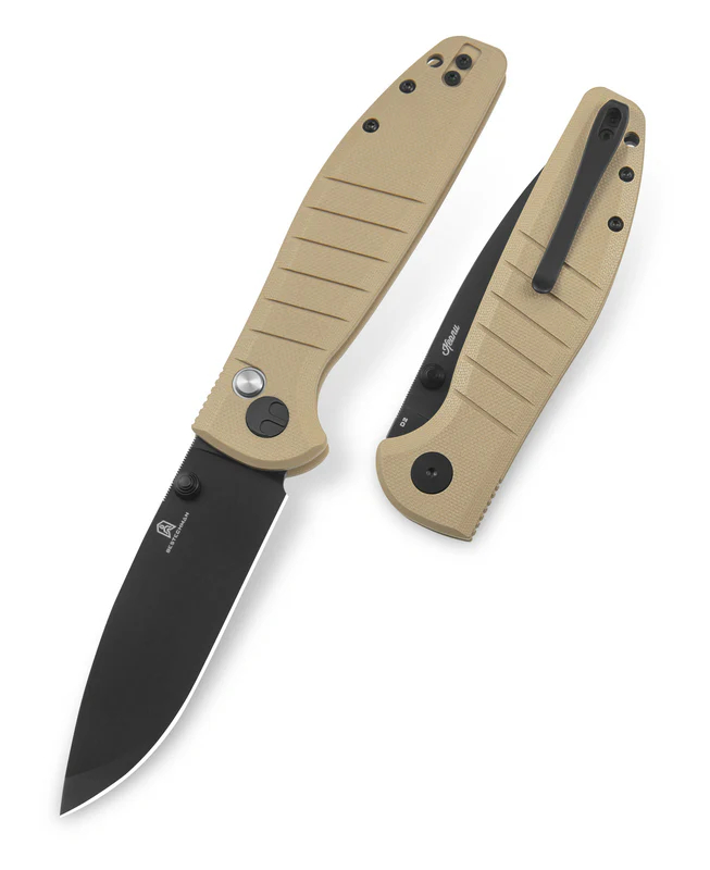 刀片长度:3.54 英寸(90 毫米) 手柄长度:4.65 英寸(118 毫米) 总长度:8.19 英寸(208 毫米) 刀片厚度:0.138 英寸(3.5 毫米) 刀片材质:D2 钢 刀片表面处理:黑色 PVD 手柄材质:卡其色 G10 锁定机构:按钮锁 口袋夹:深携带,左/右 携带重量:98.2 克 设计师:Keanu 中国制造