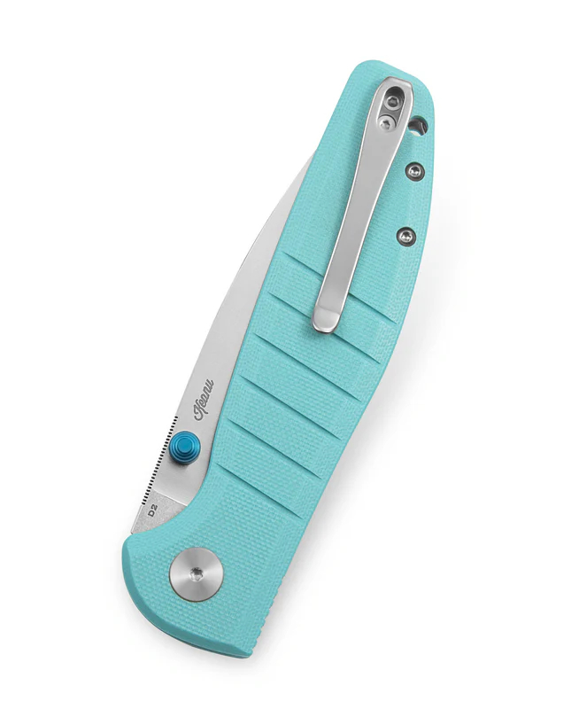 刀片长度:3.54 英寸(90 毫米) 手柄长度:4.65 英寸(118 毫米) 总长度:8.19 英寸(208 毫米) 刀片厚度:0.138 英寸(3.5 毫米) 刀片材质:D2 钢 刀片表面处理:平缎 + 石洗 手柄材质:浅蓝色 G10 锁定机制:按钮锁 口袋夹:深携带,左/右携带 重量:98.2 克 设计师:Keanu 中国制造