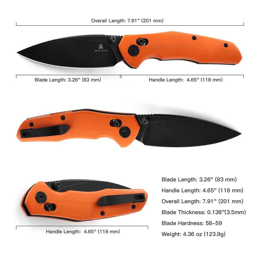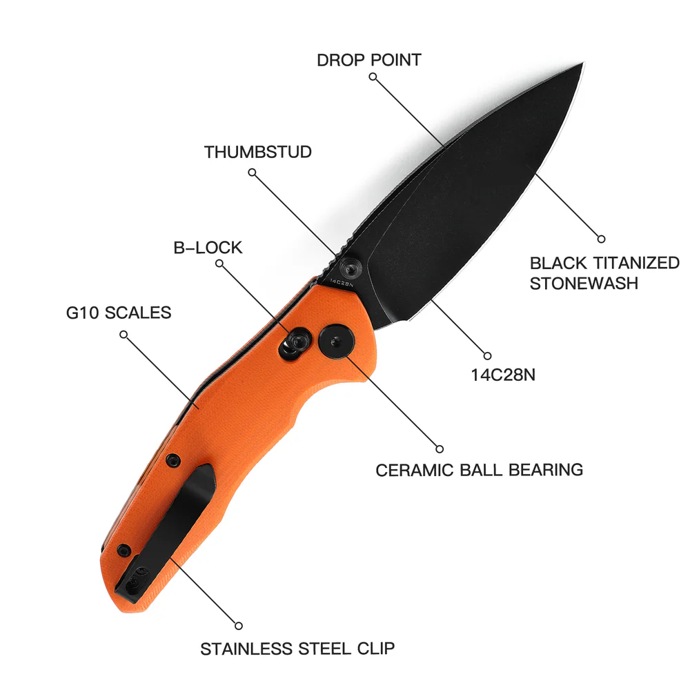 刀片长度:3.26 英寸(83 毫米) 手柄长度:4.65 英寸(118 毫米) 总长度:7.91 英寸(201 毫米) 刀片厚度:0.138 英寸(3.5 毫米) 刀片材质:14C28N 钢 刀片表面处理:黑色石洗 手柄材质:橙色 G10 锁定机构:B-Lock 刀片硬度:58-59 口袋夹:迷你深承载 重量:4.36 盎司(123.9 克) 中国制造
