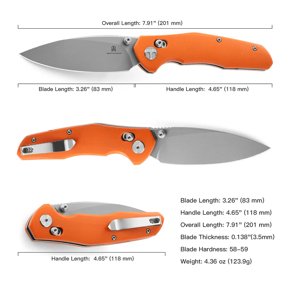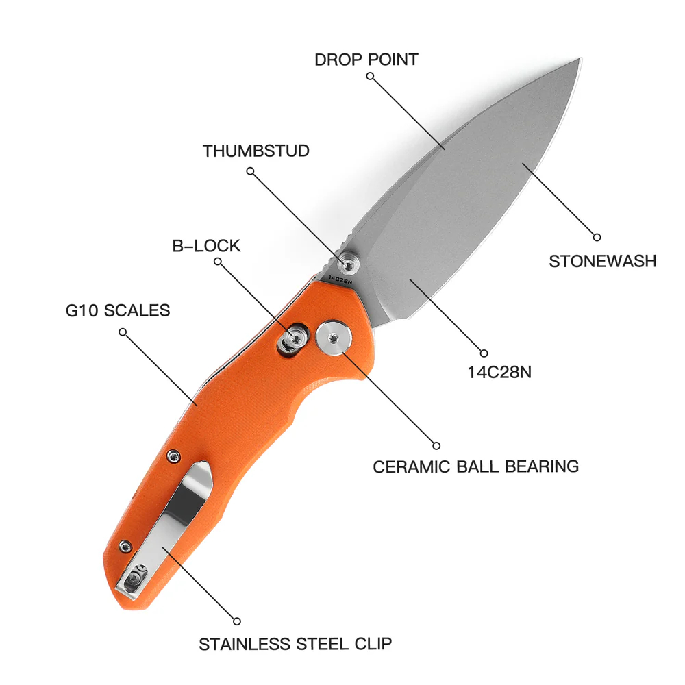 刀片长度:3.26 英寸(83 毫米) 手柄长度:4.65 英寸(118 毫米) 总长度:7.91 英寸(201 毫米) 刀片厚度:0.138 英寸(3.5 毫米) 刀片材质:14C28N 钢 刀片表面处理:石洗 手柄材质:橙色 G10 锁定机构:B-Lock 刀片硬度:58-59 口袋夹:迷你深承载 重量:4.36 盎司(123.9 克) 中国制造