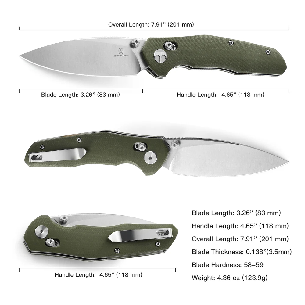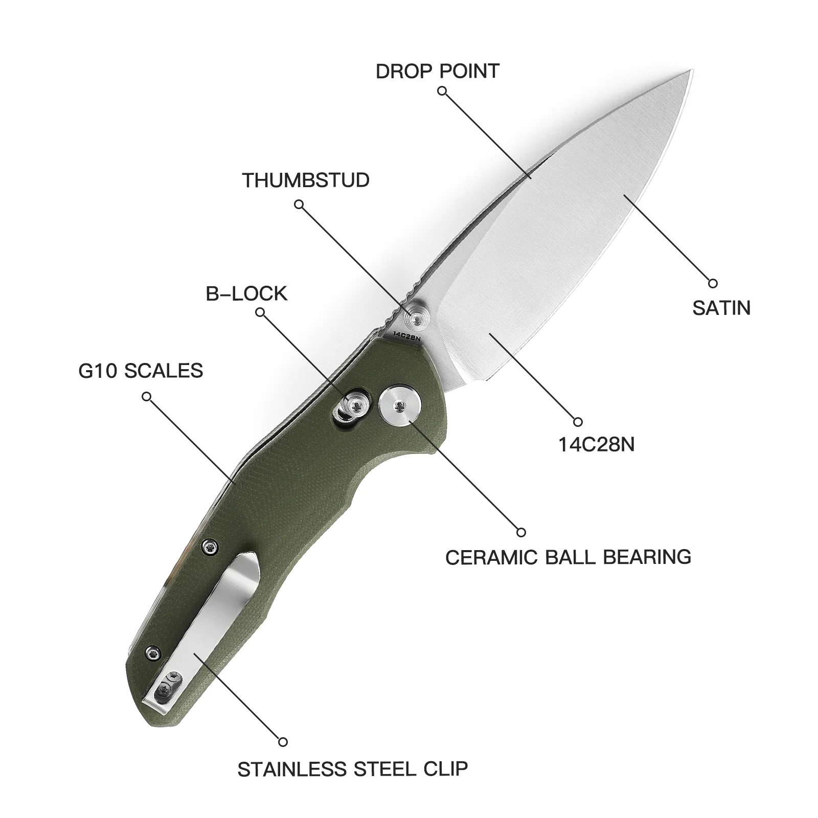 刀片长度:3.26 英寸(83 毫米) 手柄长度:4.65 英寸(118 毫米) 总长度:7.91 英寸(201 毫米) 刀片厚度:0.138 英寸(3.5 毫米) 刀片材质:14C28N 钢 刀片表面处理:缎面 手柄材质:OD 绿色 G10 锁定机构:B-Lock 刀片硬度:58-59 口袋夹:迷你深承载 重量:4.36 盎司(123.9 克) 中国制造