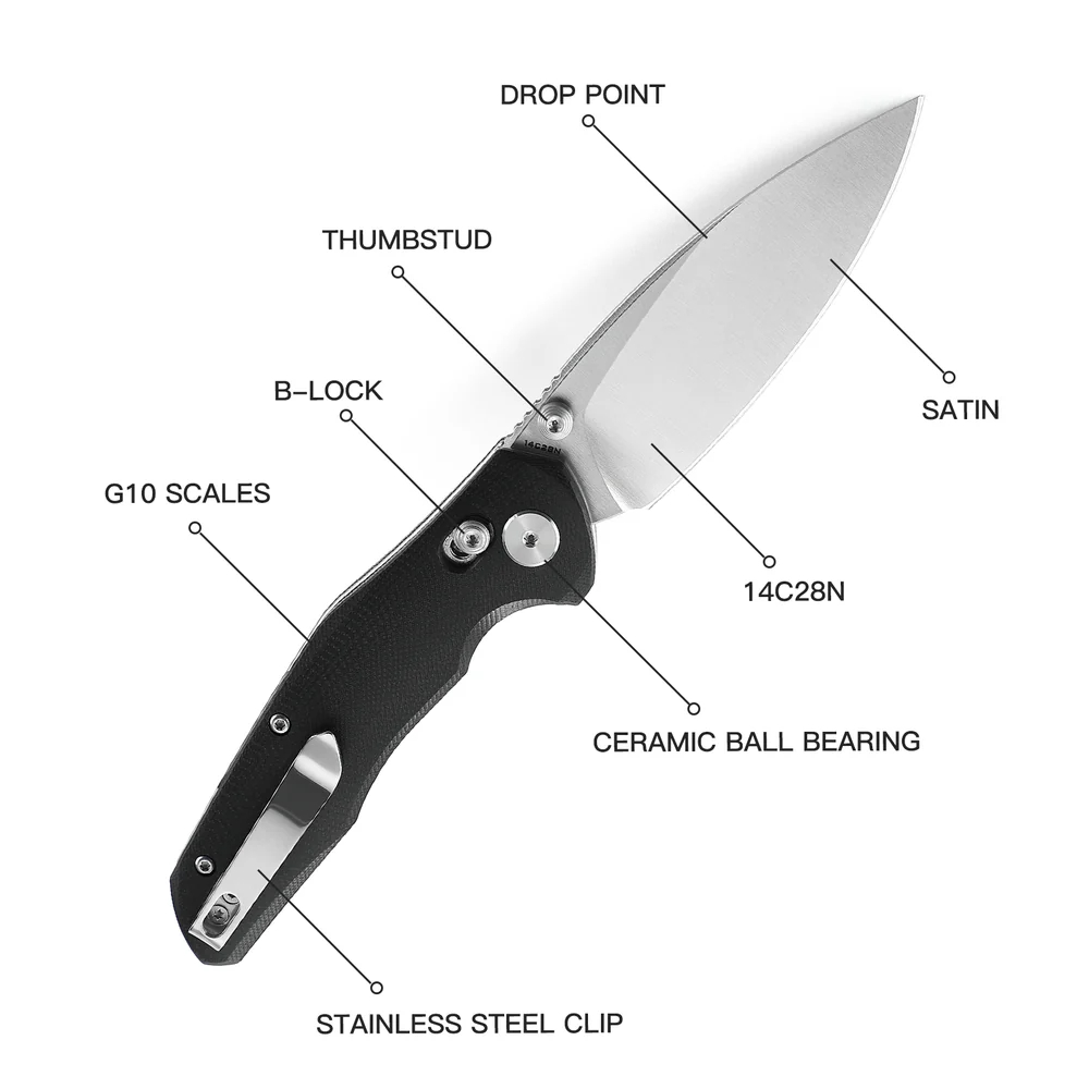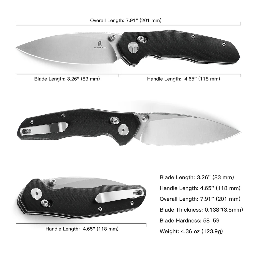 刀片长度:3.26 英寸(83 毫米) 手柄长度:4.65 英寸(118 毫米) 总长度:7.91 英寸(201 毫米) 刀片厚度:0.138 英寸(3.5 毫米) 刀片材质:14C28N 钢 刀片表面处理:缎面 手柄材质:黑色 G10 锁定机构:B-Lock 刀片硬度:58-59 口袋夹:迷你深承载 重量:4.36 盎司(123.9 克) 中国制造