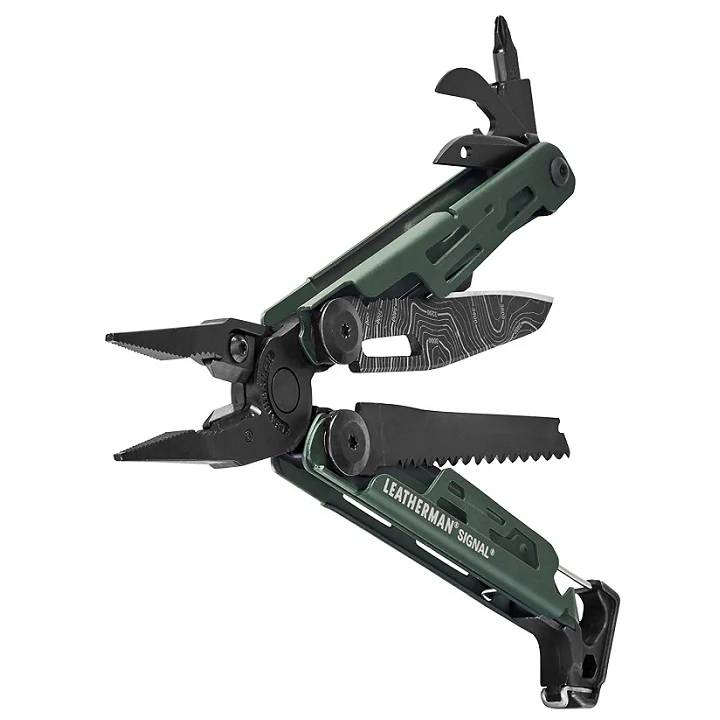 这款专为户外设计的多功能工具集打火棒、锤子、单手刀片和紧急哨于一体。现推出全新黑色款,刀片上饰有地形图图案。Signal 多功能工具完美契合各种探险需求,将 19 种实用工具集成于仅 4.5 英寸的紧凑尺寸之中。它配备打火棒、420HC 复合刀片和紧急哨,助您应对突发状况。使用可定制的螺丝刀头拧紧装备,用内置锤子固定帐篷地钉。刀片上激光蚀刻有地形图图案。装备齐全,带上 Leatherman Signal,探索更远的地方。