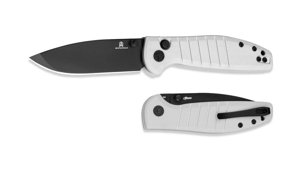 刀片长度:2.83 英寸(72 毫米) 手柄长度:4.05 英寸(103 毫米) 总长度:6.88 英寸(175 毫米) 刀片厚度:0.11 英寸(2.8 毫米) 刀片材质:D2 钢 刀片表面处理:黑色 PVD 手柄材质:白色 G10 锁定机构:按钮锁 口袋夹:深携带,左右携带 重量:71g 设计师:Keanu 中国制造
