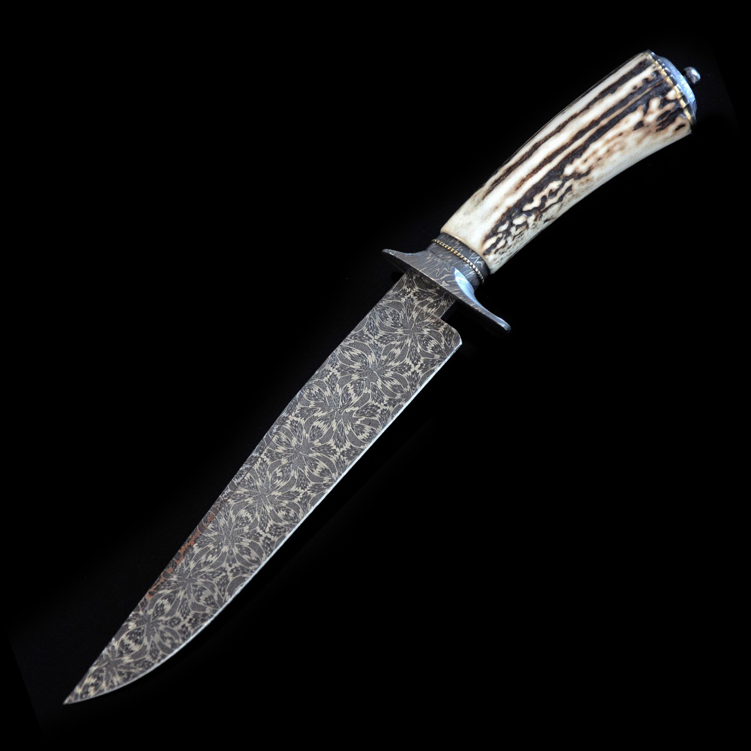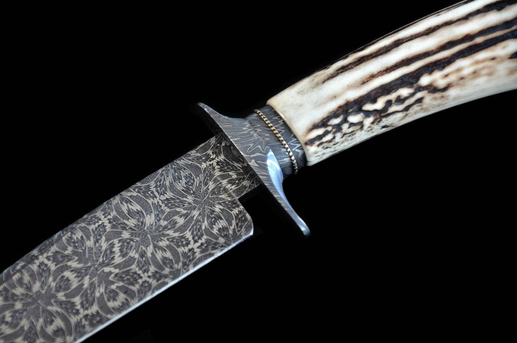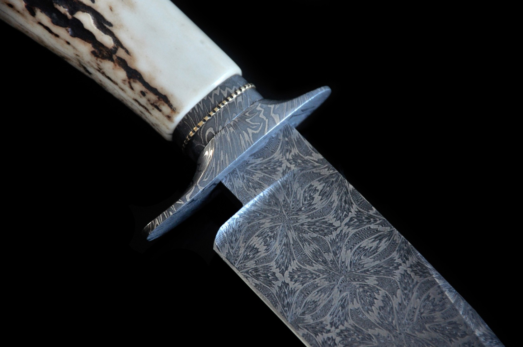 Jimmy Yang 手工定制博伊刀,Yang 拥有十多年年的定制刀具经验,擅长制作美式传统直刀,其中最拿手的便是博伊刀制作,曾为中国以及欧美国家刀具经销商OEM定制刀具,并且深受好评。此件作品是标准的绅士博伊刀款,刀刃采用瑞典15n20+O1锻打的大马士革钢制作而成,花纹如同四瓣花瓣展开,连贯动感,张力十足,极具美感。护手也采用同等大马士革钢材质。手柄采用水鹿角材质,光滑细腻,握感饱满舒适。精美的锉花尾铁打磨成经典花瓣外形,优雅别致。带有原配的手工定制刀鞘,无论收藏还是使用甚至礼品都是不错的产品。