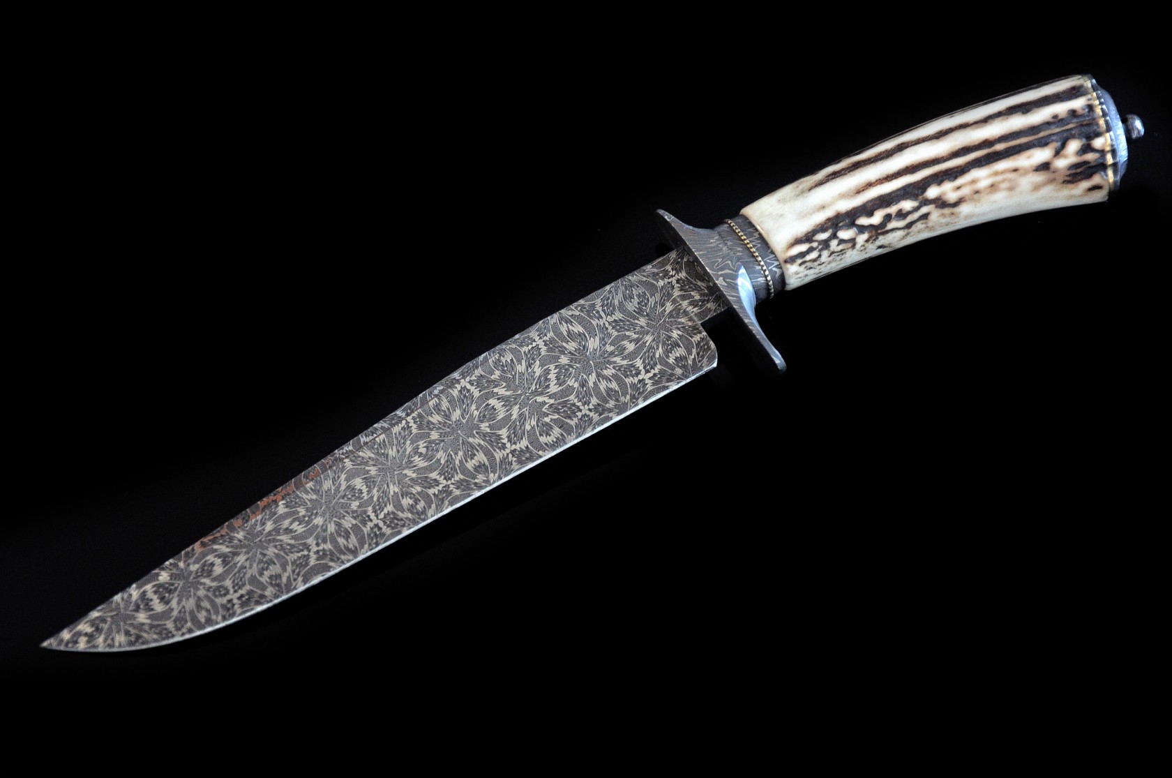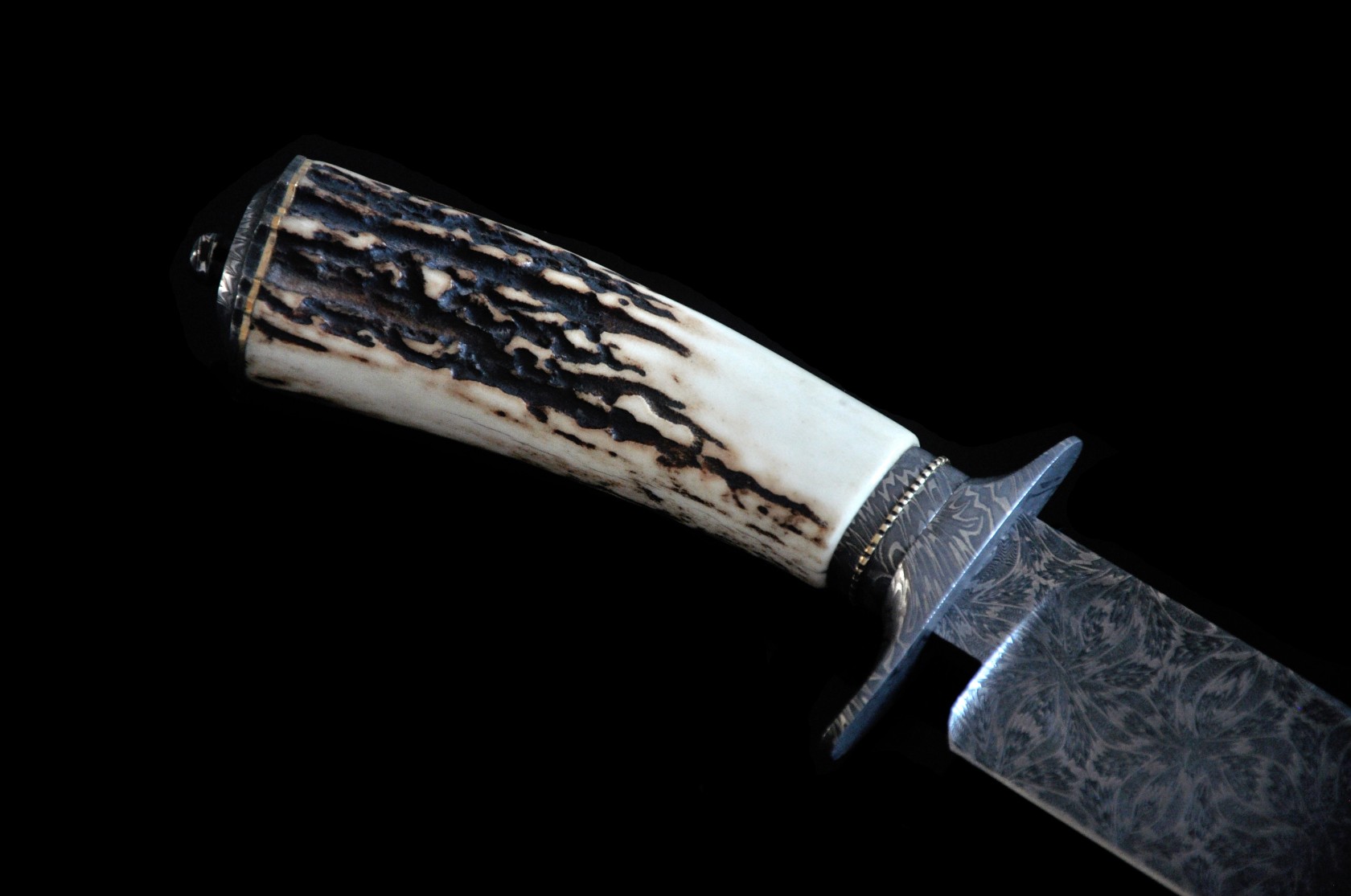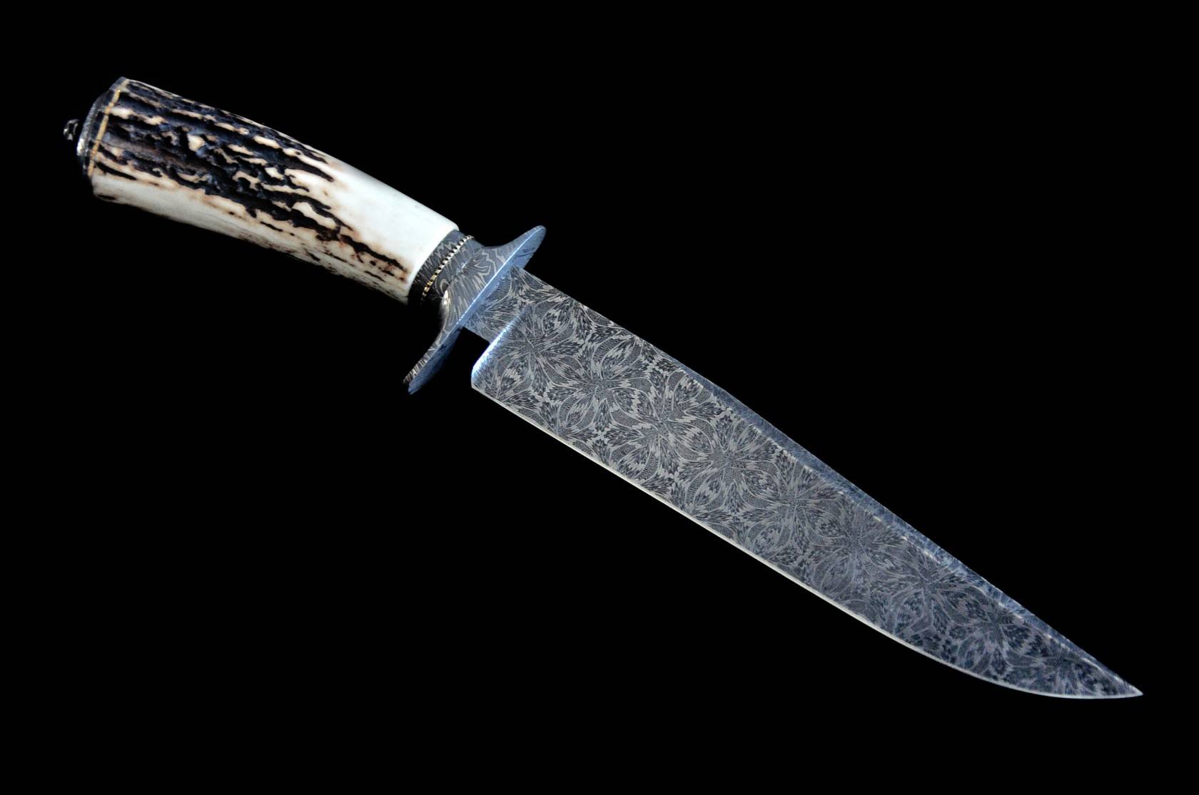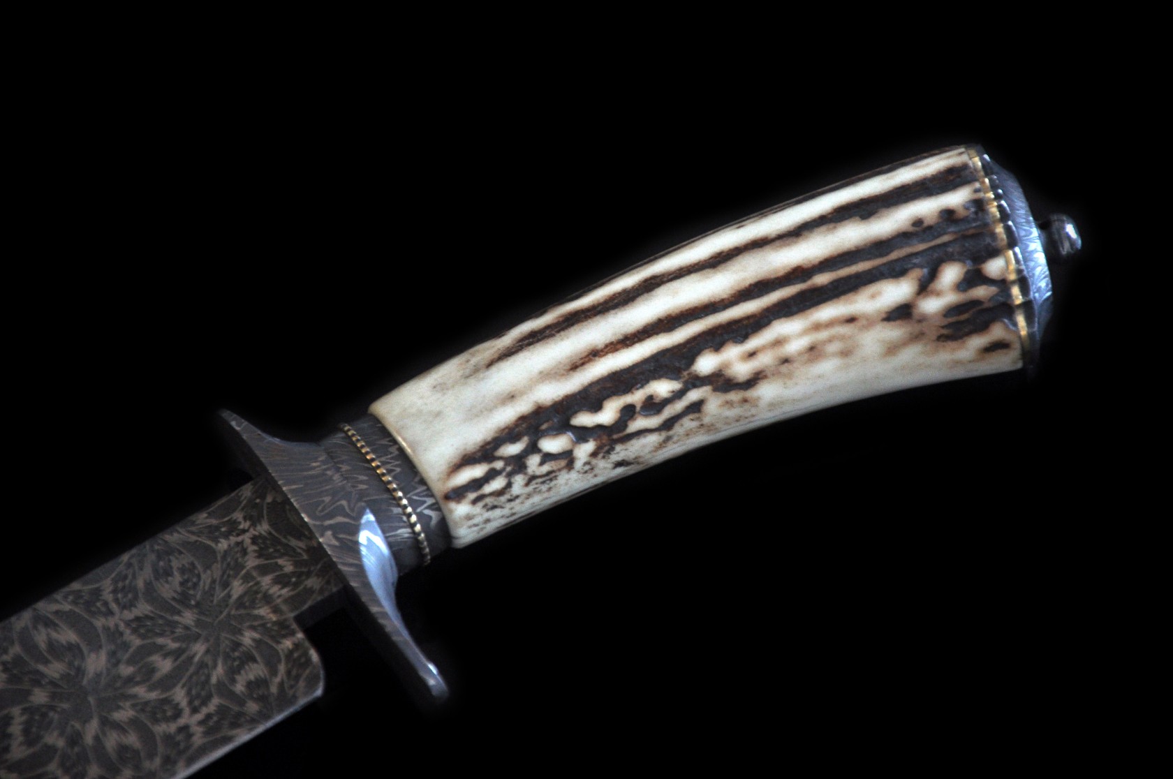 Jimmy Yang 手工定制博伊刀,Yang 拥有十多年年的定制刀具经验,擅长制作美式传统直刀,其中最拿手的便是博伊刀制作,曾为中国以及欧美国家刀具经销商OEM定制刀具,并且深受好评。此件作品是标准的绅士博伊刀款,刀刃采用瑞典15n20+O1锻打的大马士革钢制作而成,花纹如同四瓣花瓣展开,连贯动感,张力十足,极具美感。护手也采用同等大马士革钢材质。手柄采用水鹿角材质,光滑细腻,握感饱满舒适。精美的锉花尾铁打磨成经典花瓣外形,优雅别致。带有原配的手工定制刀鞘,无论收藏还是使用甚至礼品都是不错的产品。