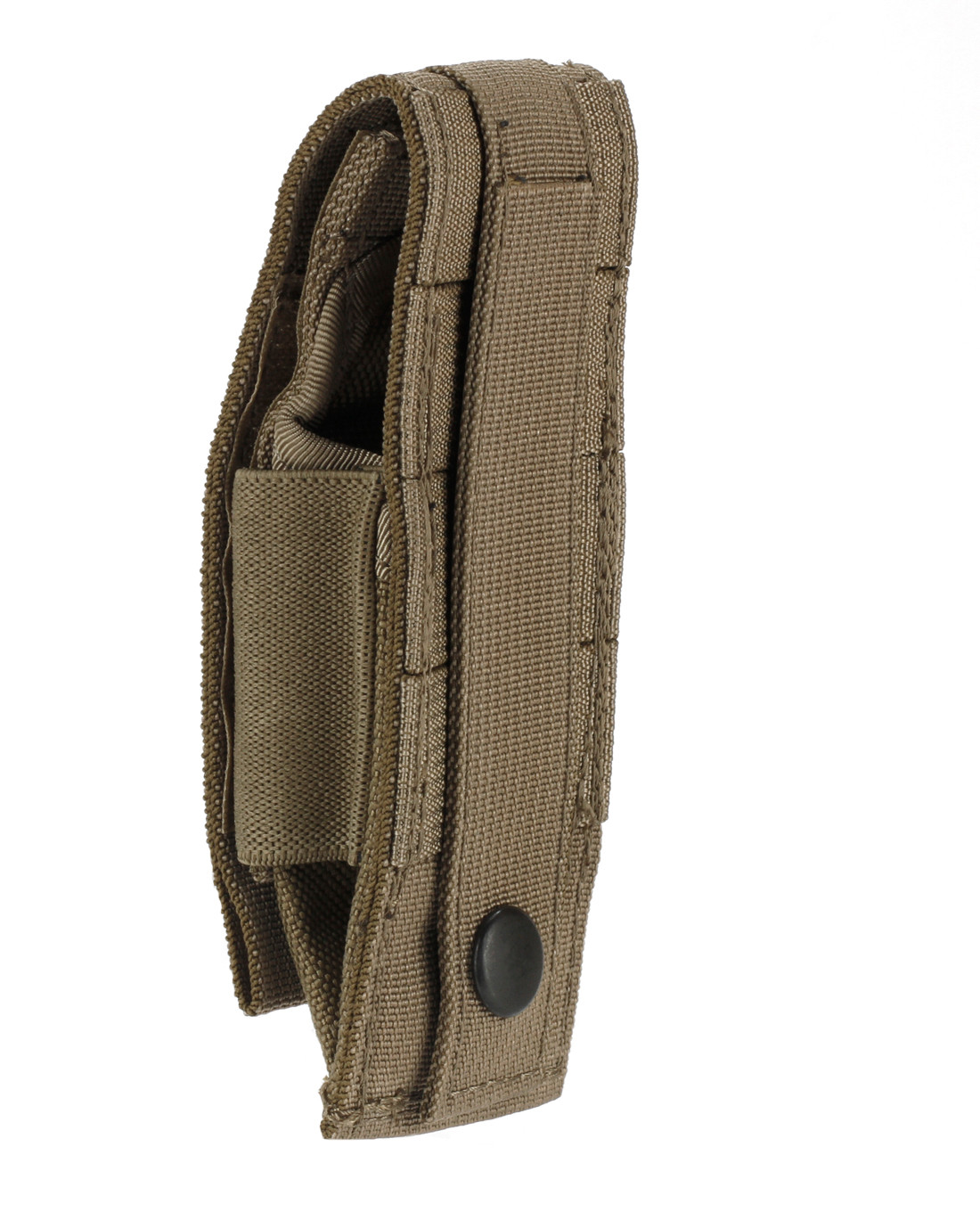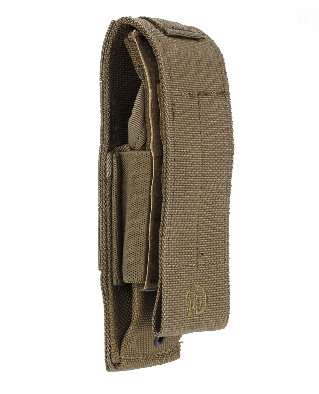 这款大型尼龙MOLLE系统皮套背面配有按扣织带,可用于固定工具。固定织带可收纳MUT配件扳手。皮套正面印有Leatherman标志,采用魔术贴封口,内部面板可存放备用批头。