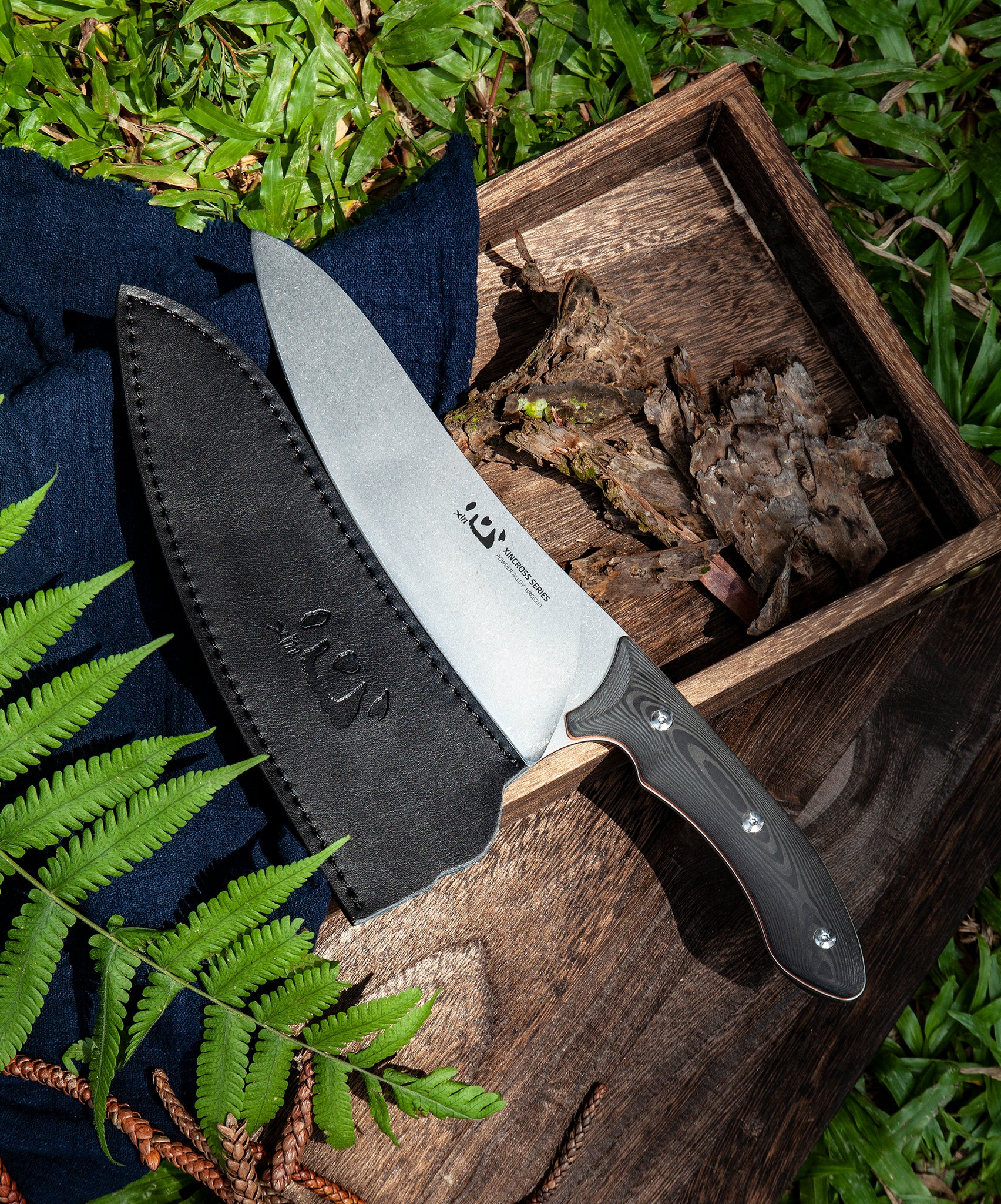 该系列设计融合了厨房刀具和户外刀具。其特点是通过真空油提取下特殊粉末合金,硬度高达HRC62±1。 手柄采用两层碳纤维制成,具有更强的耐腐蚀性能,表面更光滑,重量更轻,耐用性也更高。人体工学设计提供了舒适的切割体验,看起来超级酷! (包装内附带黑色皮革护套)