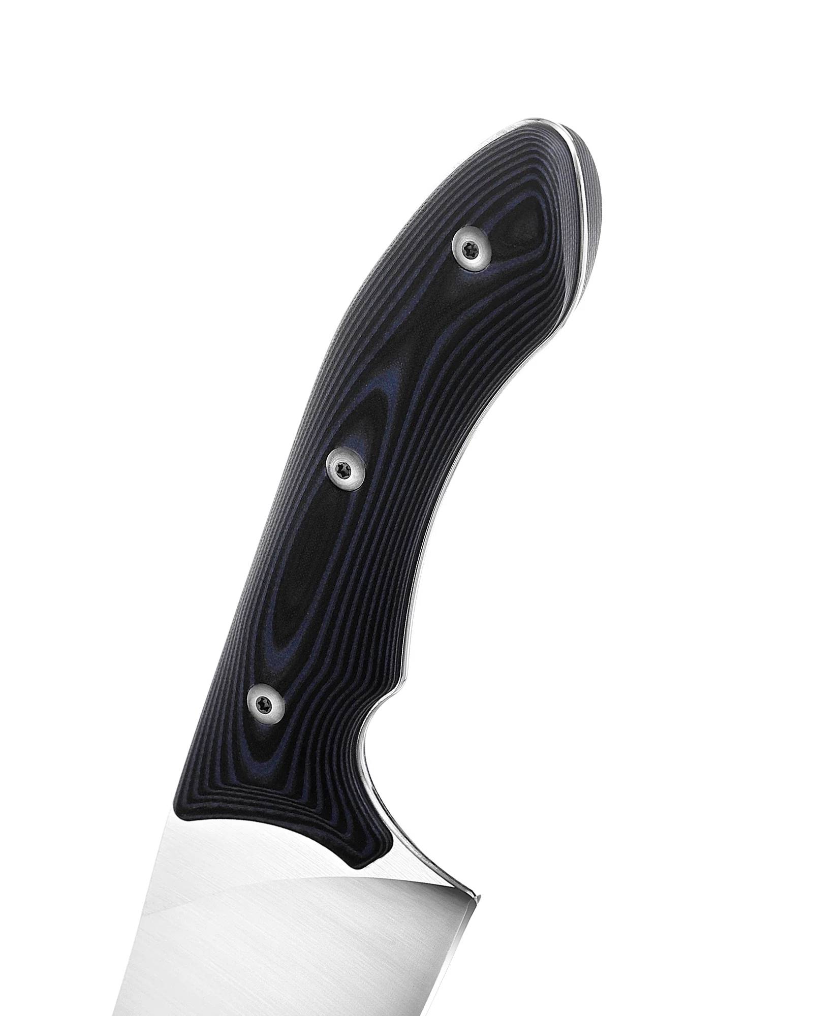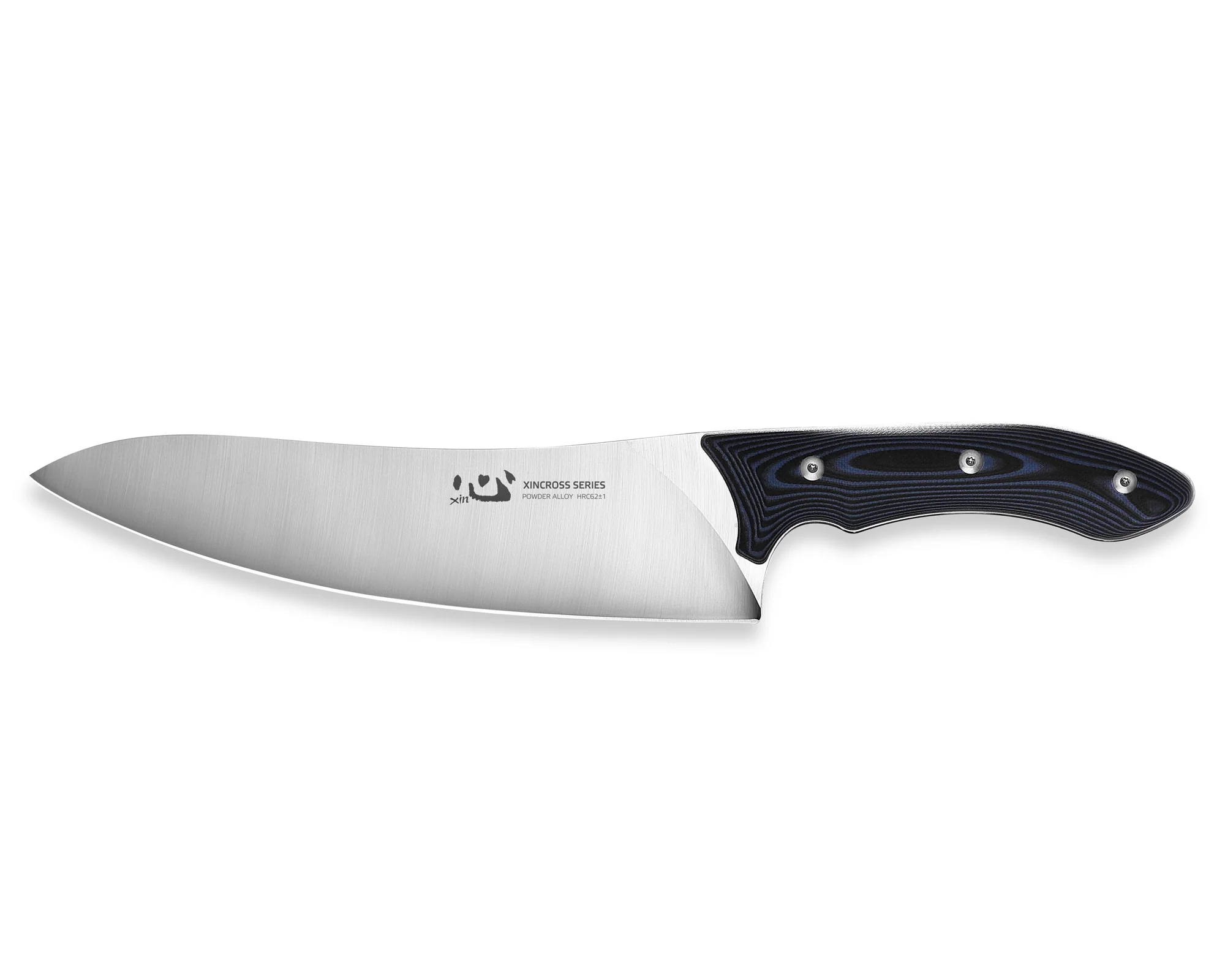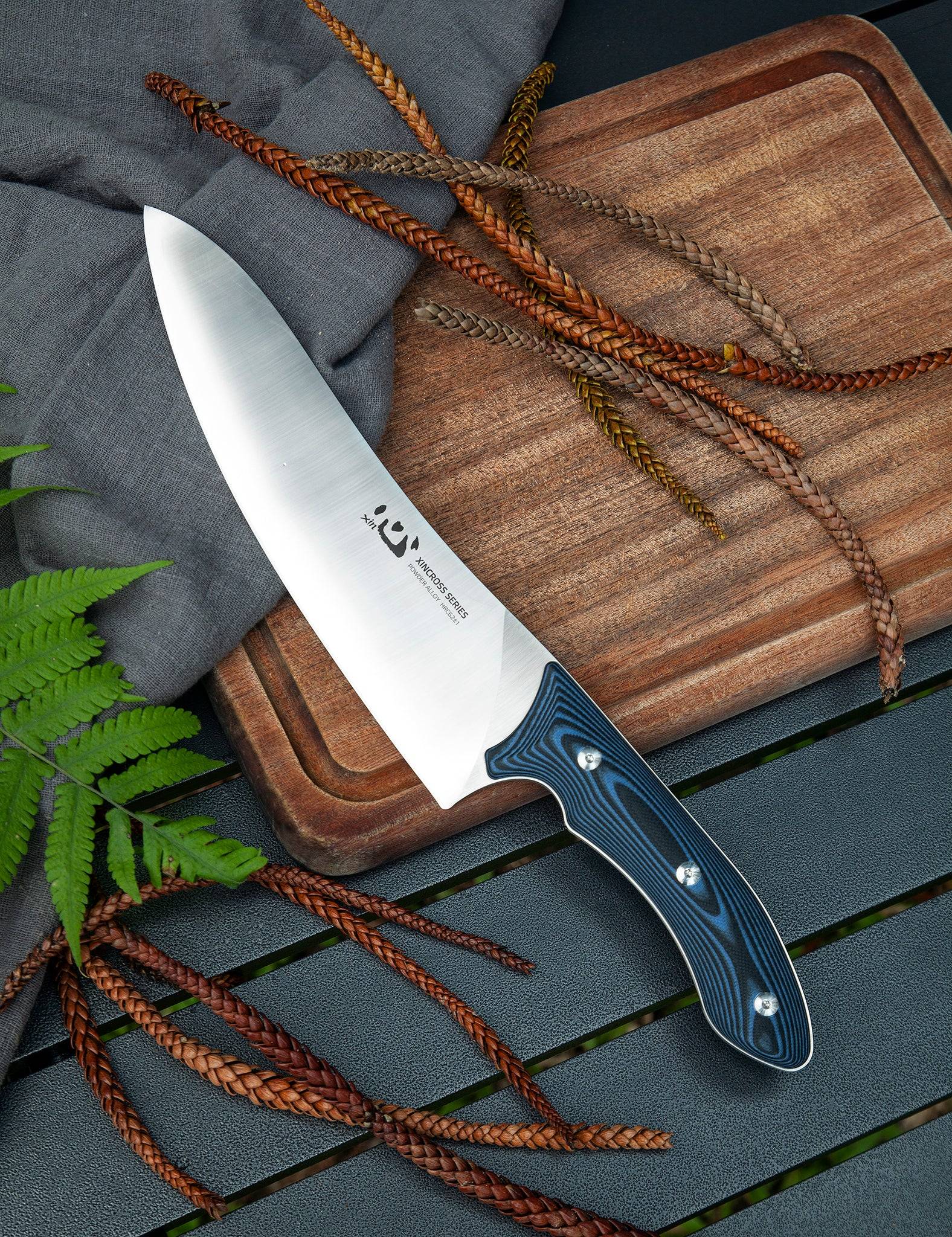 刀具类型:战术风格 厨师刀 刃长度:210毫米(8英寸) 刀片材质:特殊粉末合金钢 手柄材质:G10 手柄长度:140毫米 全长:362毫米 刀片厚度:2.4毫米 刃口类型:平刃 刀刃表面:机器缎 面 硬度:62+/-1 净重:242克 起飞重量:529克 产地:中国 型号:XC112(黑蓝色)