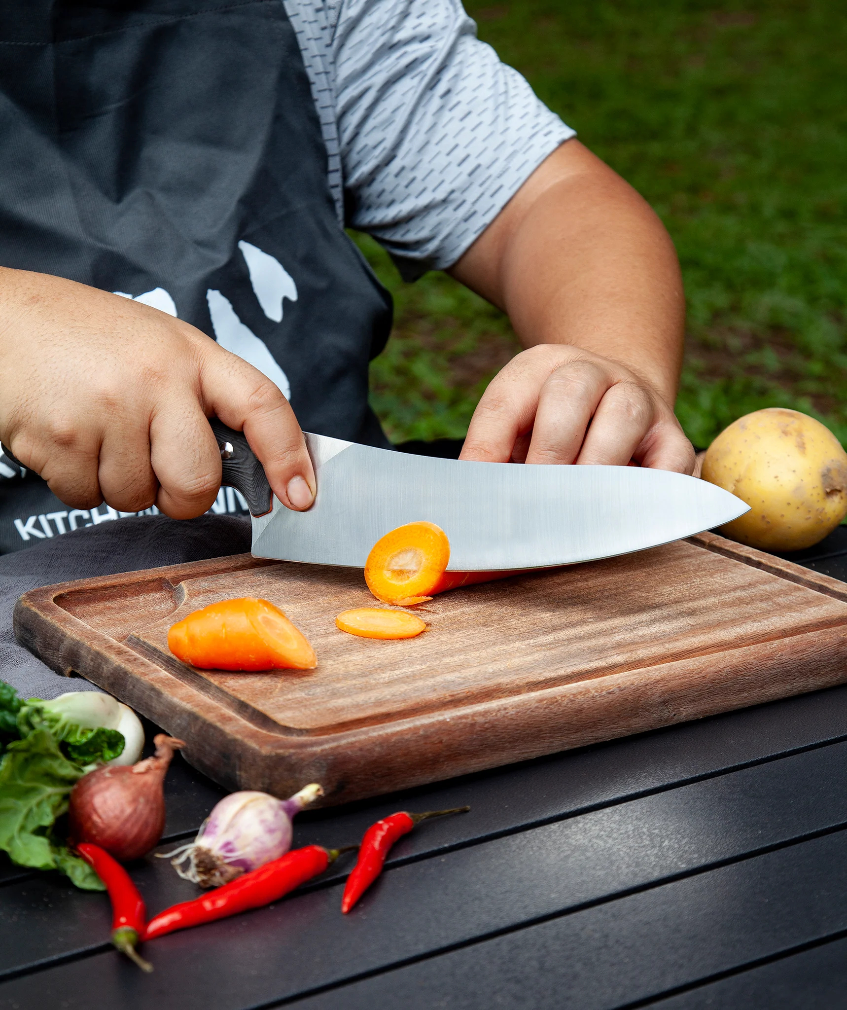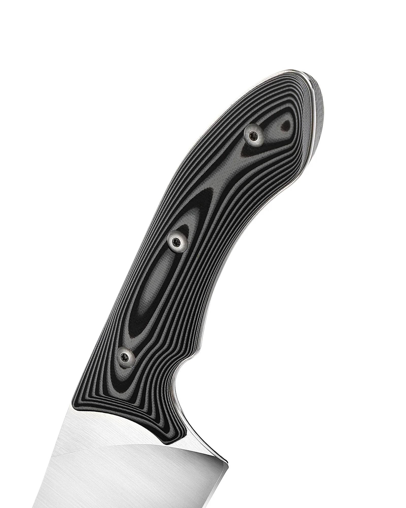 刀类型:战术式厨师刀 刀片长度:210mm(8英寸) 刀片材质:特殊粉末合金钢 手柄材质:G10 手柄长度:140mm 总长度:362mm 刀片厚度:2.4mm 边缘类型:扁平 刀片表面处理:机器 缎面硬度:62+/-1 净重:242g 毛重:529g 产地:中国 型号:XC110(黑白)